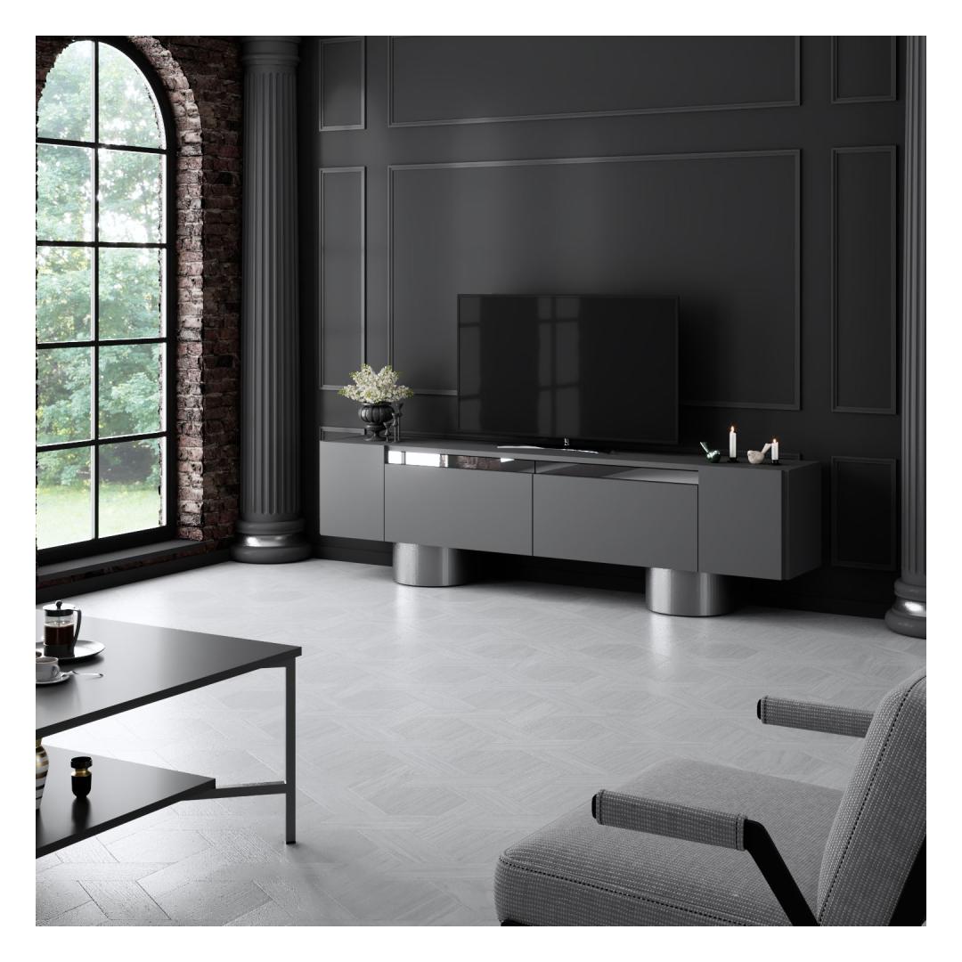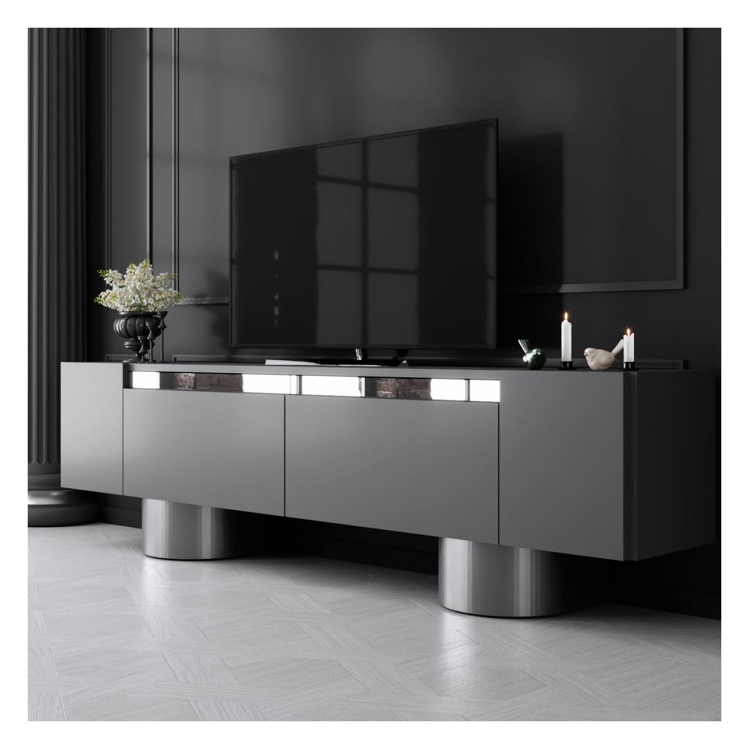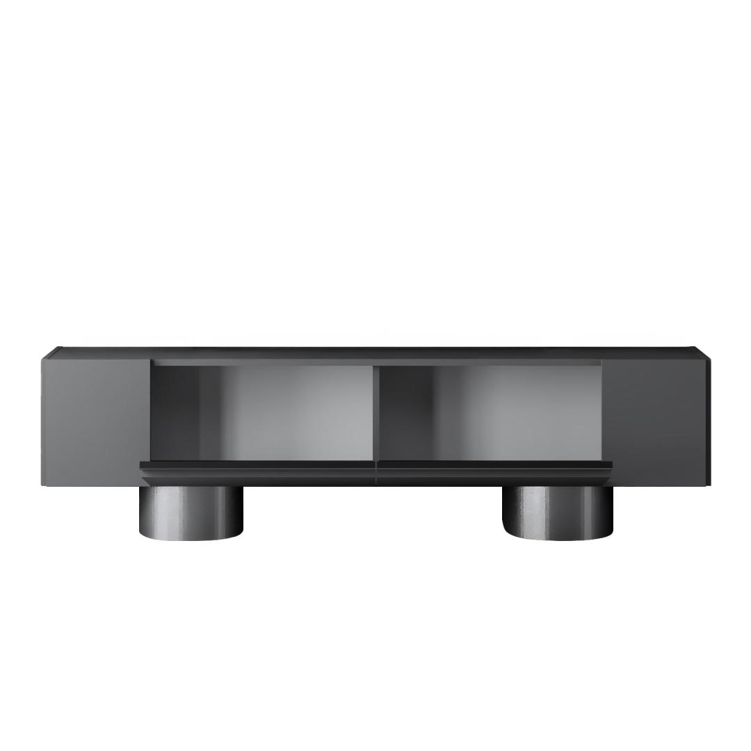 Transform your living room into a stylish and modern space with our sleek TV stand. Made from 100% melamine coated particle board, this stand is not only durable but also incredibly chic. The combination of Anthracite and Silver colors adds a touch of sophistication to any room, making it the perfect addition to your home decor.