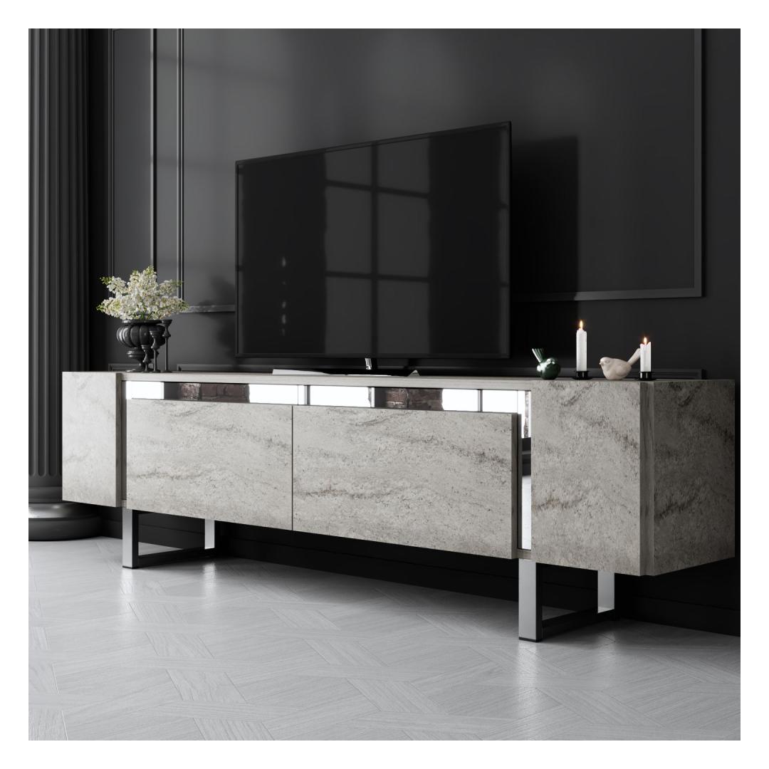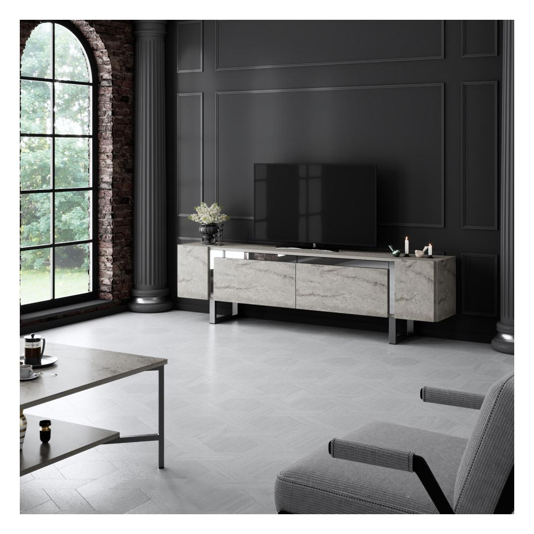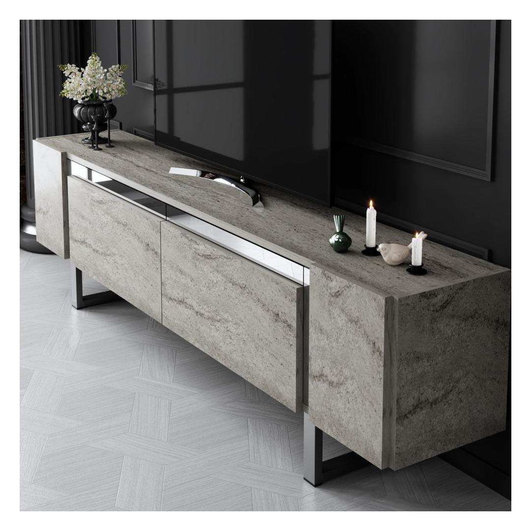 Transform your living room into a stylish and modern space with our sleek TV stand. This TV stand is not just a piece of furniture, it's a statement of your sophisticated taste and attention to detail. The combination of Travertine and Silver colors adds a touch of elegance to any room, making it the perfect addition to your home decor.