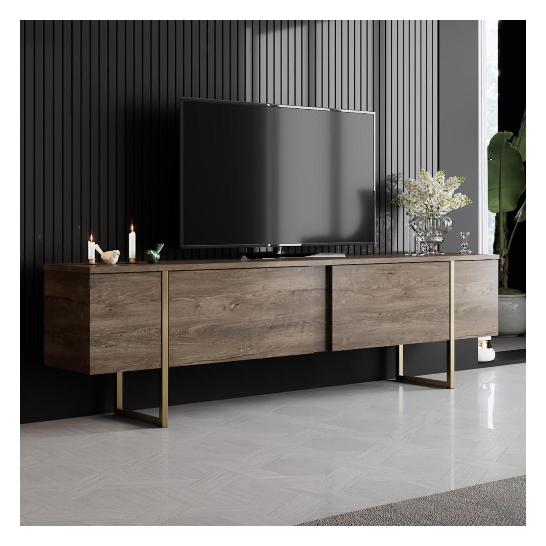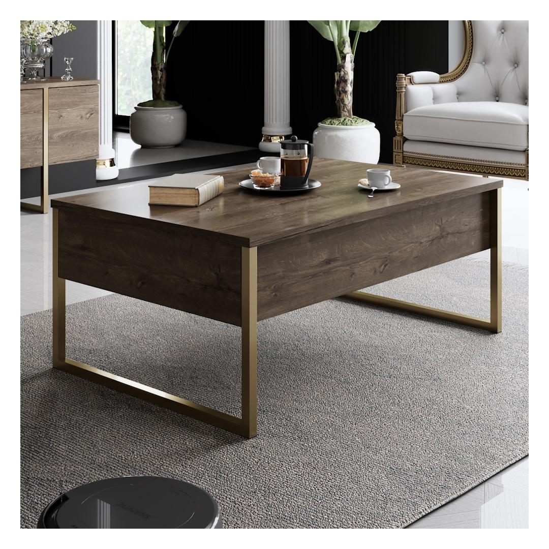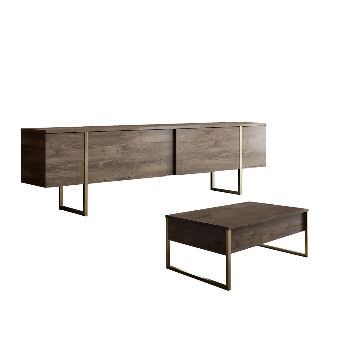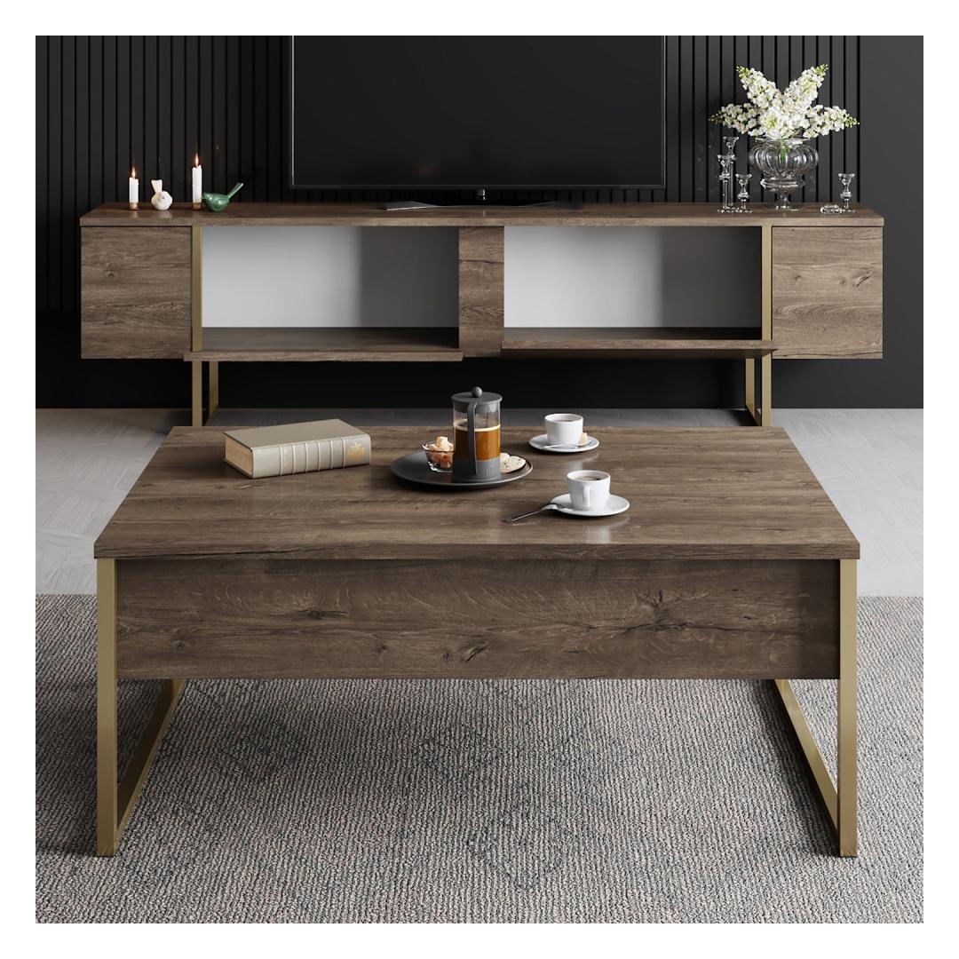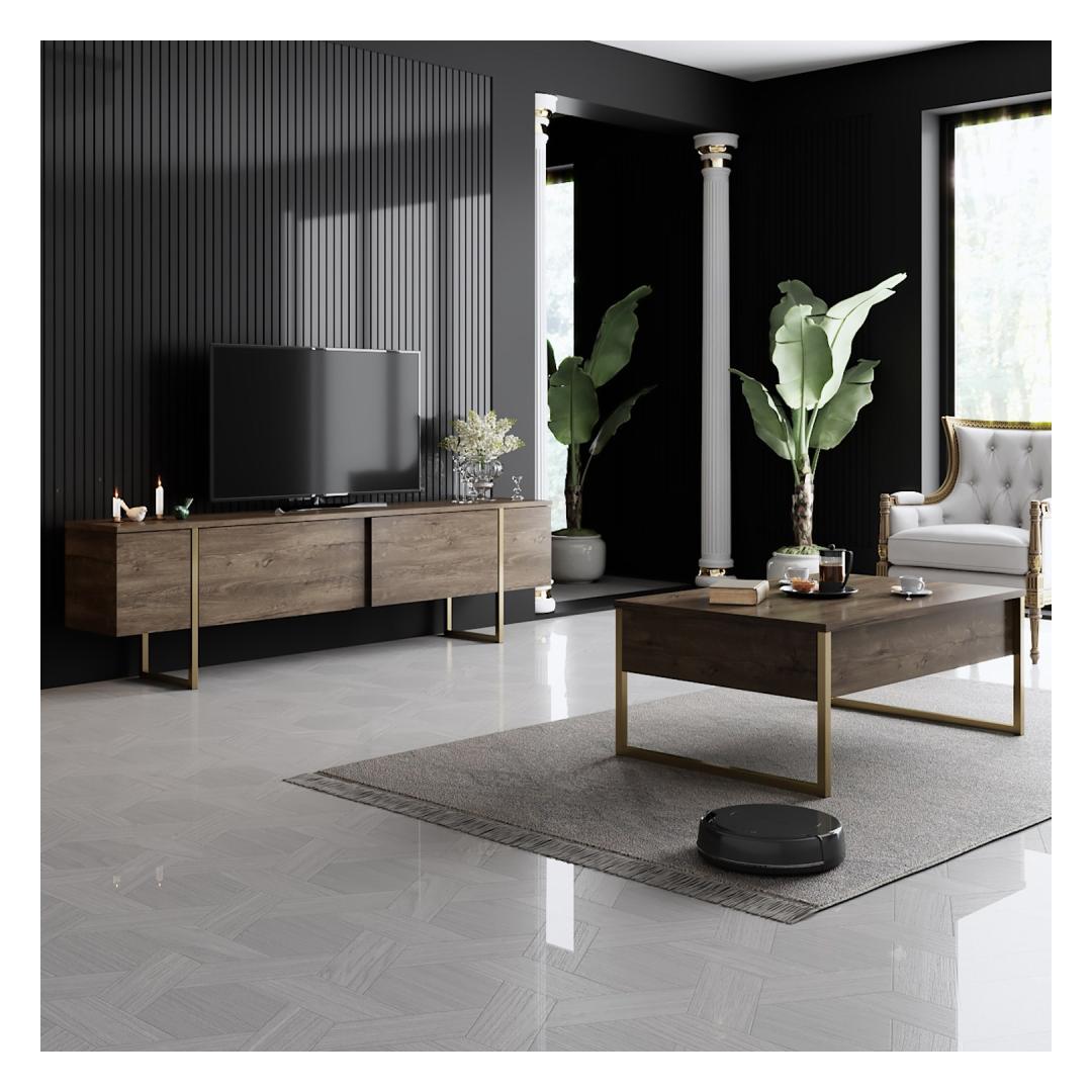The combination of Walnut and Gold colors adds a touch of opulence to your living room, creating a warm and inviting atmosphere for you and your guests to enjoy. The sleek design of the TV stand and coffee table will instantly upgrade the look of your space, making it the focal point of any room.