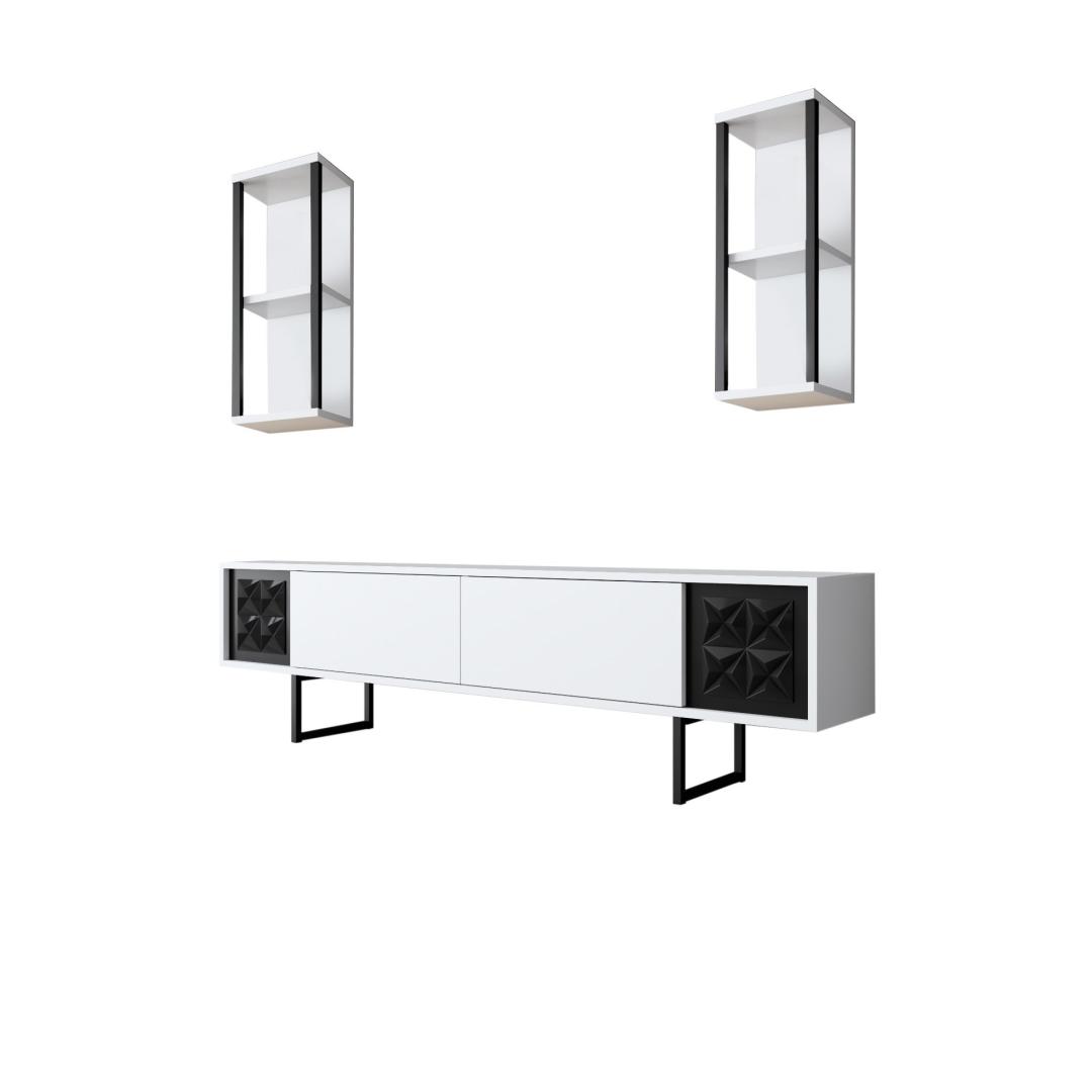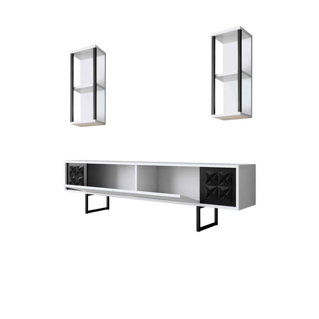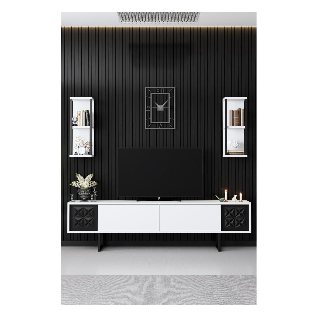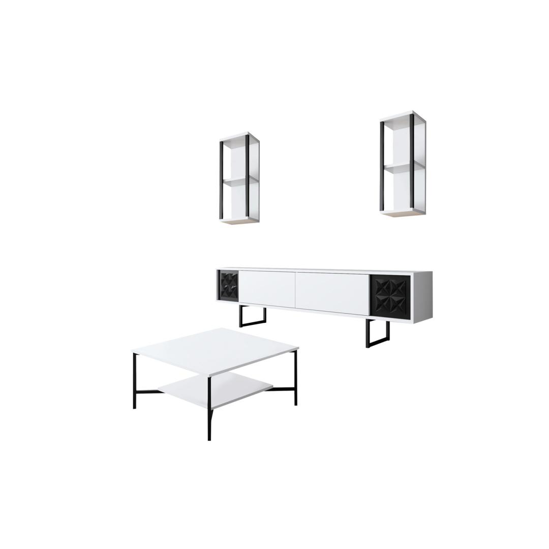 The TV stand, with its ample storage space, allows you to neatly organize your media devices and accessories. The wall shelves offer a perfect spot to display your favorite decorative items, adding a personal touch to your living room. The coffee table provides a convenient surface for drinks, snacks, and magazines, making it an essential addition to your space.