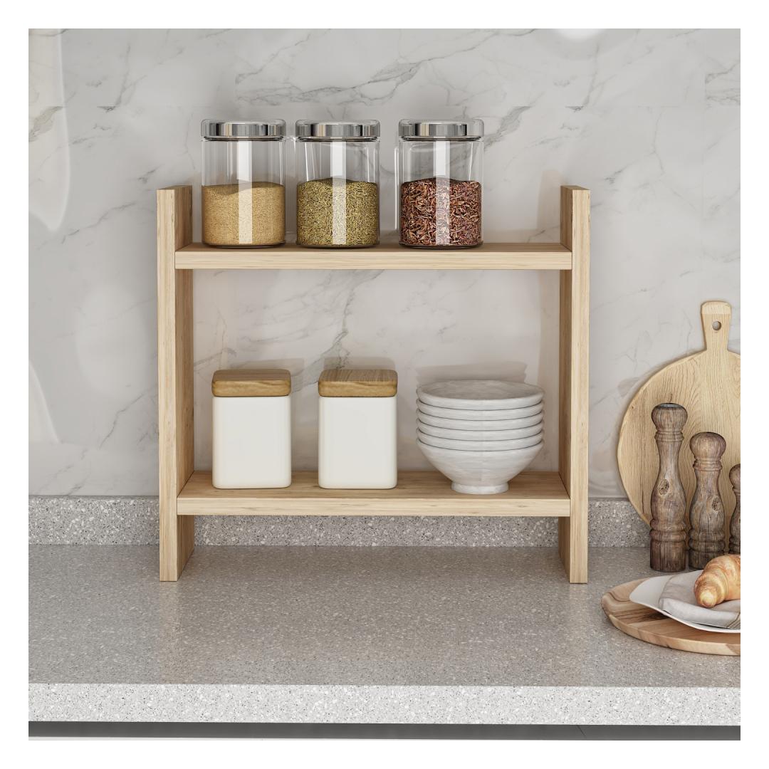 With its sleek design and warm Atlantic Pine color, this shelf will instantly elevate the look of your kitchen. Say goodbye to clutter and hello to a beautifully organized space that you'll love spending time in.
