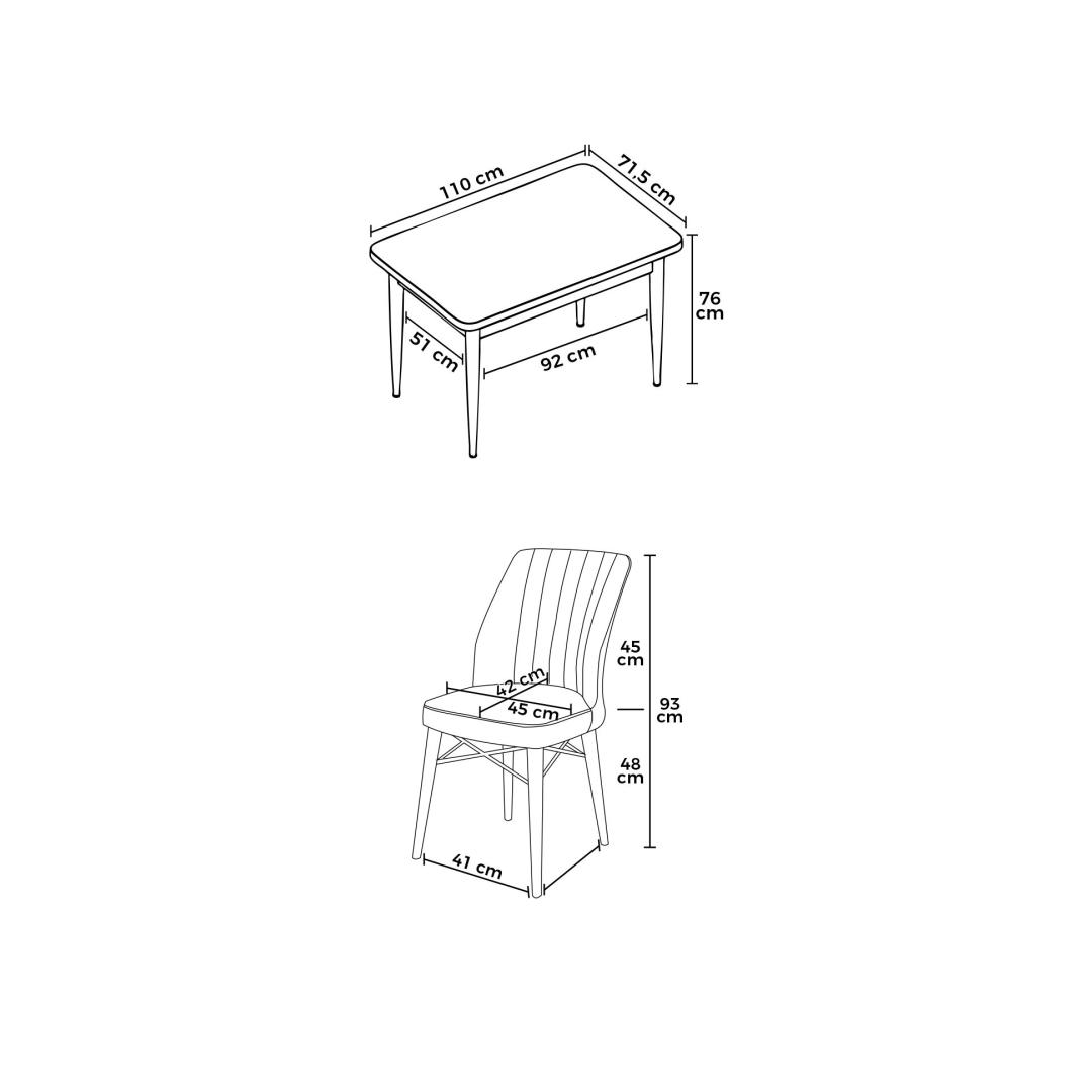 The dining table measures 110 cm in width, 76 cm in height, and 71 cm in depth, providing ample space for your family and guests to gather around. The chairs are designed with a width of 45 cm, height of 90 cm, and depth of 42 cm, with a comfortable seat height of 46 cm. The 22 DNS foam for the back and 28 DNS foam for sitting ensure maximum comfort during long meals and conversations.