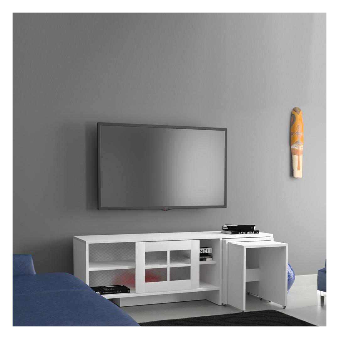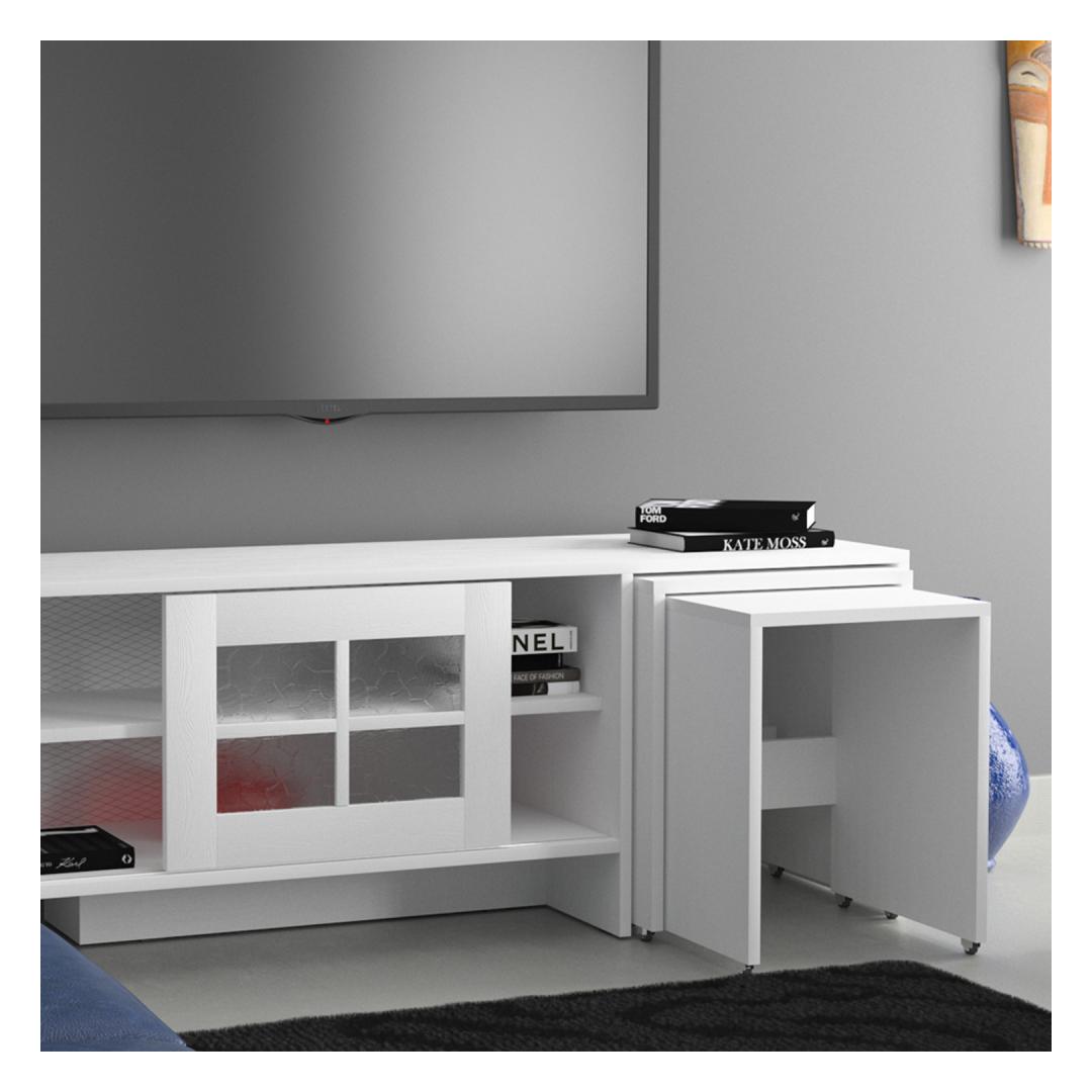 Featuring a spacious TV unit with dimensions of 150cm (W) x 54cm (H) x 42cm (D), this stand provides ample space to accommodate your television and other media essentials. The additional nesting tables, measuring 42cm and 38cm, offer convenient storage options for your remotes, magazines, and more.