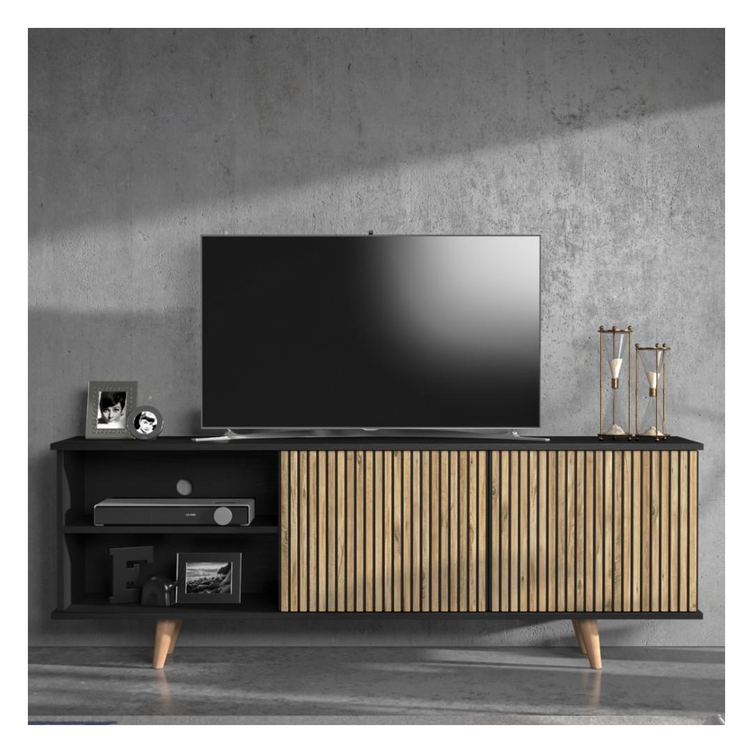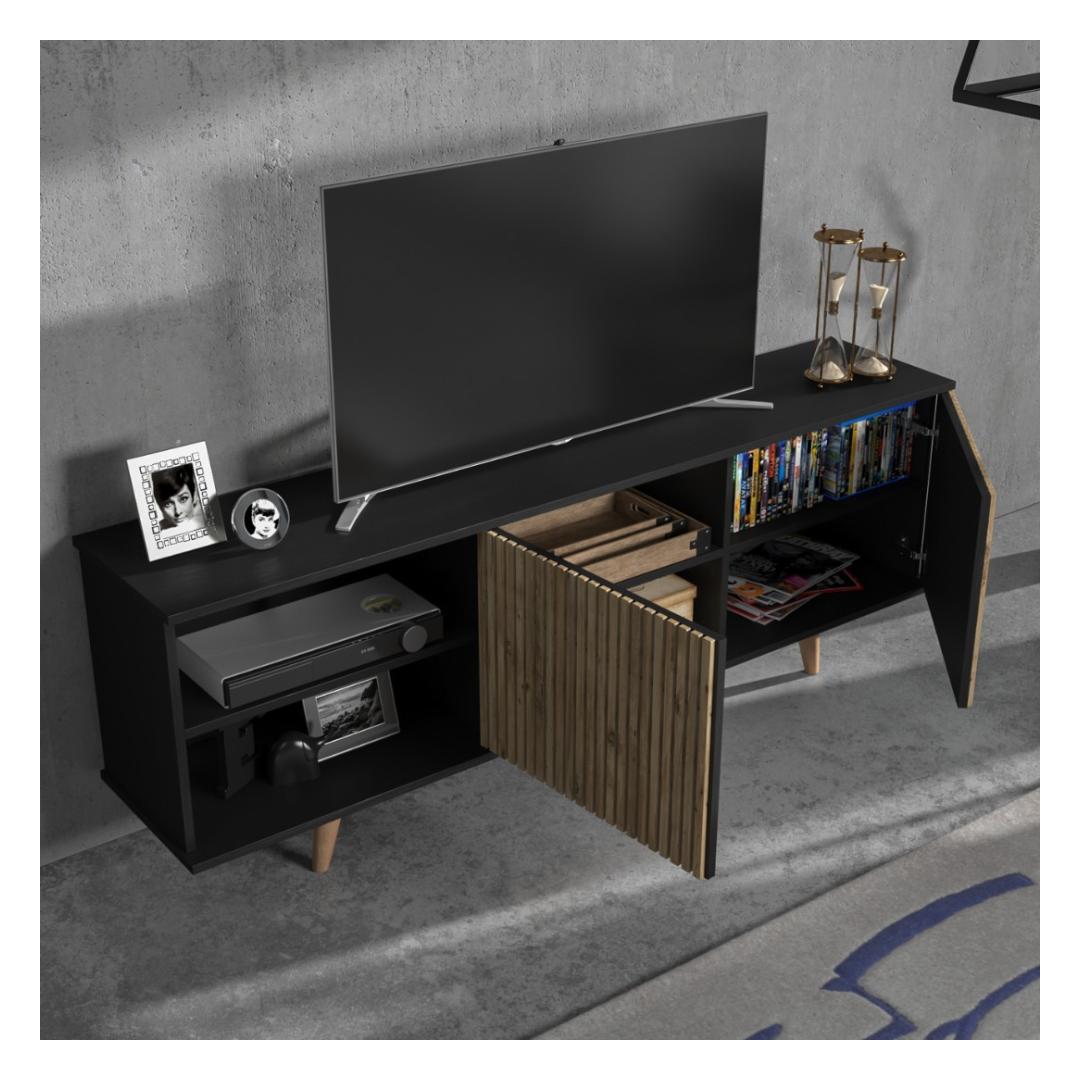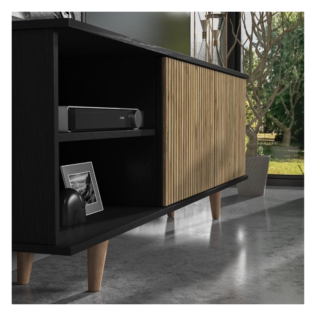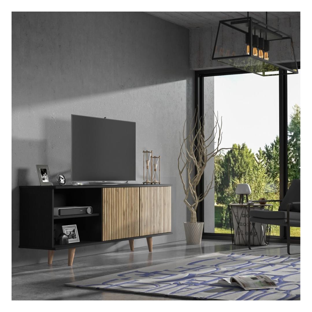 Transform your living room with our stunning TV stand, crafted from 100% chipboard for durability and style. The sleek design features a mix of wooden and black and Atlantic Pine colors, adding a touch of elegance to any space.