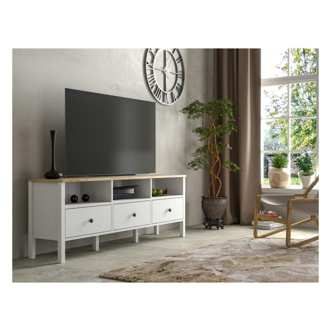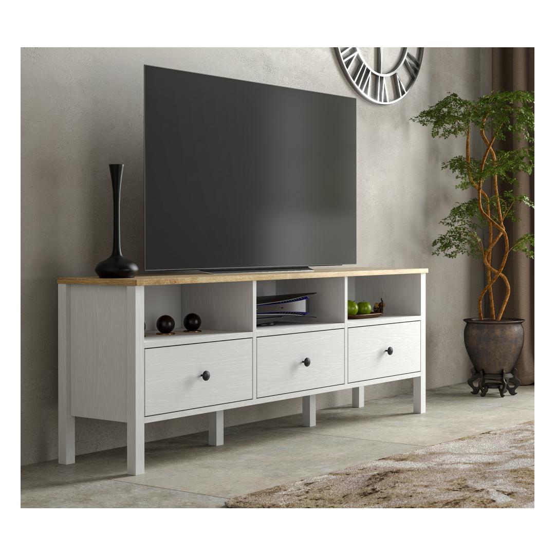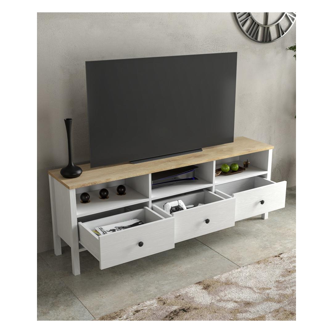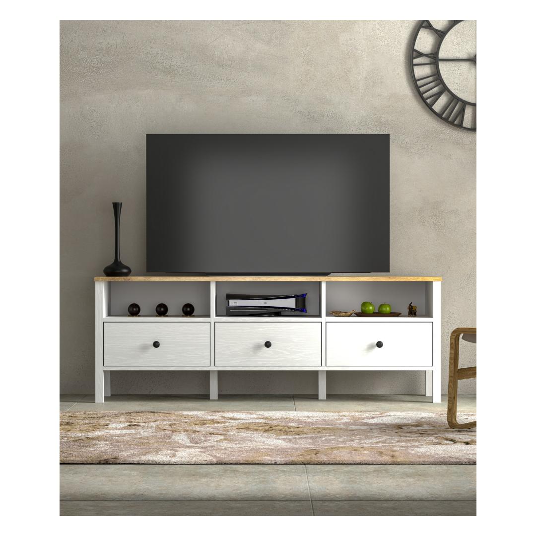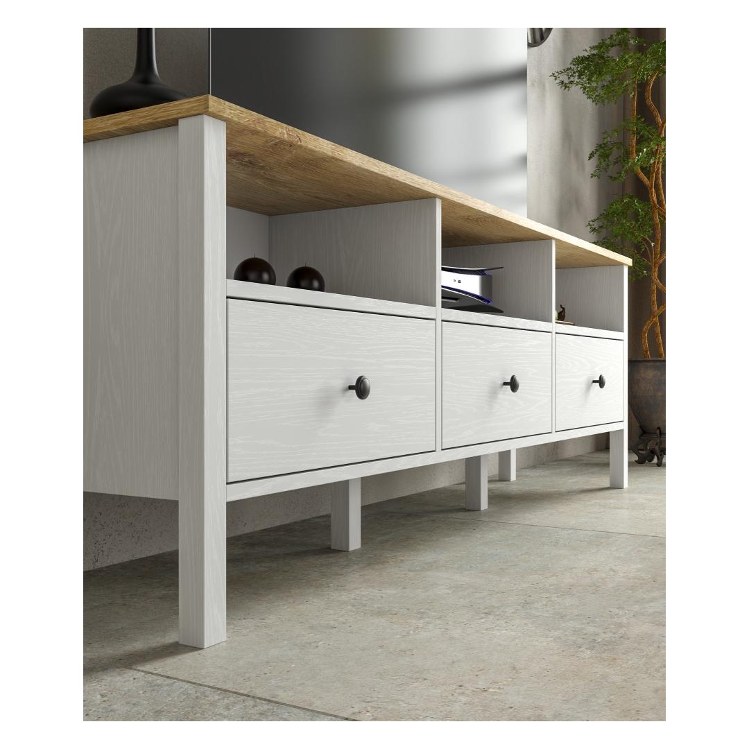 With a sleek design featuring MDF profile legs and metal handles, this TV stand is the perfect blend of style and functionality. The wooden and white color combination adds a contemporary touch to any room.