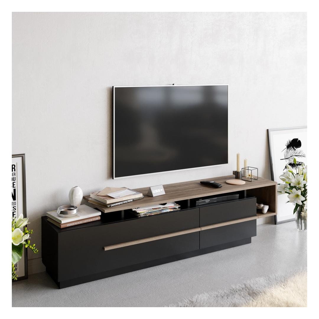 The TV stand features a unique combination of black and walnut colors, creating a striking contrast that adds a touch of sophistication to any room. The solid color concept and modern design make this stand a true novelty in the world of furniture.