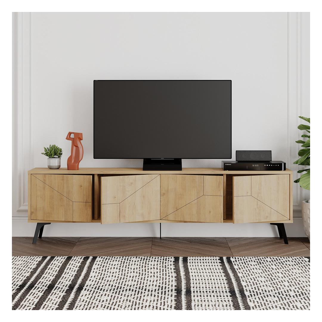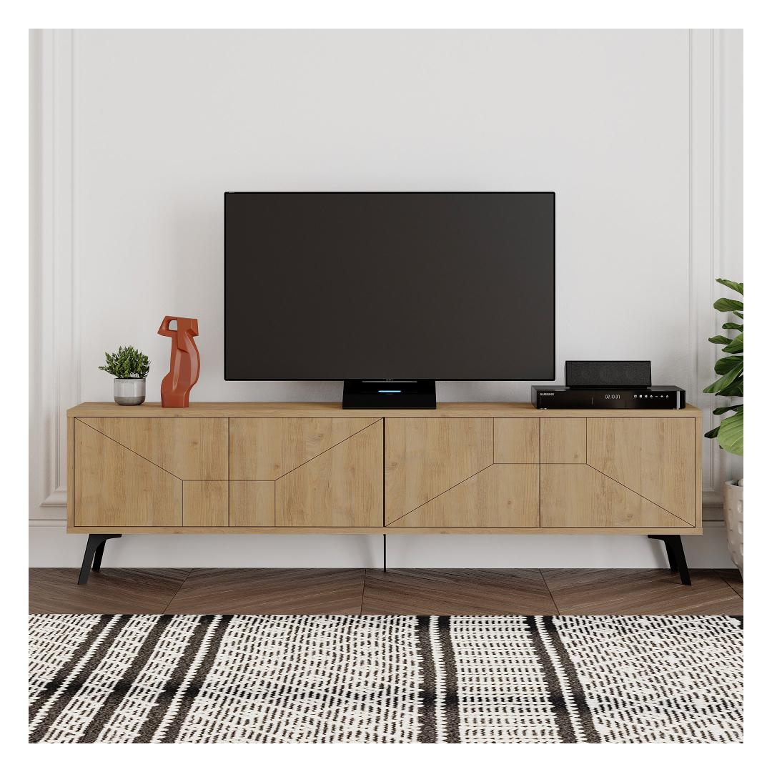 Transform your living space into a contemporary oasis with our TV stand. The sleek design and Oak color will effortlessly complement any decor, while the metal legs add an industrial touch.