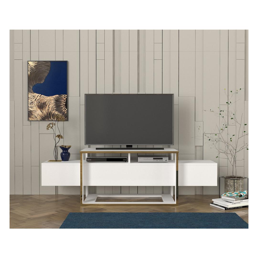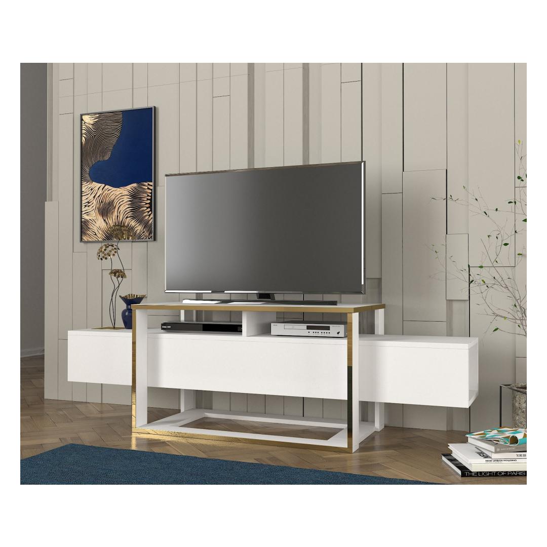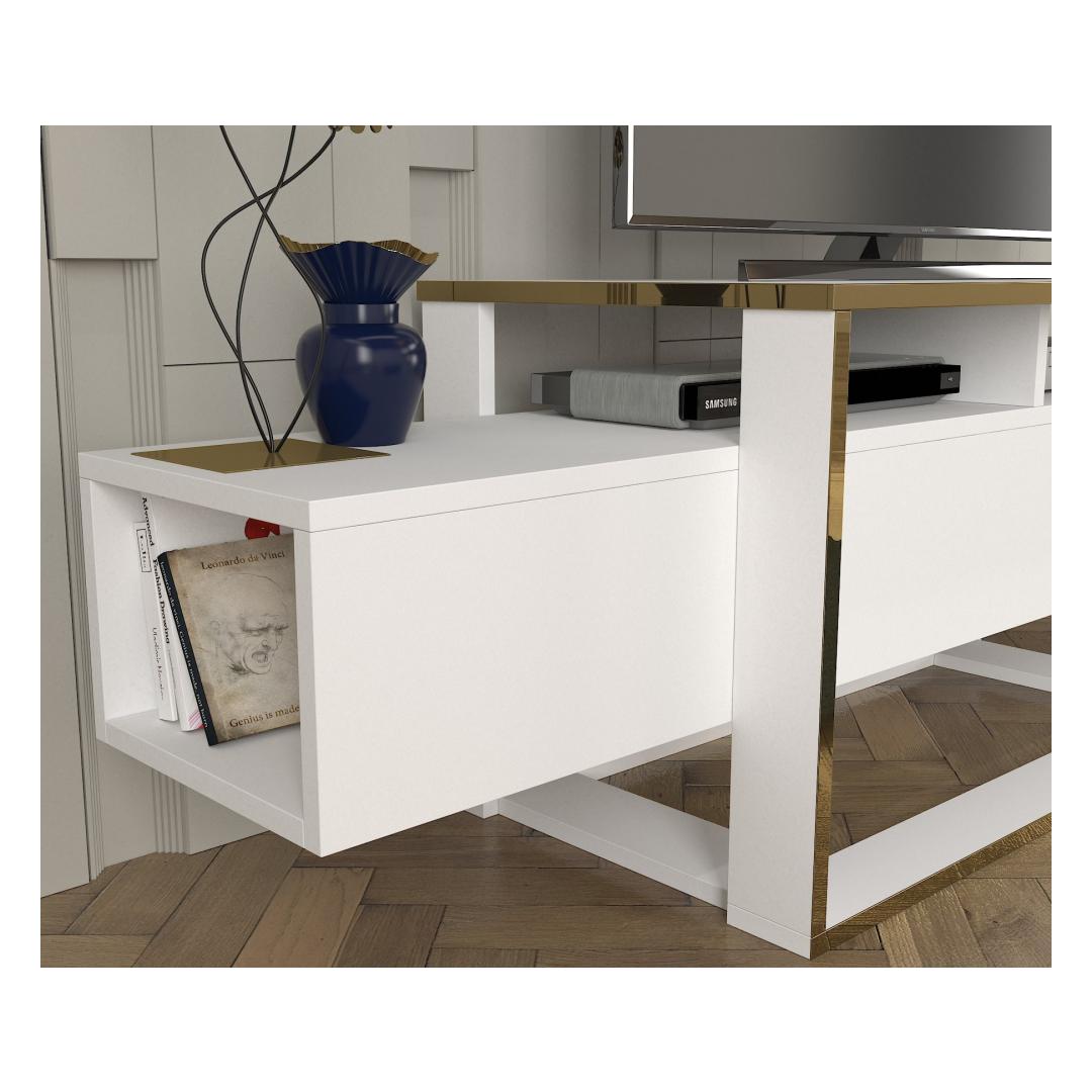 Transform your living room into a stylish and functional space with our stunning TV stand. Made from 100% melamine coated particle board, this TV stand is not only durable but also incredibly sleek and modern. The combination of white and gold colors adds a touch of elegance to any room, making it the perfect addition to your home decor.