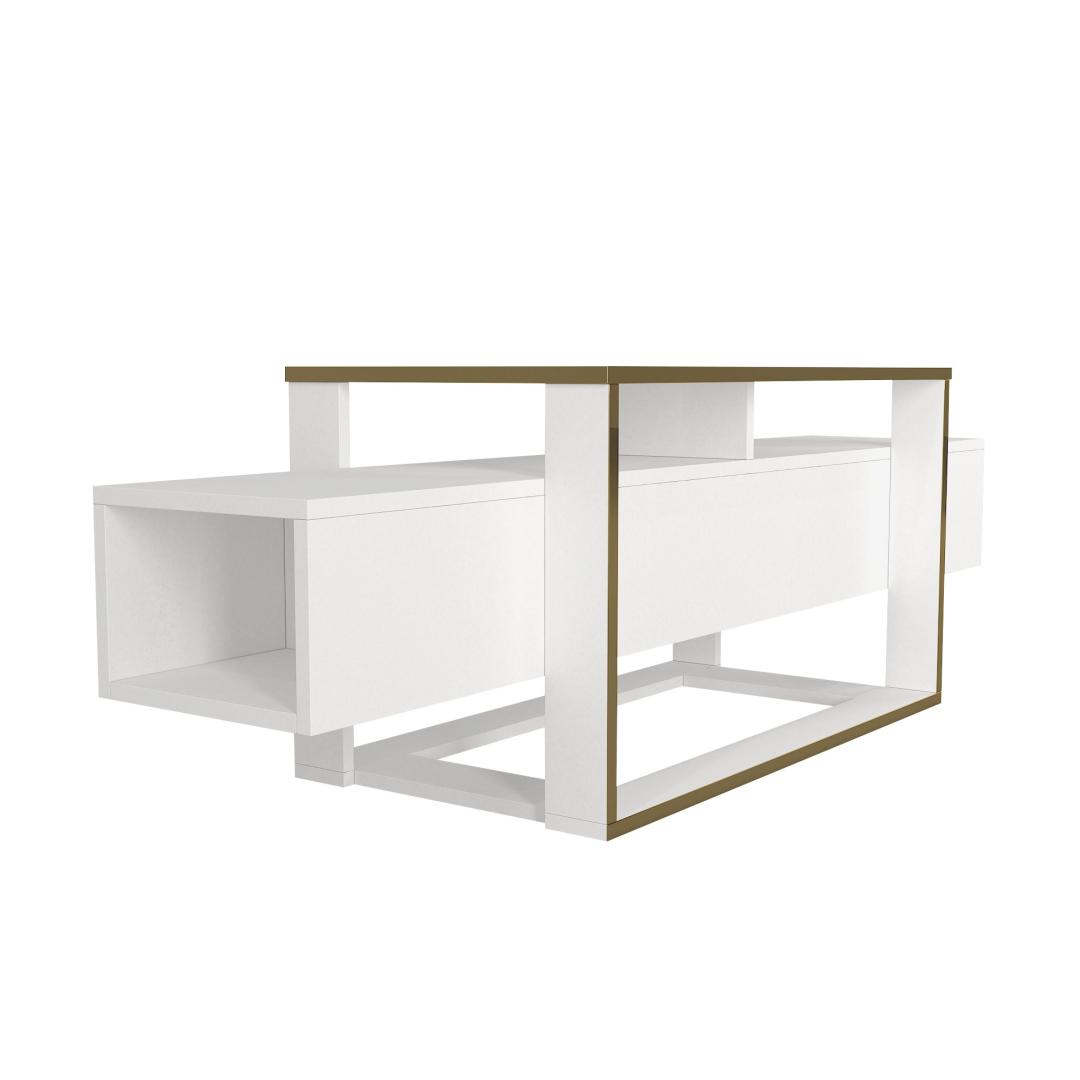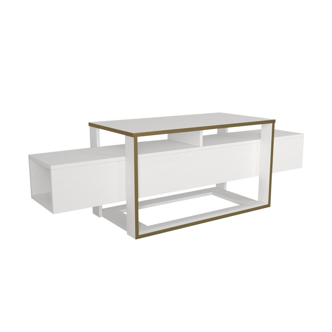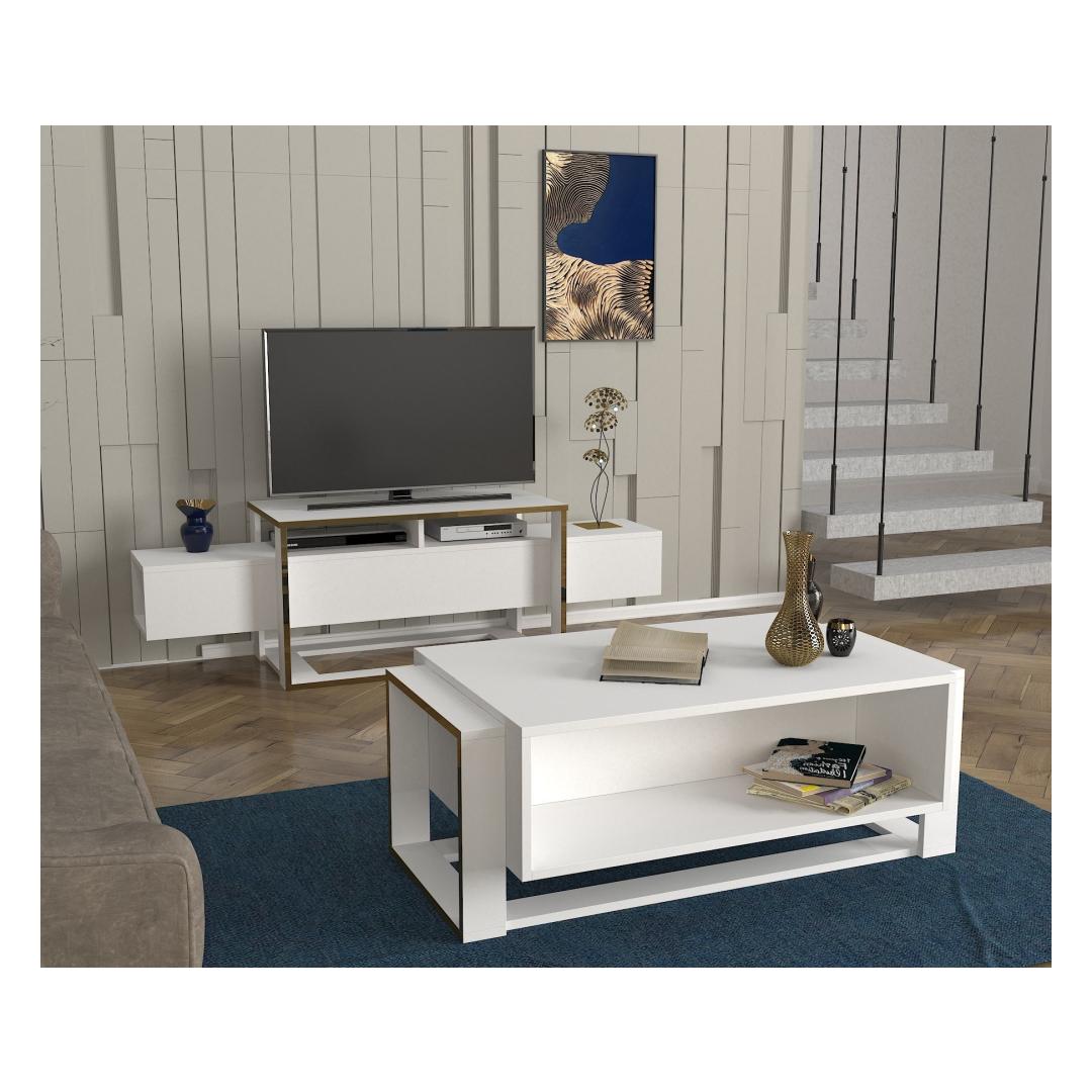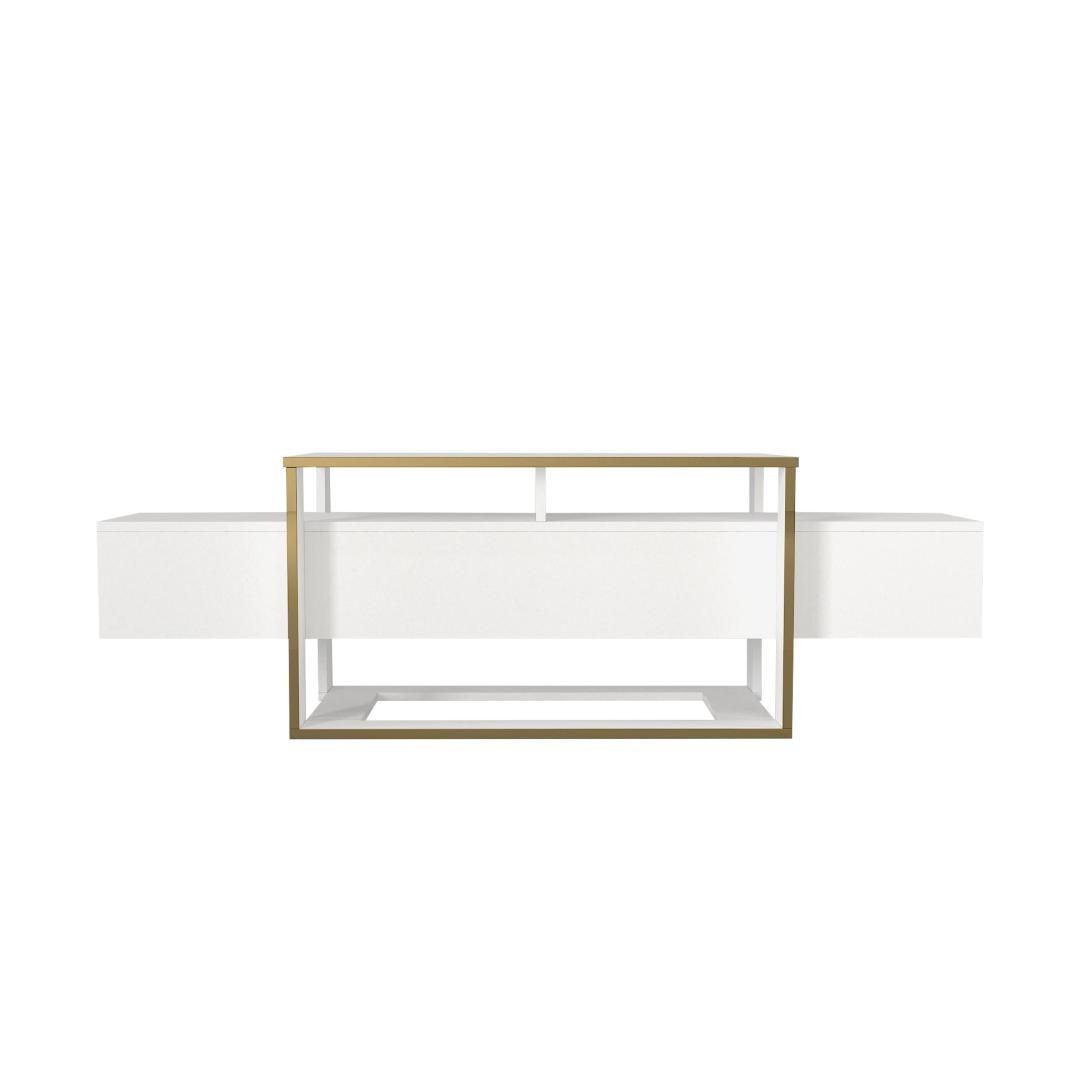 Transform your living room into a stylish and functional space with our stunning TV stand. Made from 100% melamine coated particle board, this TV stand is not only durable but also incredibly sleek and modern. The combination of white and gold colors adds a touch of elegance to any room, making it the perfect addition to your home decor.