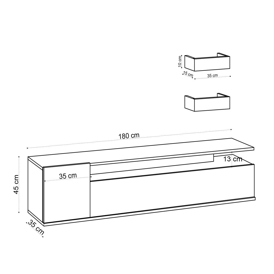 Included with the TV unit are two wall shelves, measuring 35 cm in width, 10 cm in height, and 15 cm in depth. These shelves can be easily fixed to the wall, allowing you to showcase your favorite books, photos, or collectibles. They add an extra touch of style and functionality to your living space.