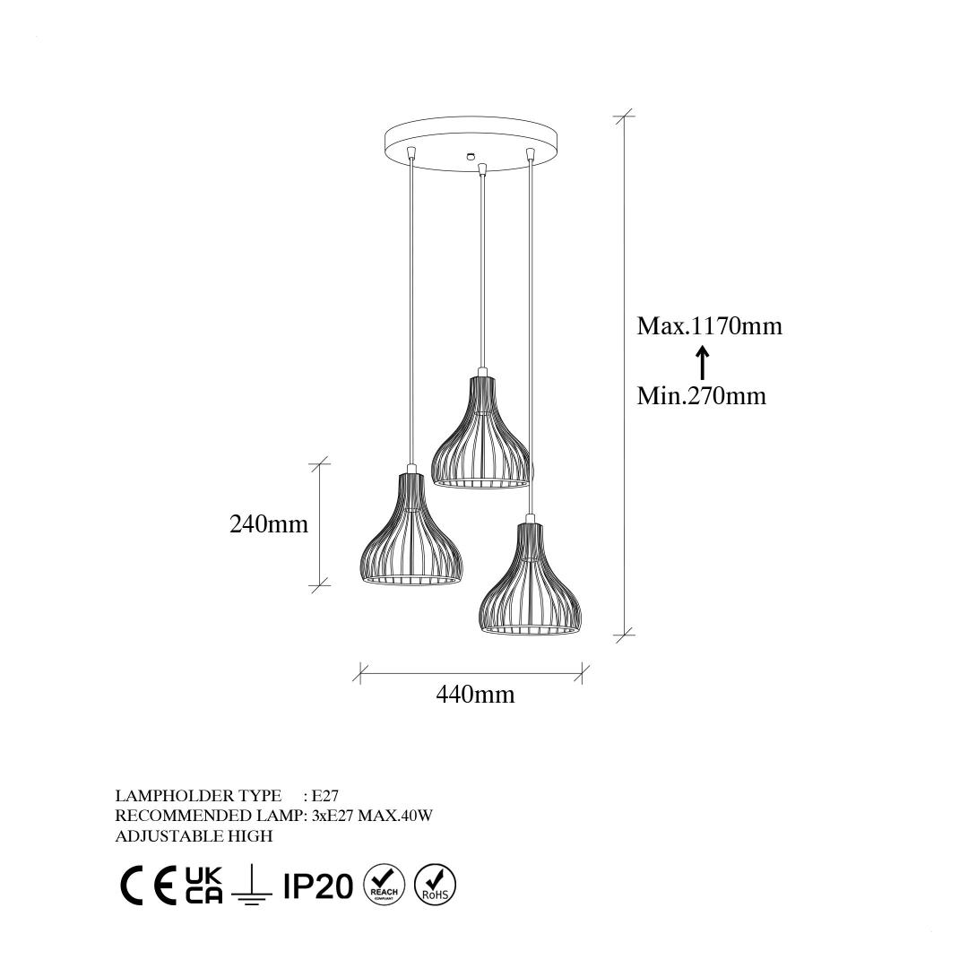 • Socket Type: 3 x E27 Max 40W bulbs (not included)