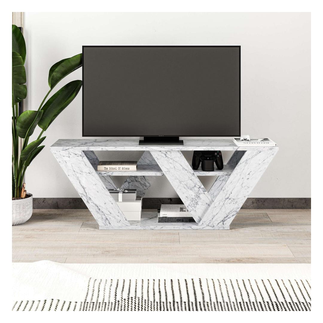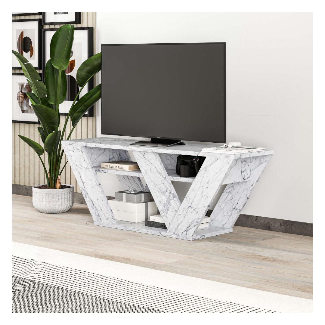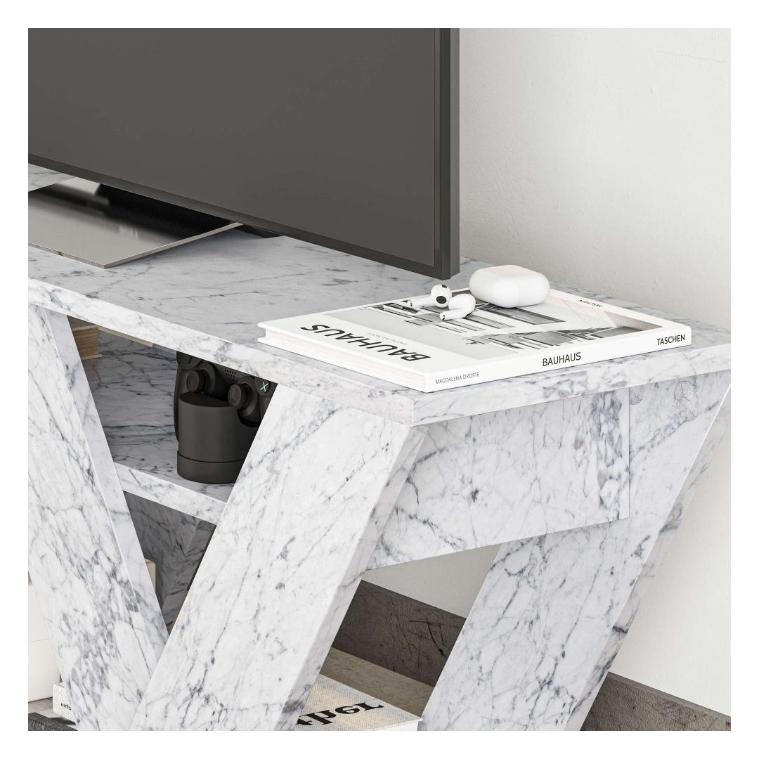 For added security and stability, this TV stand can be fixed to the wall, giving you peace of mind while adding a touch of sophistication to your living space. The Carrara Marble color adds a touch of elegance and luxury, making it a versatile piece that complements any decor style.