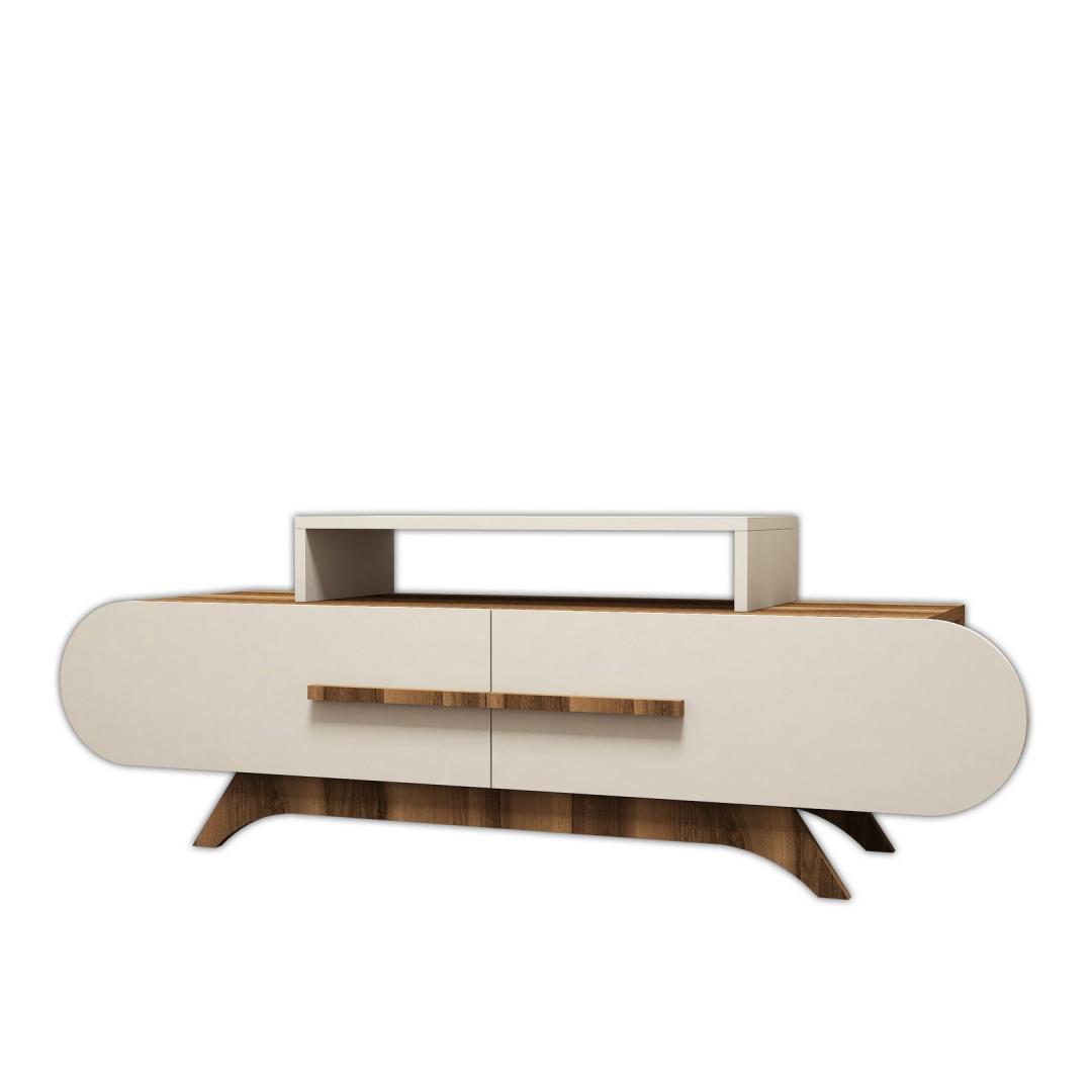 Our TV stand can be easily fixed to the wall, maximizing your floor space and creating a sleek and modern look. Its compact dimensions of 145 cm width, 49.8 cm height, and 36.8 cm depth make it suitable for any room size, while its walnut and cream color combination adds a touch of elegance to your living space.