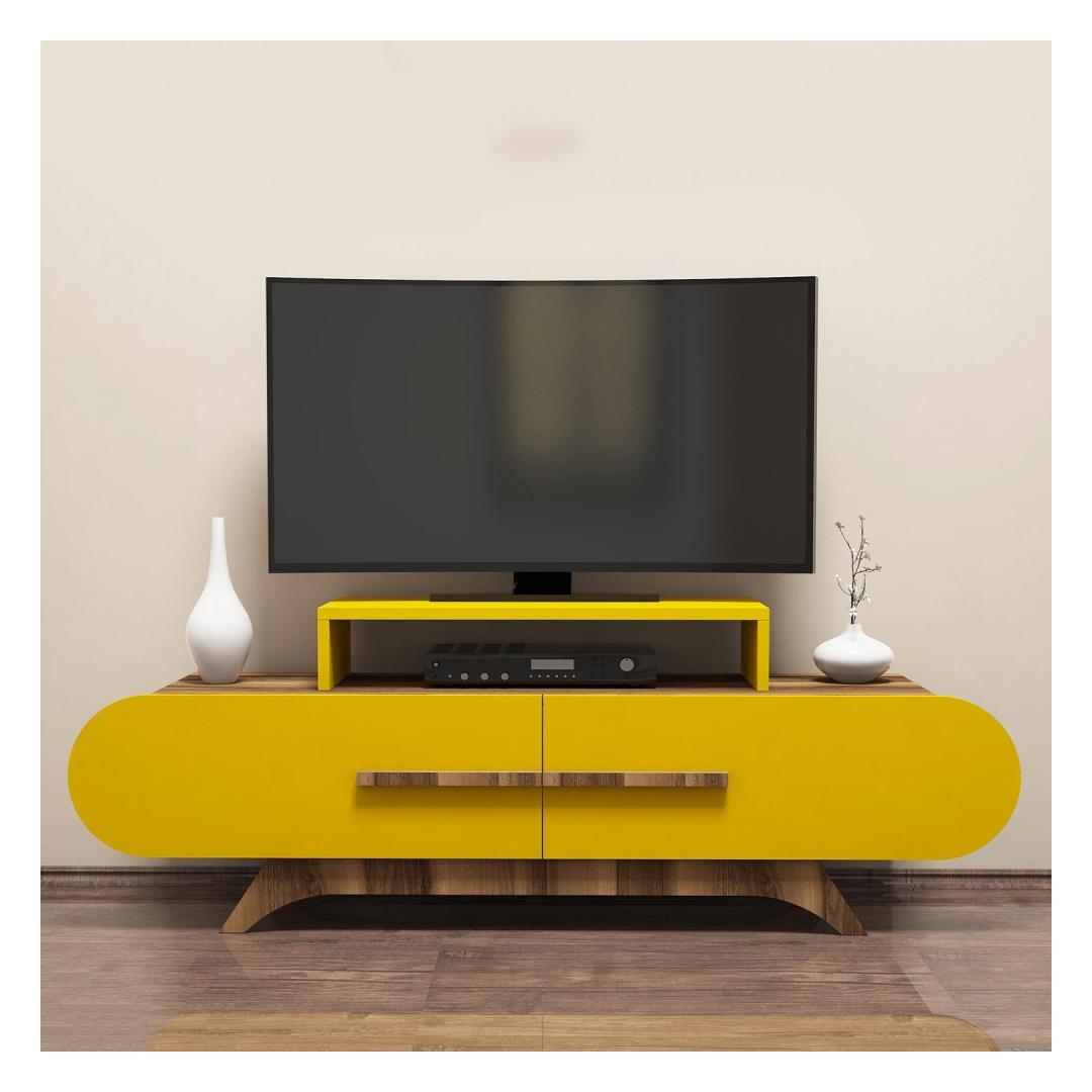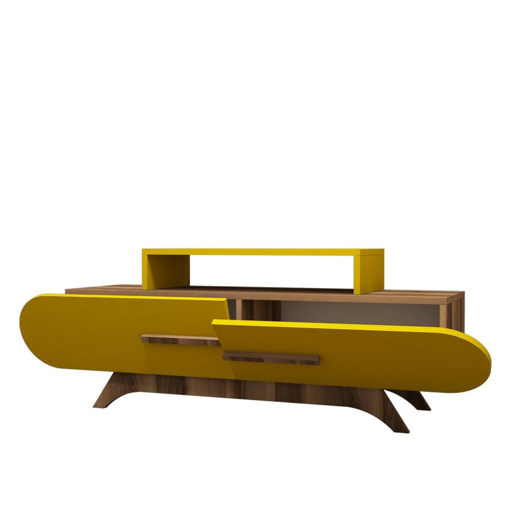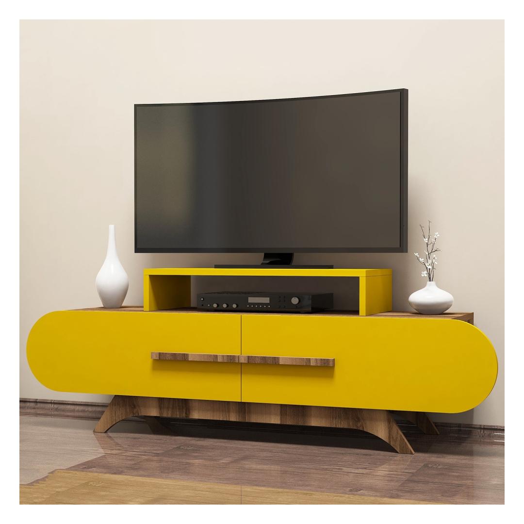 Embrace the free-spirited concept of bohemianism and let your creativity soar. Our TV Stand is designed to inspire and encourage self-expression. With its unique blend of walnut and yellow colors, it effortlessly captures the essence of bohemian style.
