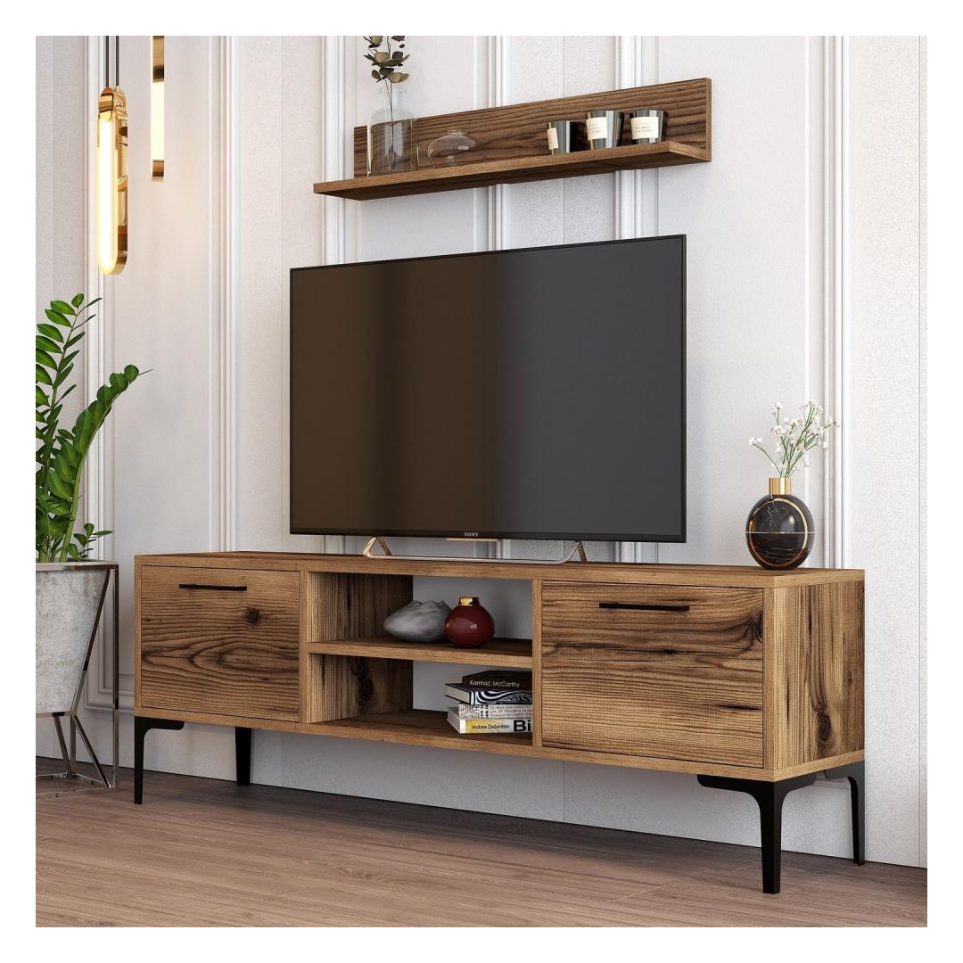 Featuring a sleek and modern design, this TV unit will effortlessly blend in with any décor style. The walnut color adds a touch of sophistication and warmth to your living space, creating a cozy and inviting atmosphere. The metal legs provide stability and a contemporary look, while the plastic handle adds a subtle touch of elegance.