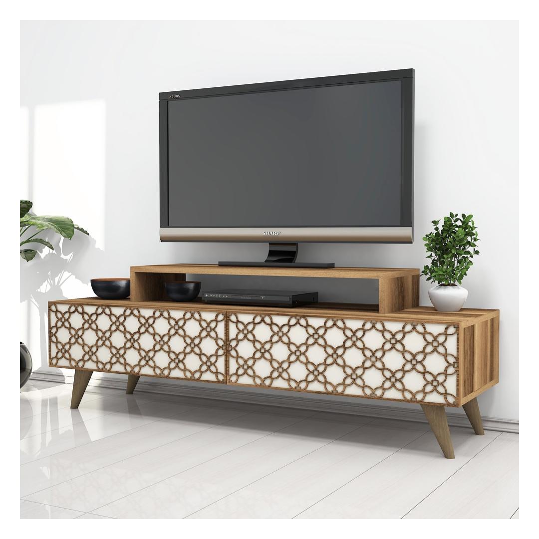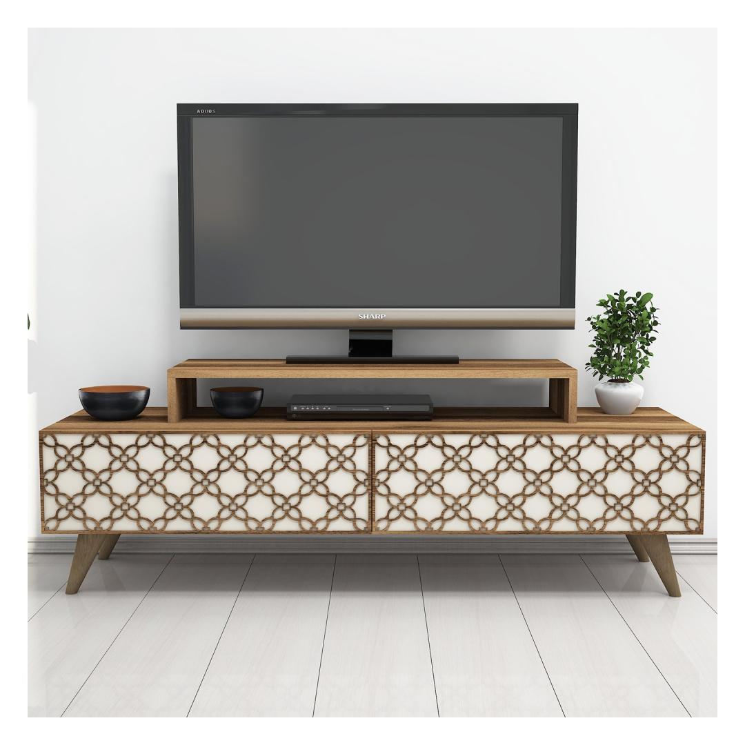 Crafted from 100% melamine coated particle board, this TV stand boasts durability and longevity. Its 18 mm thickness ensures sturdiness, while the 4 mm CNC relief adds a touch of elegance to its overall design. The combination of walnut and cream colors gives it a timeless appeal, making it suitable for any interior style.