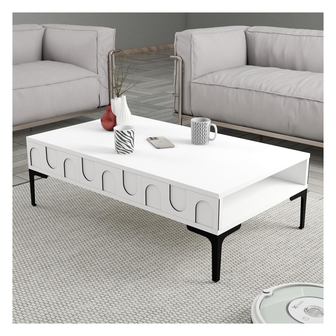 Transform your living space with our stunning coffee table, crafted from 100% melamine coated particle board. The sleek design and modern color combination of white and black will instantly elevate the style of any room.