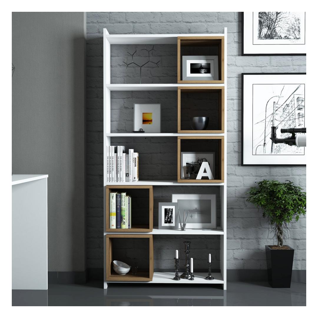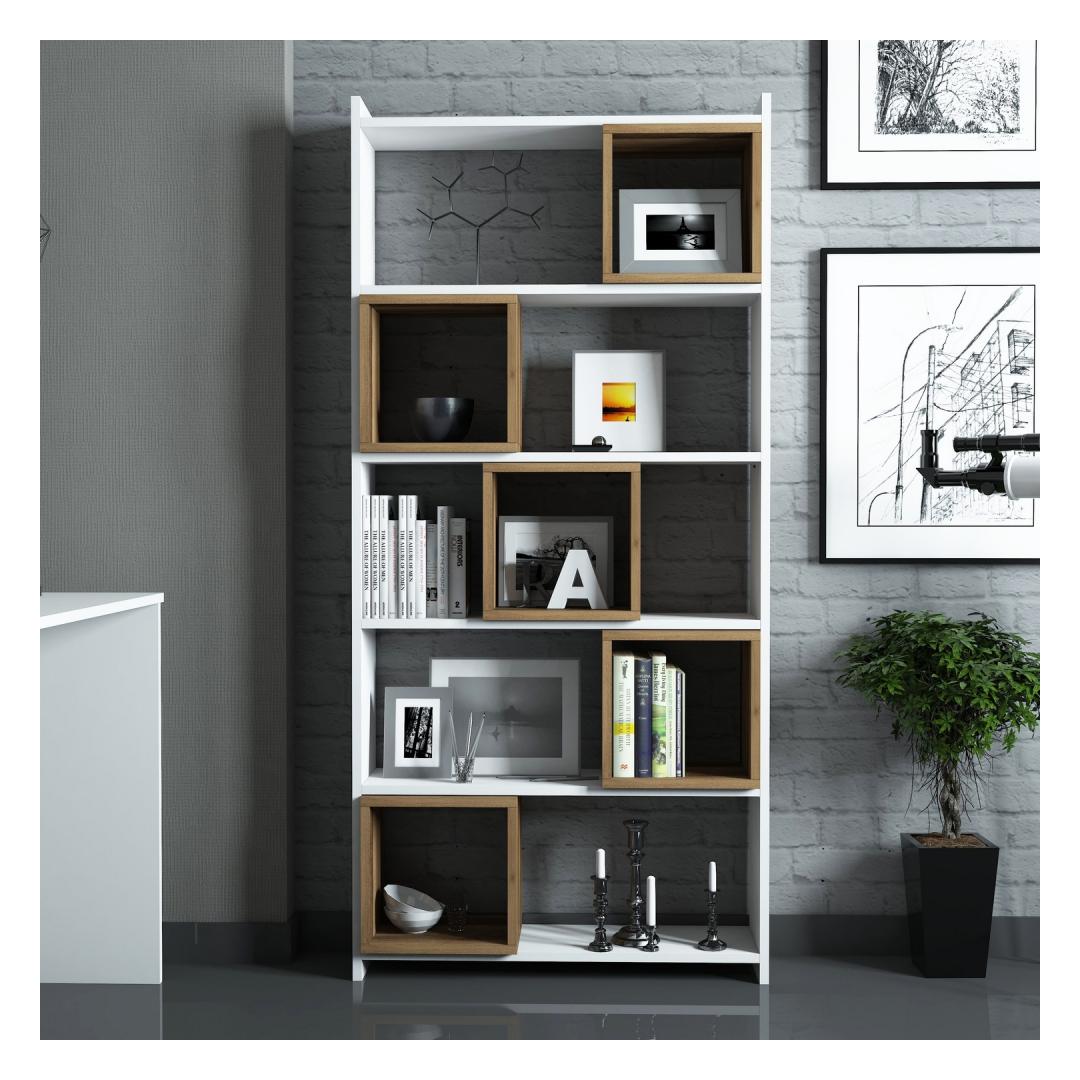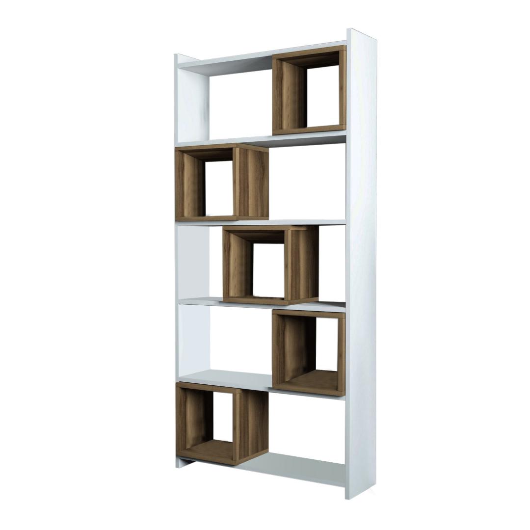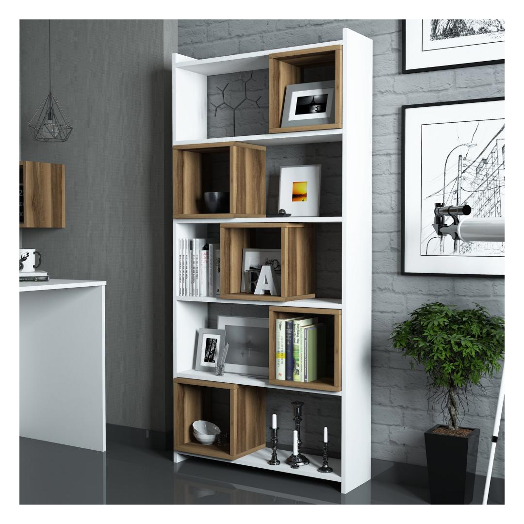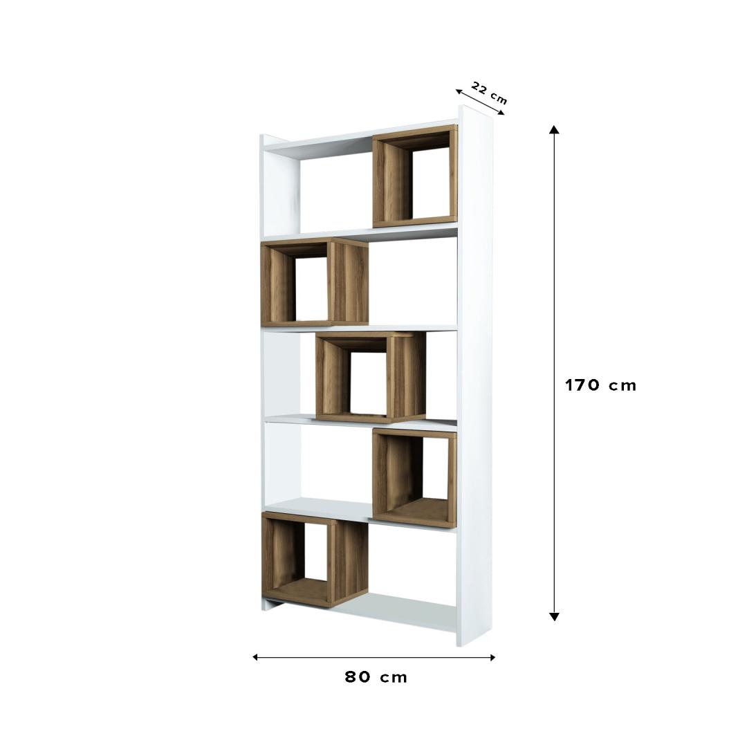 Featuring a solid color and a modern, novelty design, this bookshelf effortlessly blends in with any interior style. The combination of white and walnut colors adds a touch of sophistication and elegance to your space, making it a focal point of your room.
