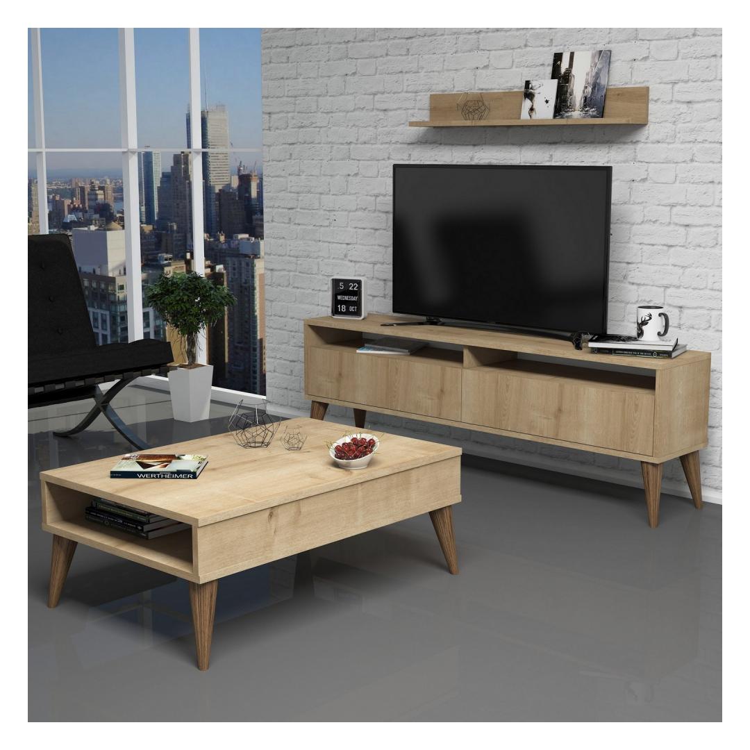 The TV stand, wall shelf, and coffee table are designed to seamlessly blend with any decor style. The oak color adds a touch of sophistication, while the clean lines exude modern elegance.