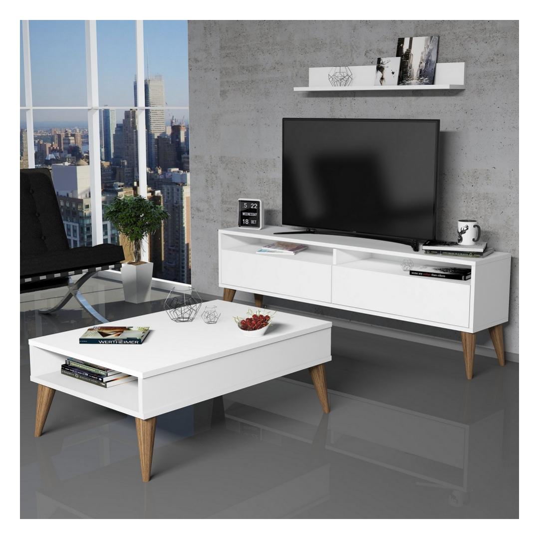 With numerous shelves and a TV stand, this set offers ample storage space for all your entertainment needs. The coffee table provides a convenient surface for drinks and snacks, while the wall shelf adds a decorative touch to your space.