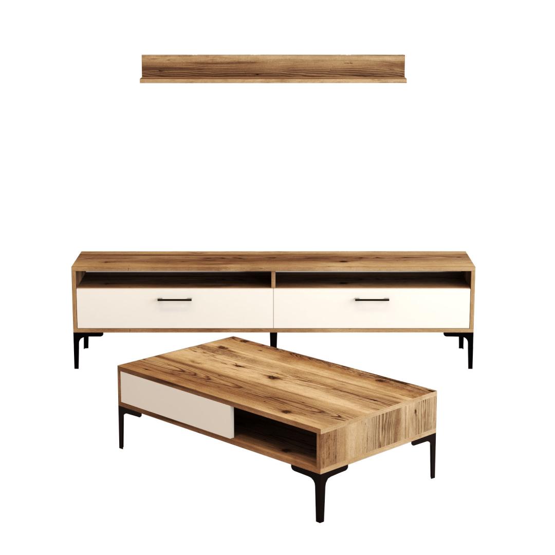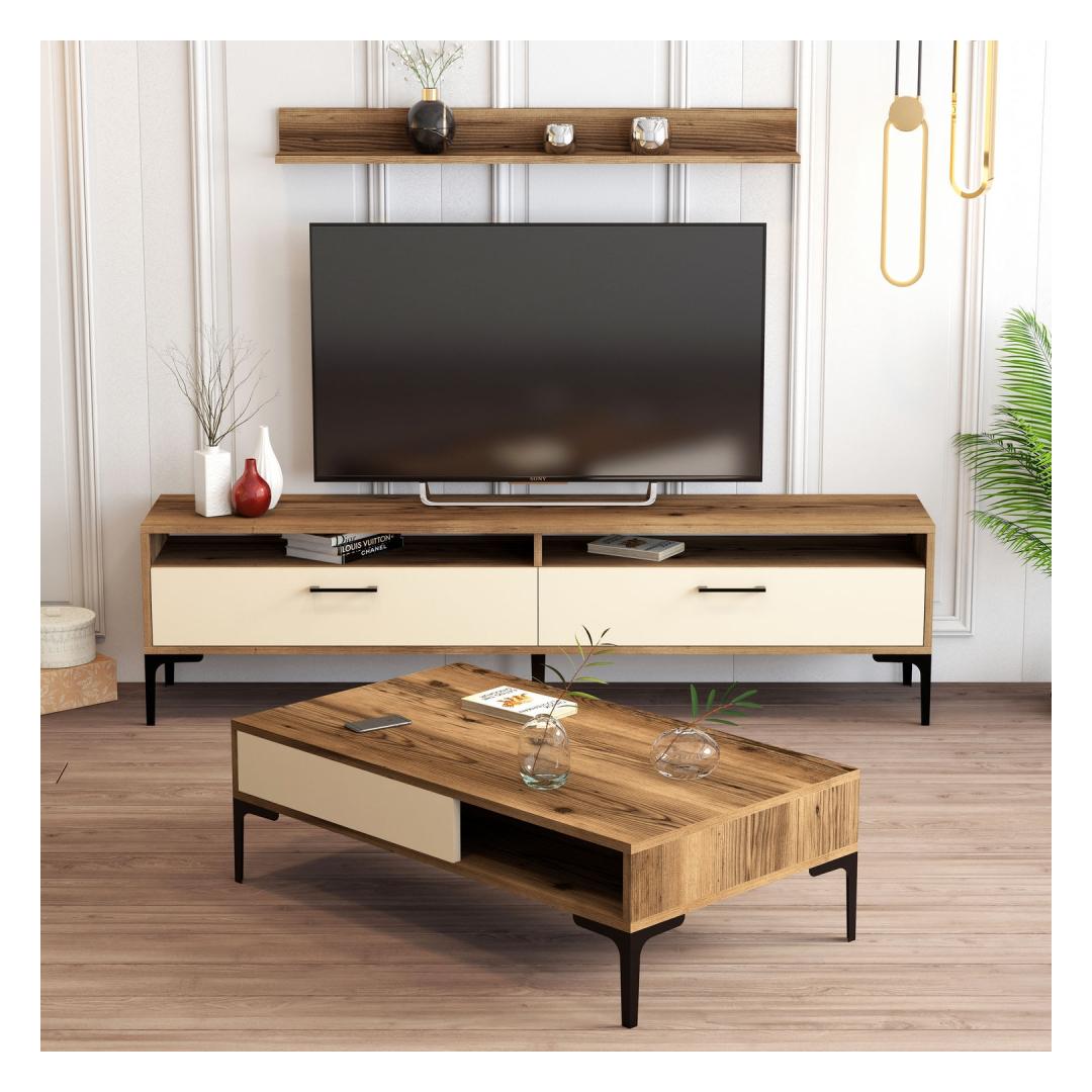 Featuring a TV stand, wall shelf, and coffee table, this set offers ample storage space to keep your living room organized and clutter-free. The numerous shelves provide the perfect spot to display your favorite books, decorative items, and cherished memories.