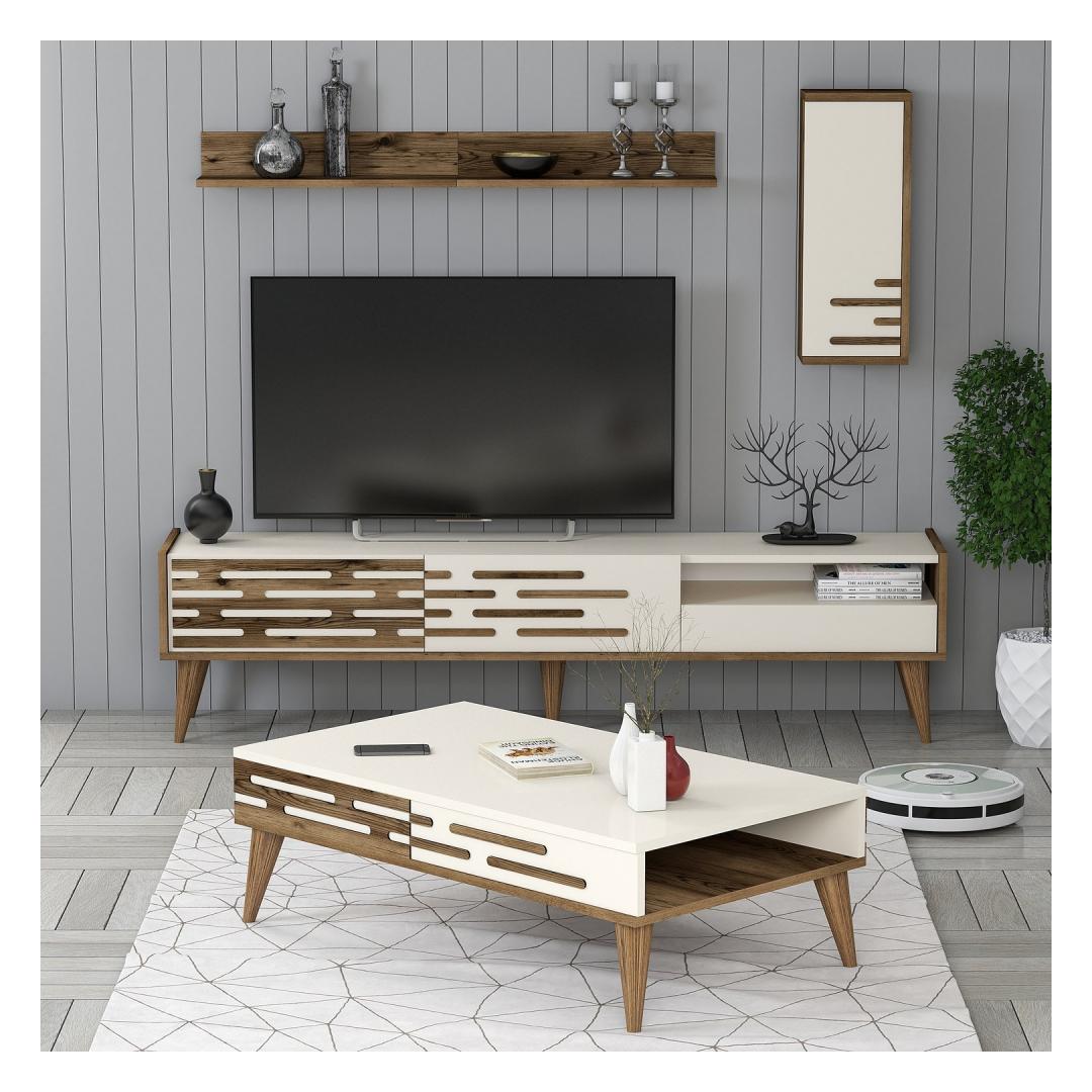 Featuring a TV stand, wall shelf, cabinet, and coffee table, this set offers ample storage space to keep your living room organized and clutter-free. The numerous shelves and additional storage options ensure that everything has its place, making it easy to find what you need.