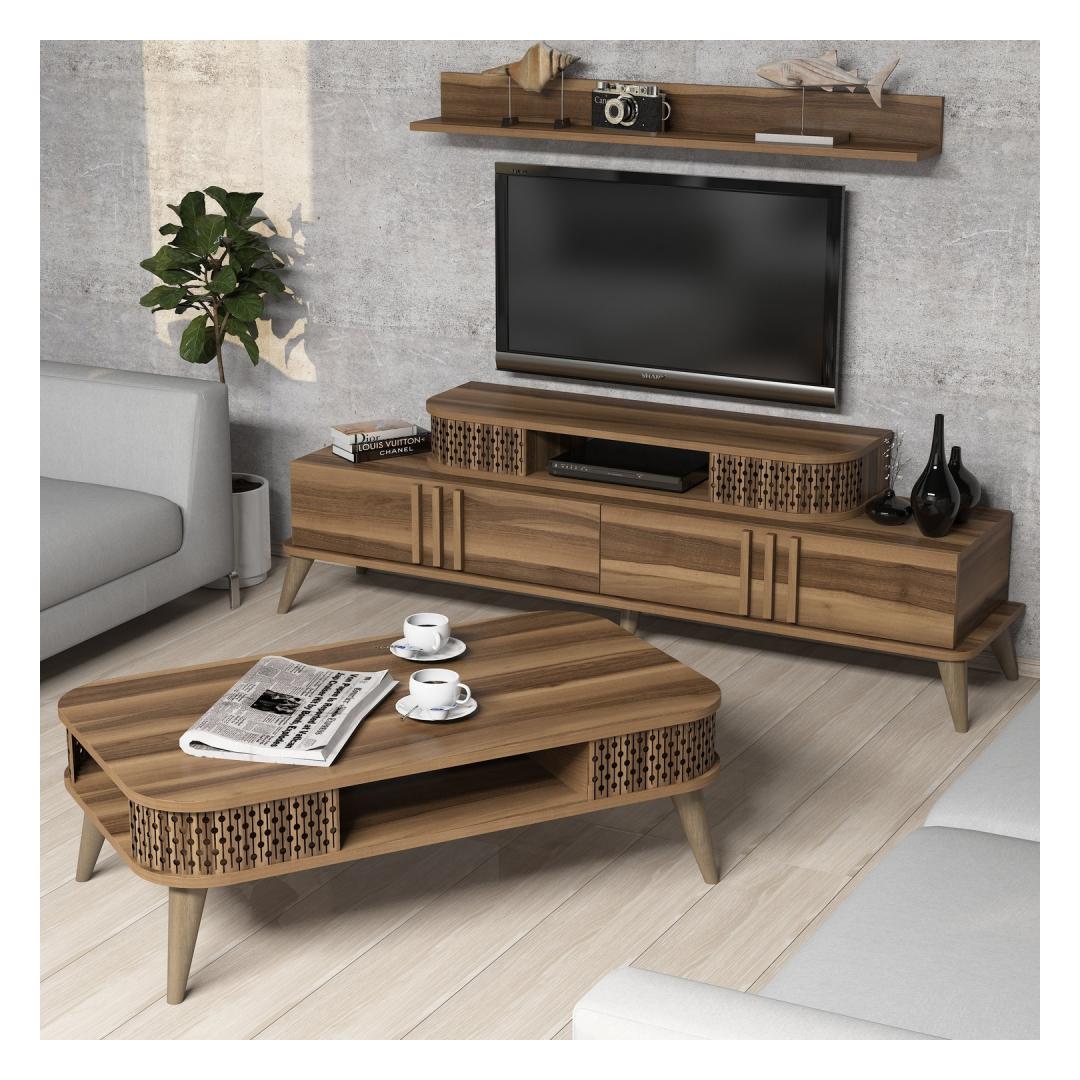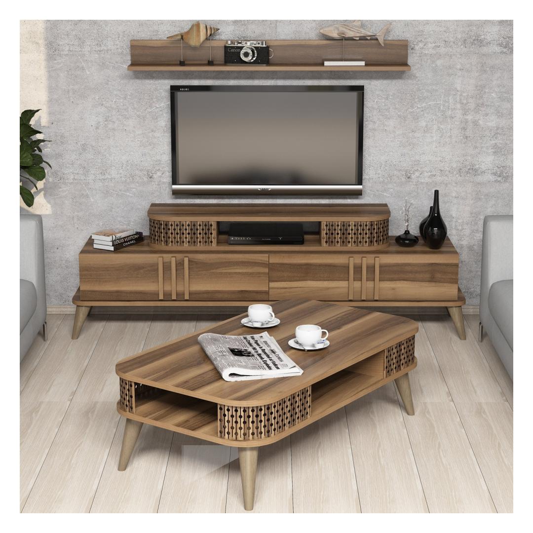 The TV unit and wall shelf can be easily fixed to the wall, saving valuable floor space and giving your room a clean and organized look. The coffee table offers a spacious surface for entertaining guests or enjoying a cozy evening with loved ones.