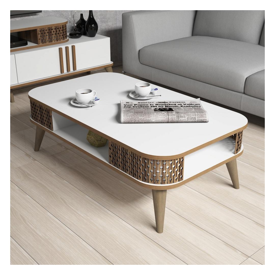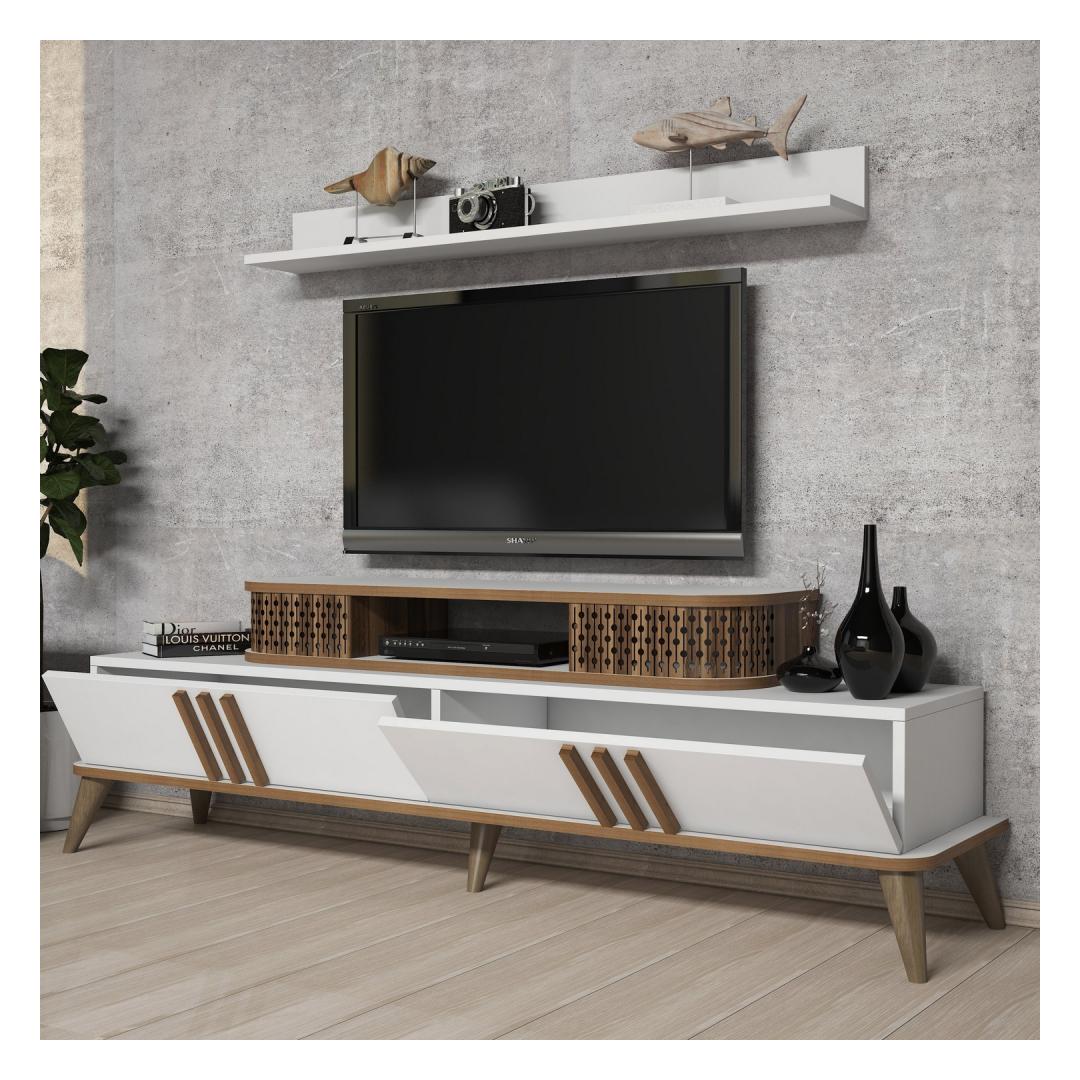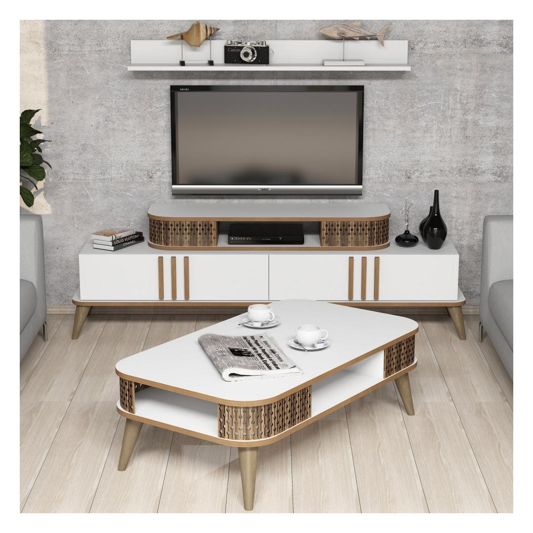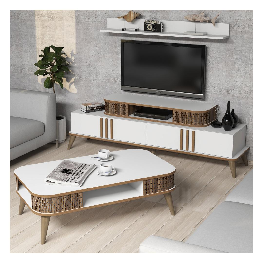 Featuring a TV unit, TV shelf, wall shelf, and coffee table, this set offers ample storage and display options for all your belongings. The numerous shelves provide a convenient space to showcase your favorite books, decor, and electronics.
