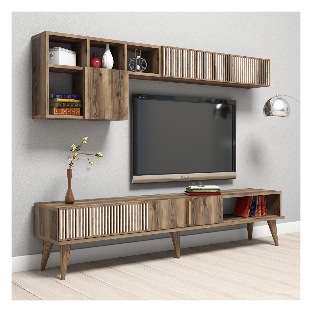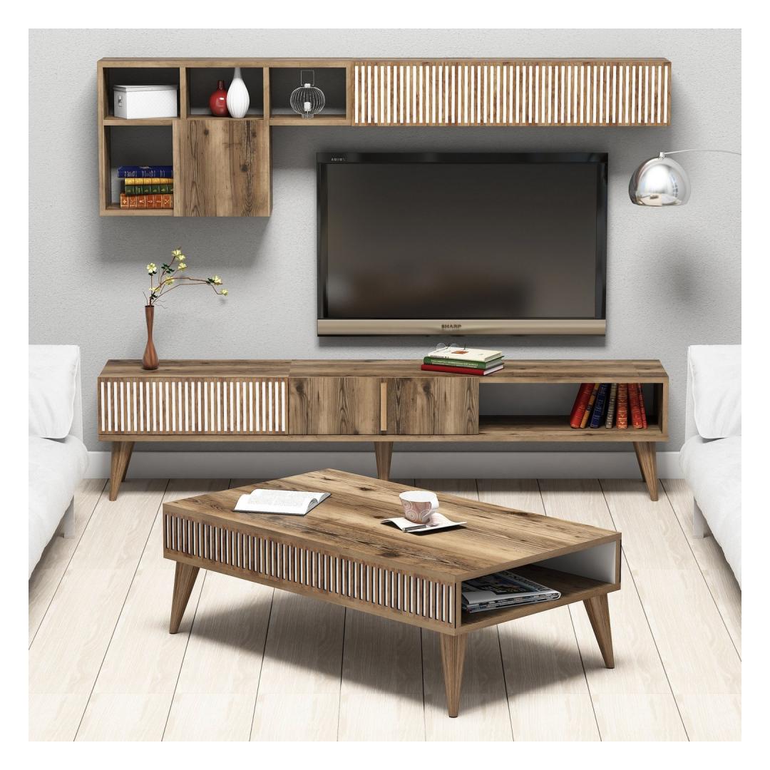 With numerous shelves and the option to fix it to the wall, this furniture set allows you to showcase your favorite decor pieces and keep your living room organized. The walnut color adds warmth and richness, creating a welcoming ambiance.