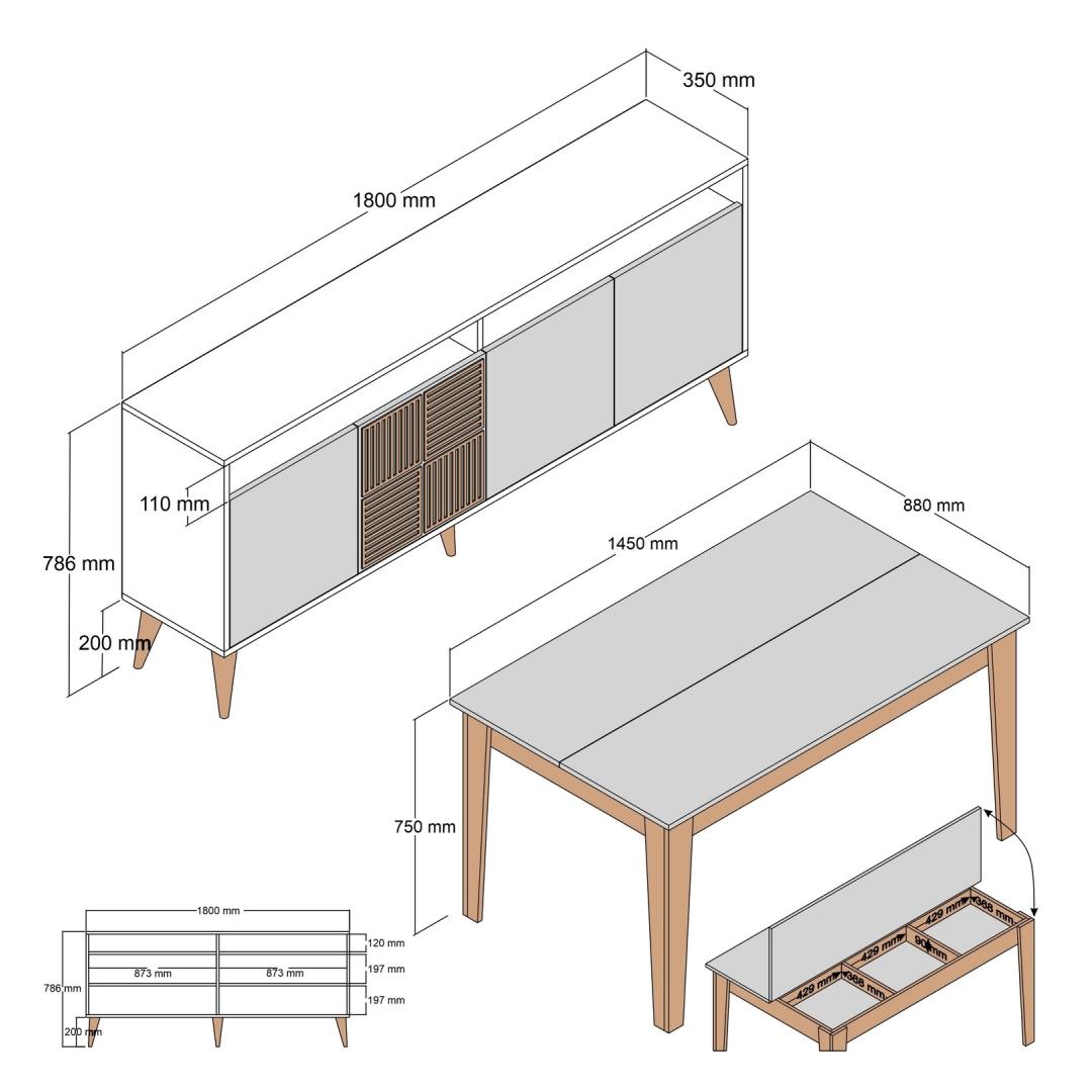 With a dresser size of 180cm width and 78.6cm height, you'll have plenty of space to store your belongings. The dresser leg height of 20cm adds an extra touch of sophistication. The table, with its dimensions of 145cm width, 75cm height, and 88cm depth, provides the perfect surface for entertaining guests.