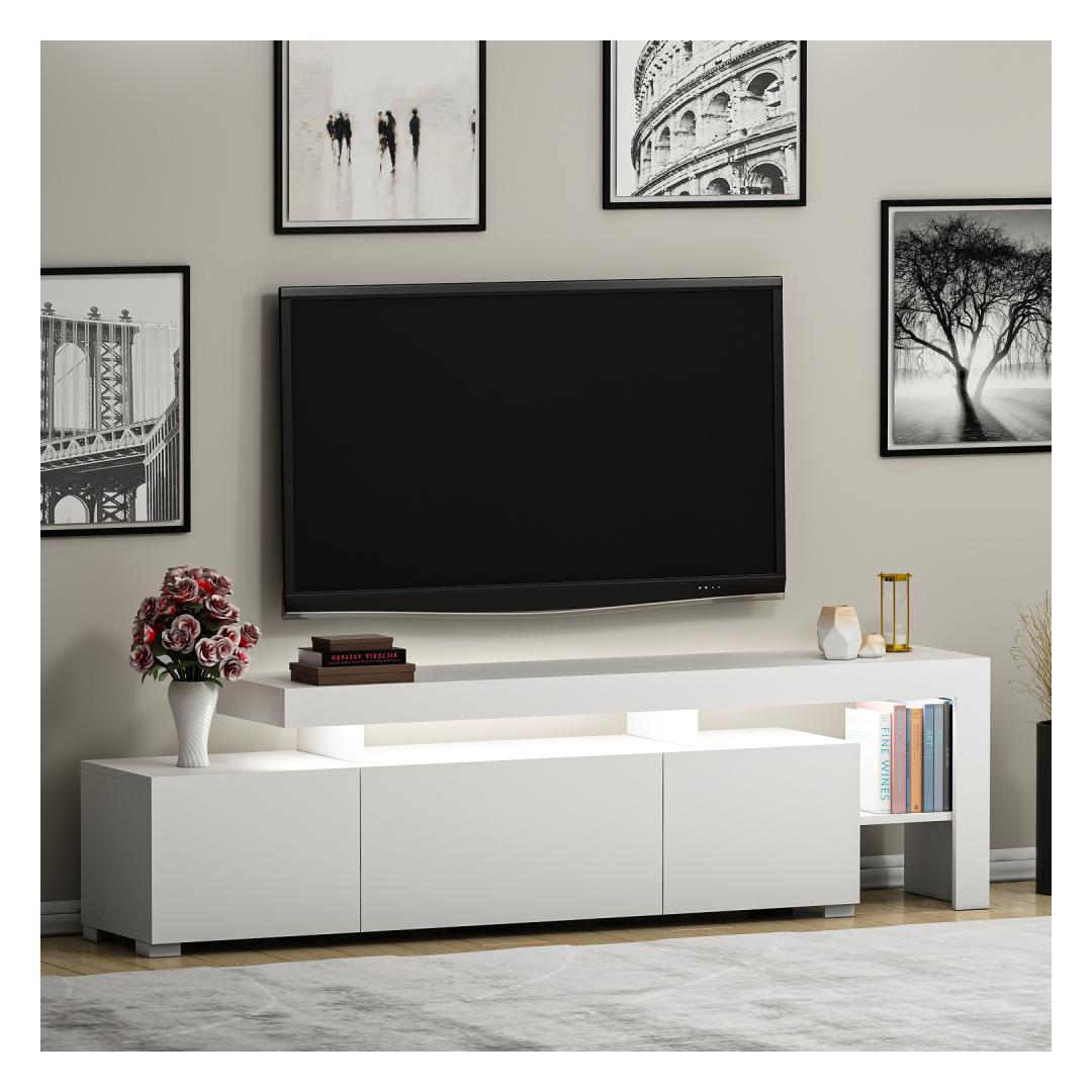 Introducing our stunning TV stand that will elevate your living space to new heights of elegance and sophistication. Crafted with 100% melamine coated particle board, this TV stand is not only durable but also exudes a sense of luxury. The sleek and contemporary design, with its clean lines and white color, adds a touch of modernity to any room.