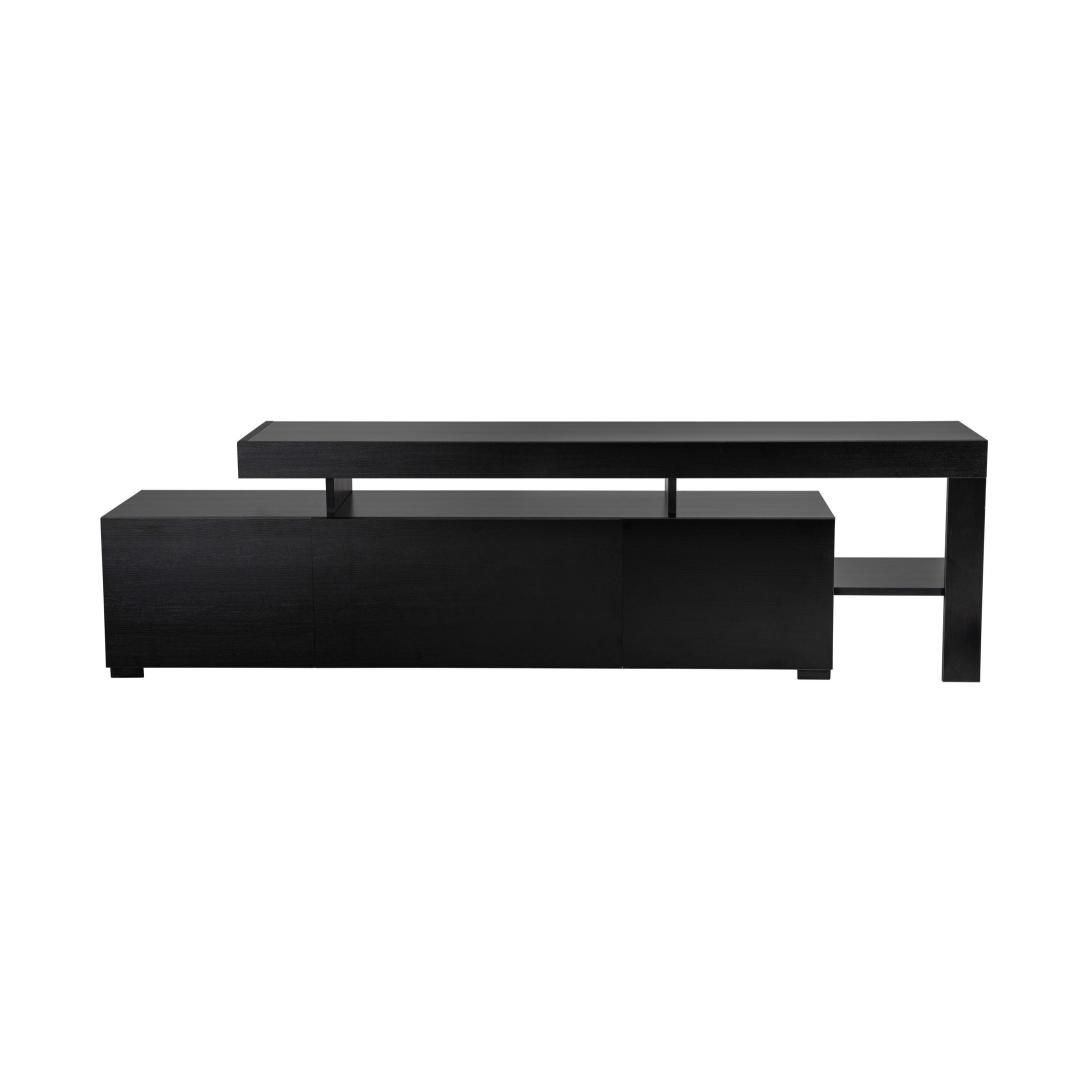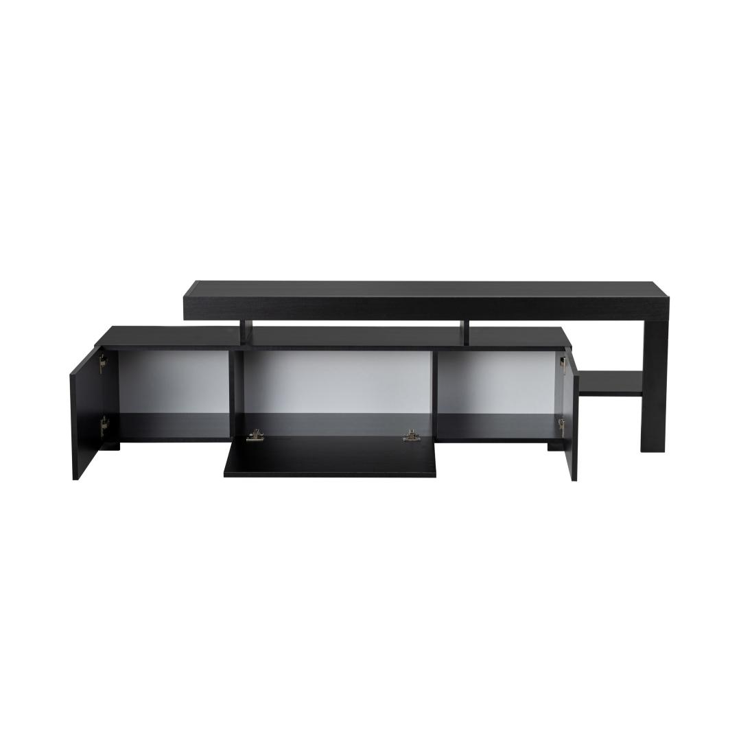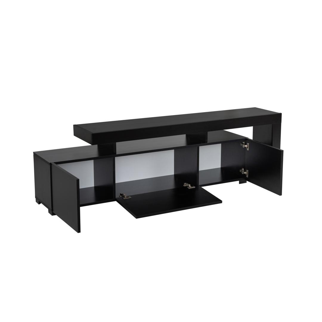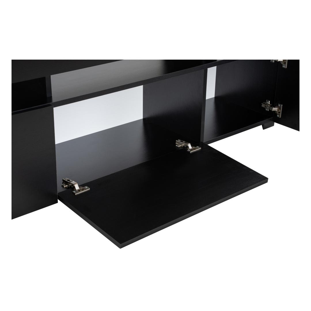 Transform your living room into a sleek and modern entertainment hub with our stunning TV stand. Made from 100% melamine coated particle board, this TV stand is not only durable but also stylish, adding a touch of elegance to your space. The PVC edgebanding ensures a clean and polished look, while the LED lights included create a warm and inviting ambiance.