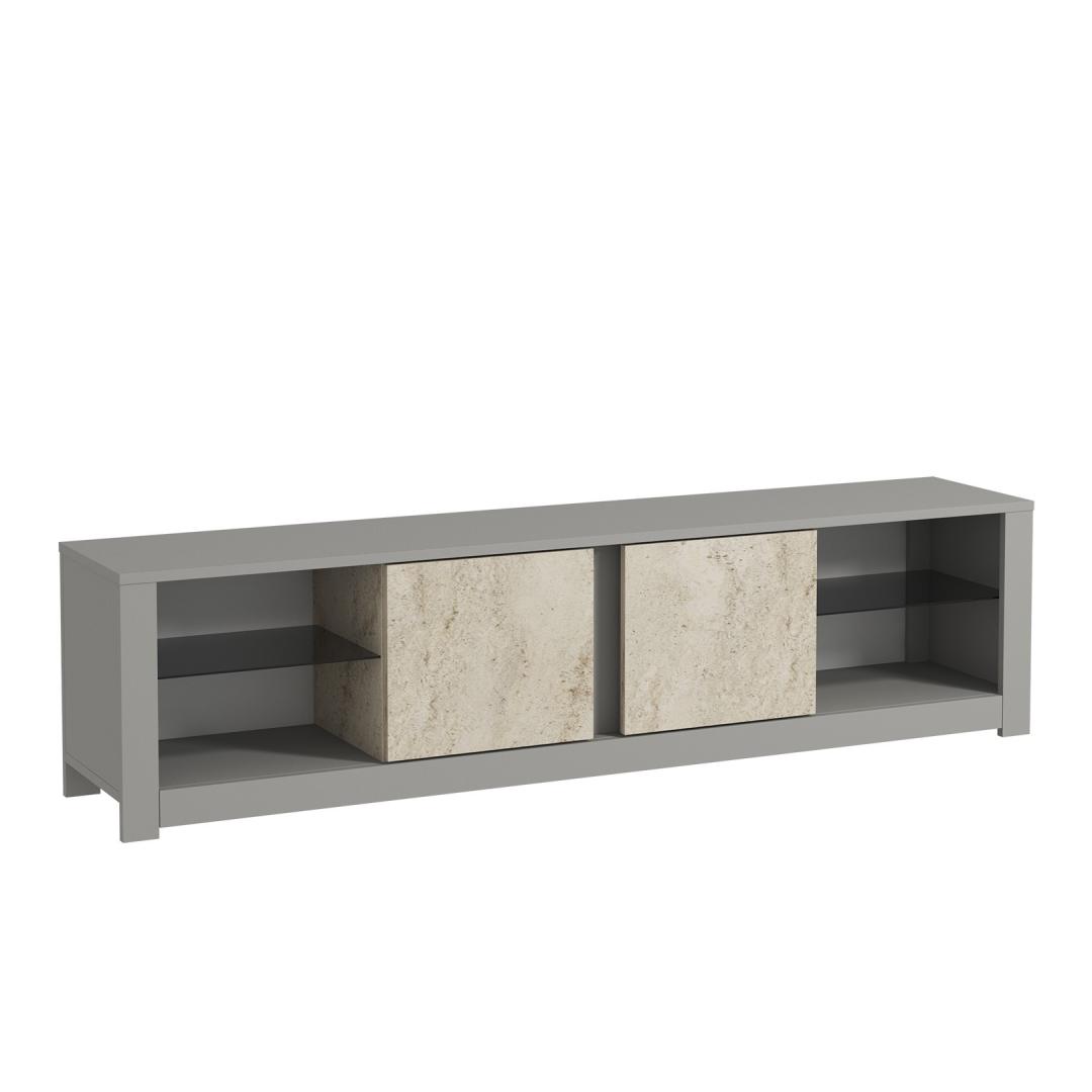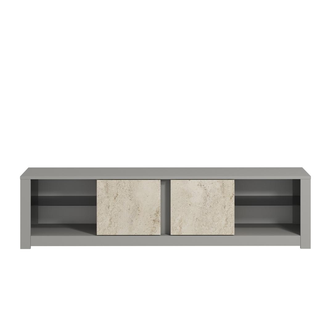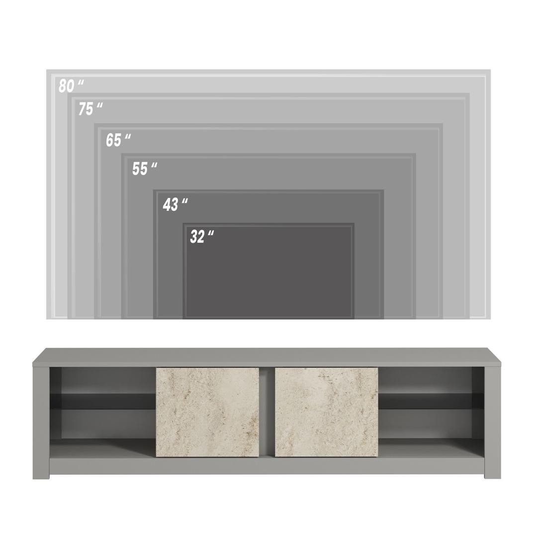Transform your living room into a stylish and organized space with our modern TV stand. Made from 100% melamine coated particle board, this TV stand is not only durable but also sleek and elegant. The grey and travertine colors add a touch of sophistication to any room, making it the perfect addition to your home decor.