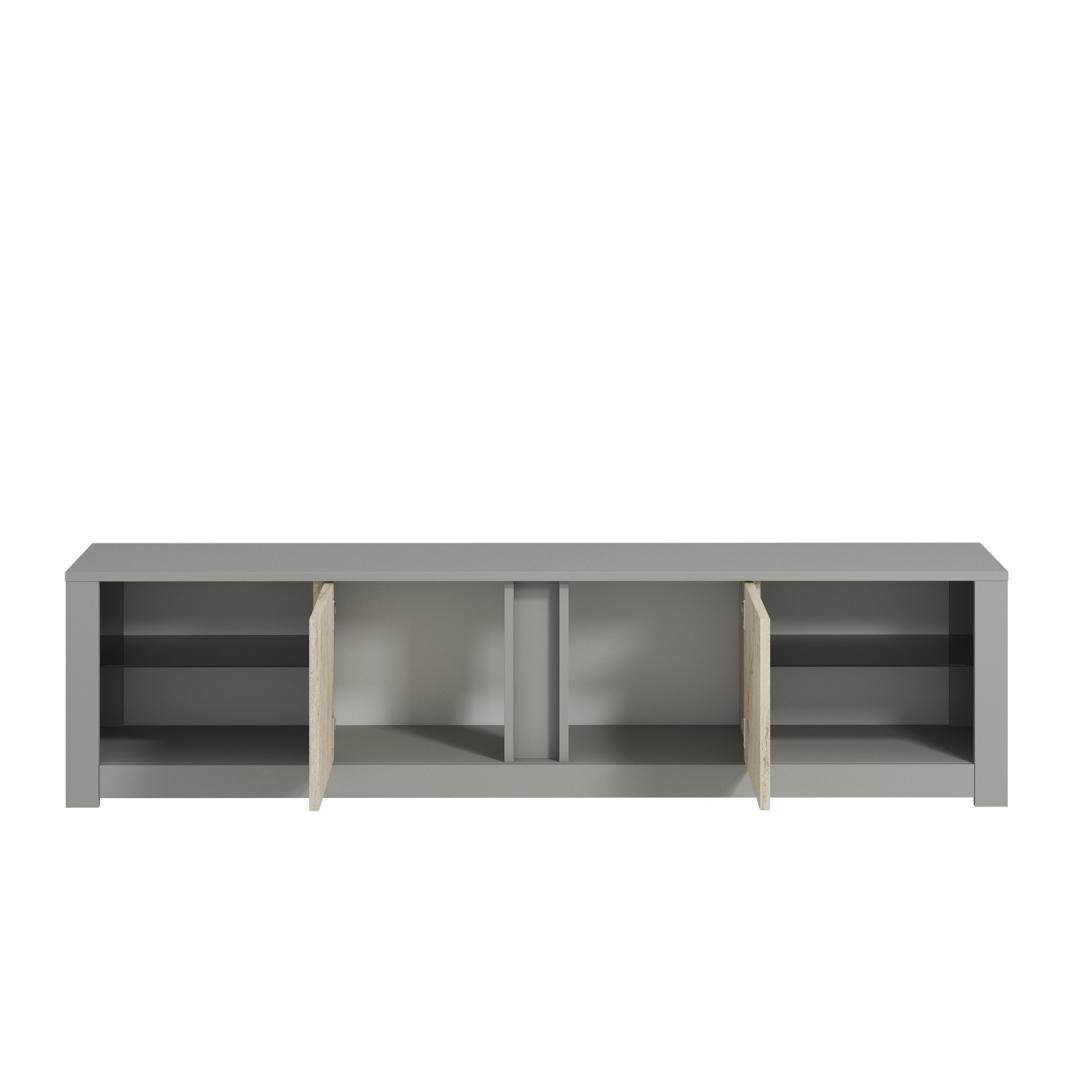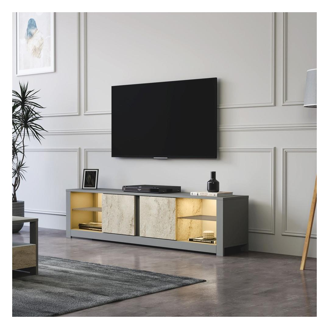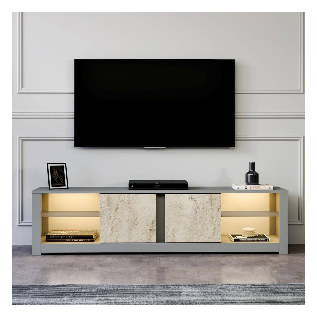 Transform your living room into a stylish and organized space with our modern TV stand. Made from 100% melamine coated particle board, this TV stand is not only durable but also sleek and elegant. The grey and travertine colors add a touch of sophistication to any room, making it the perfect addition to your home decor.