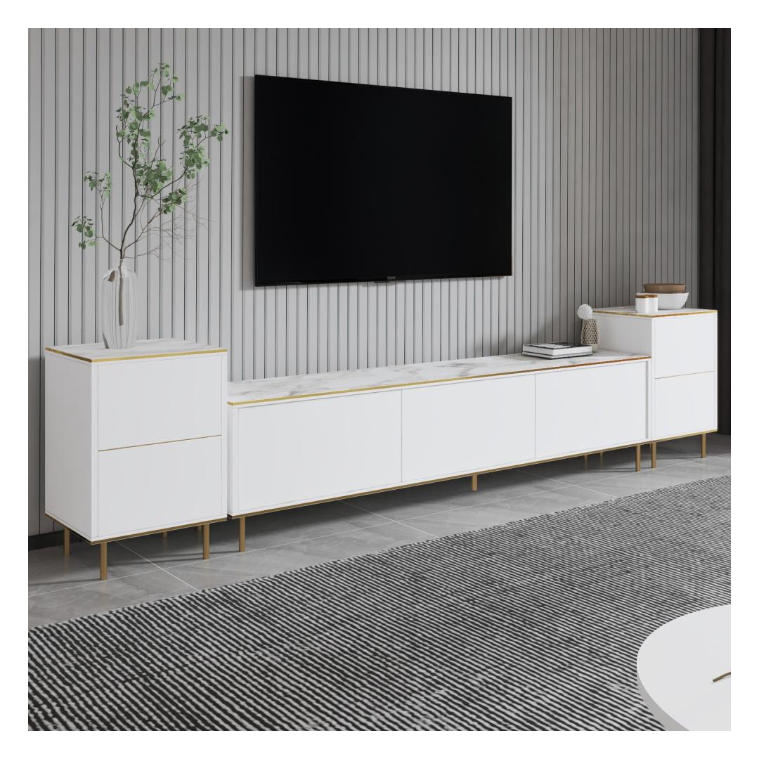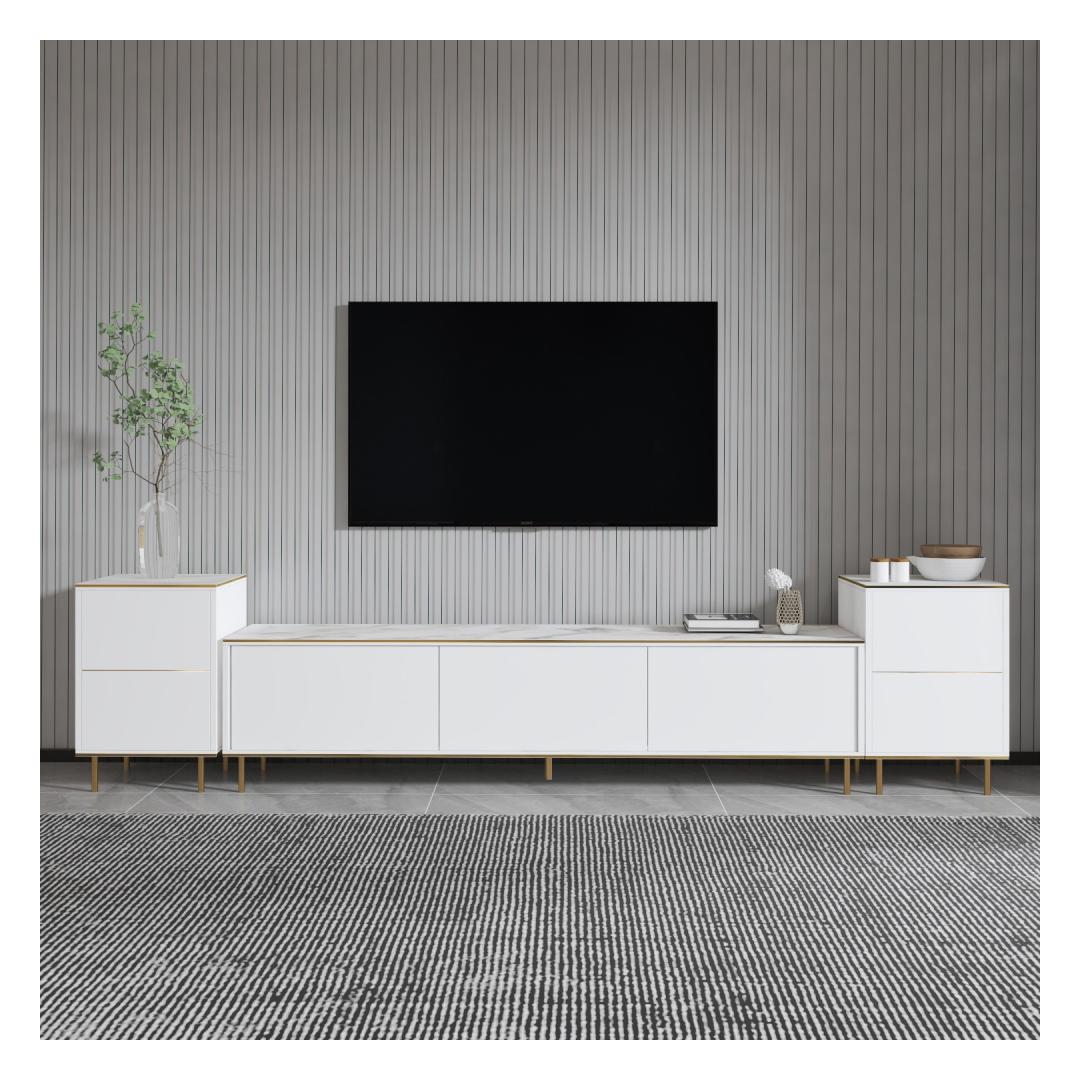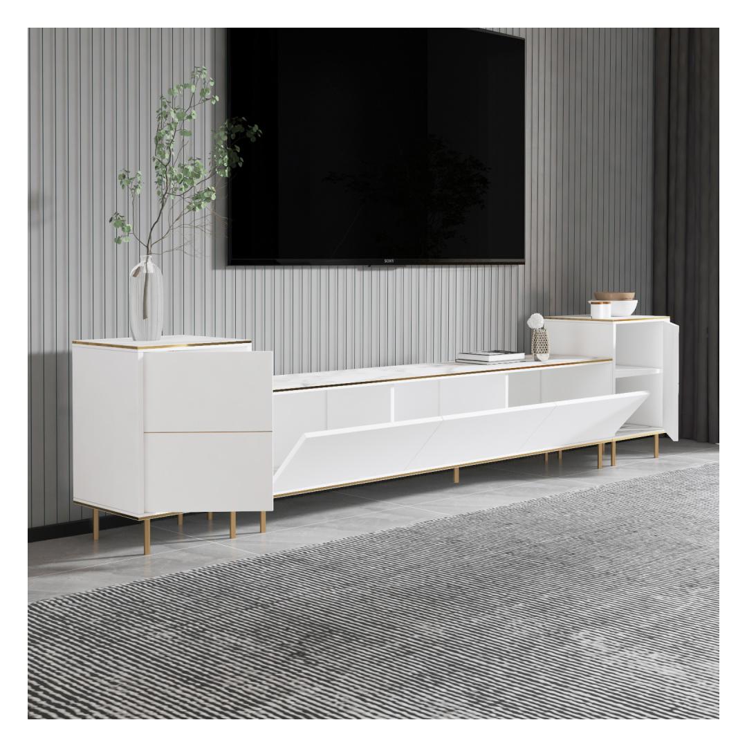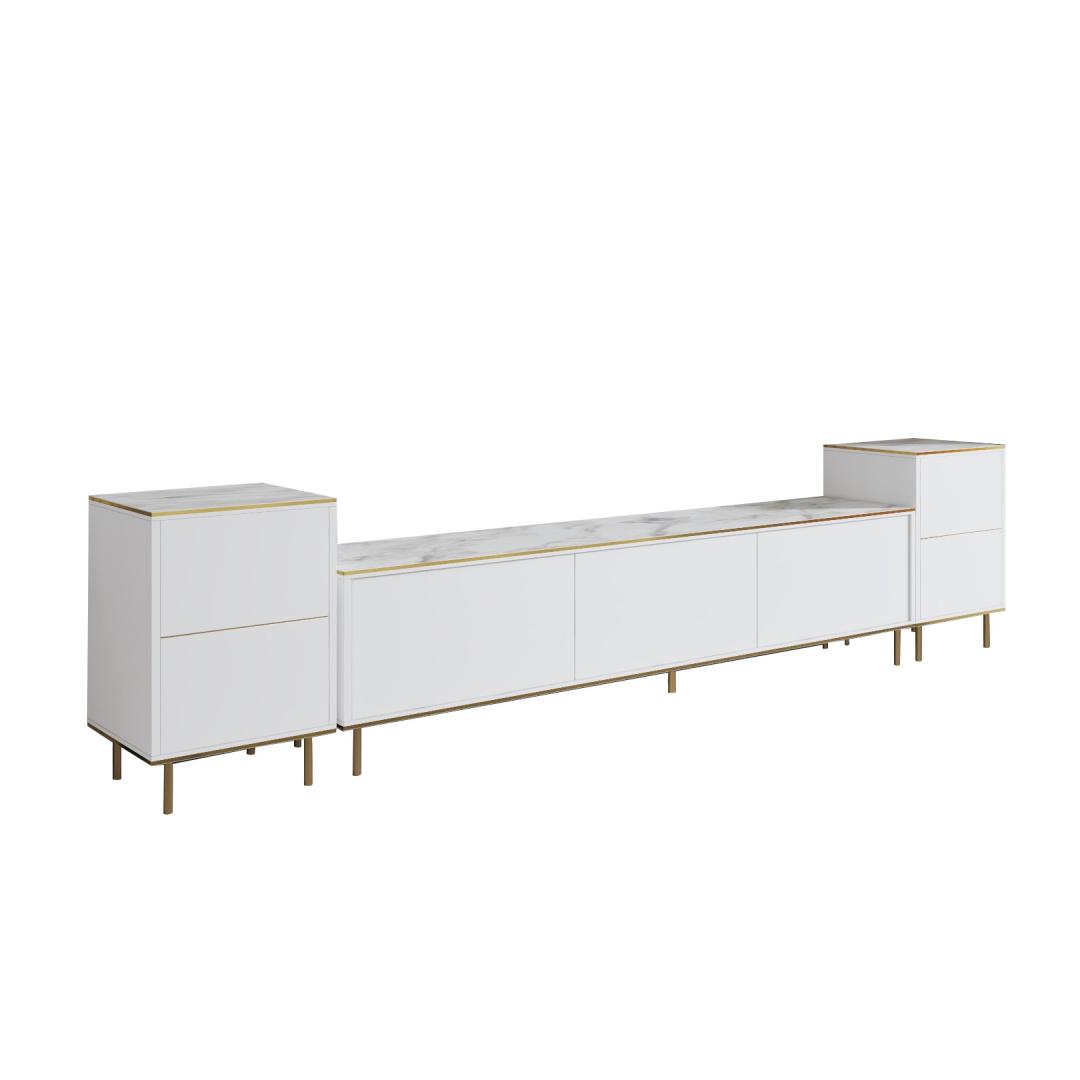 Transform your living room into a luxurious and elegant space with our stunning TV unit. The combination of white marble and gold accents exudes sophistication and style, making it the perfect focal point for your entertainment area.