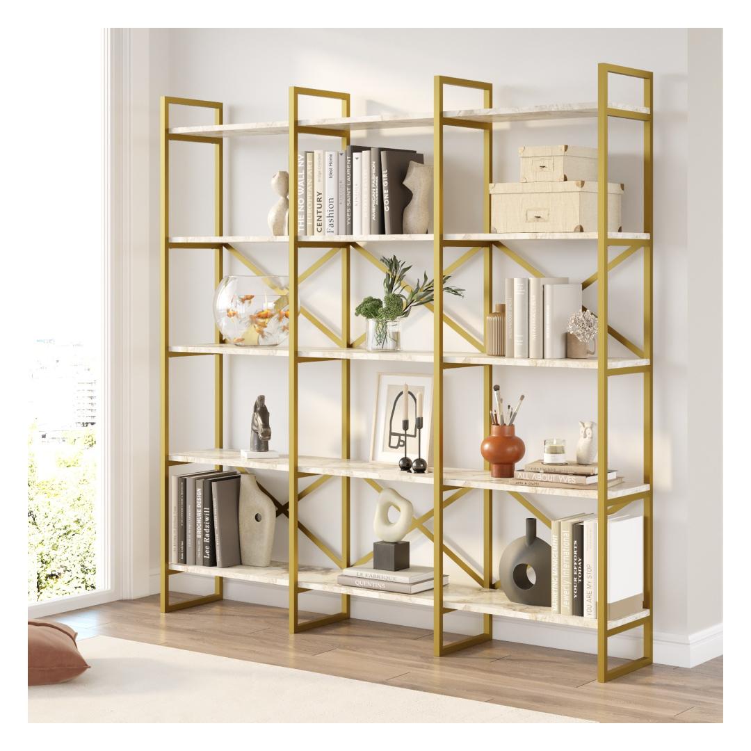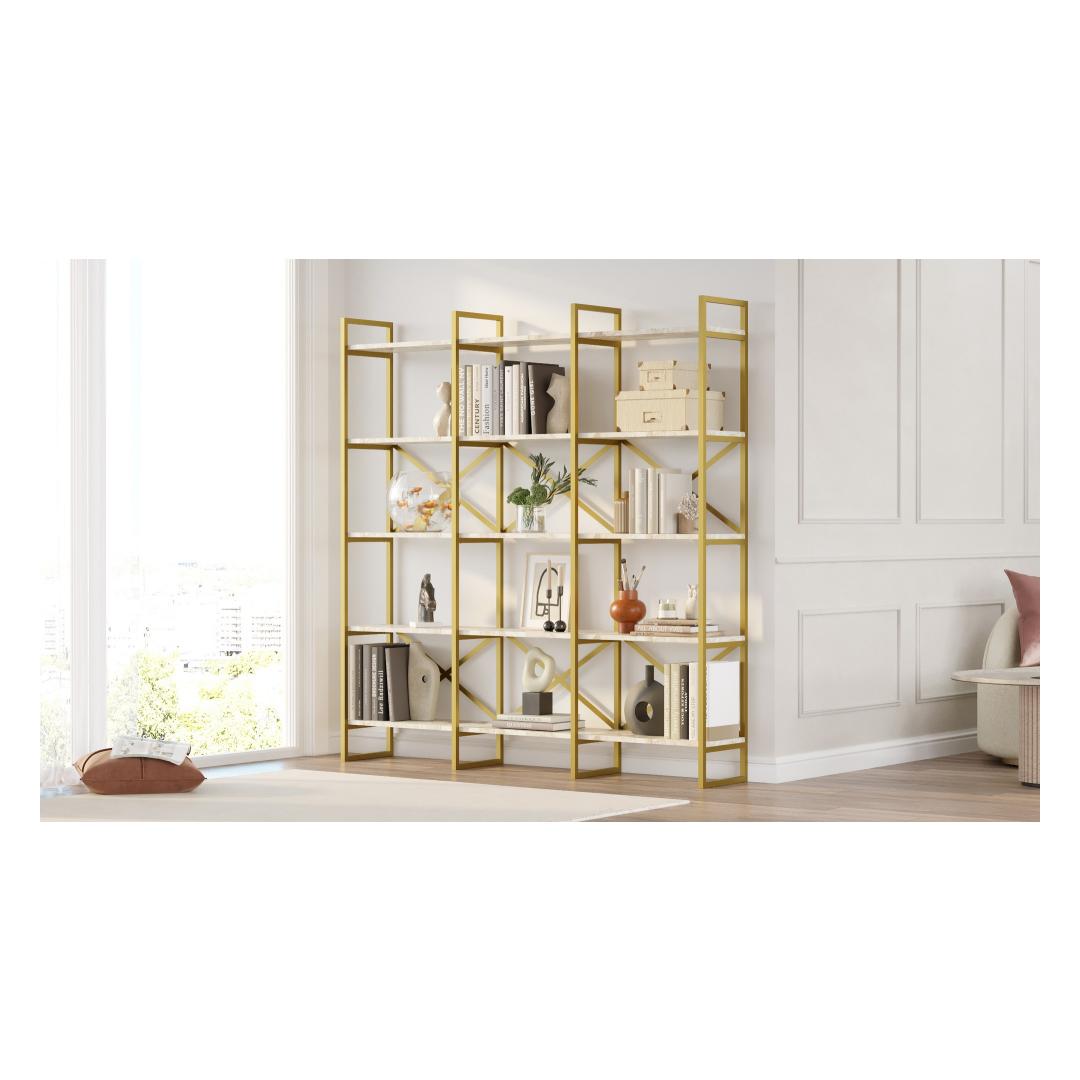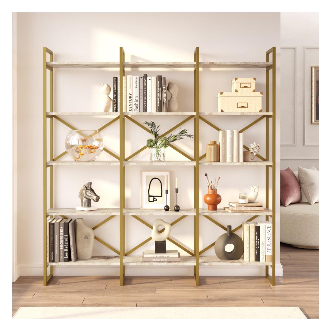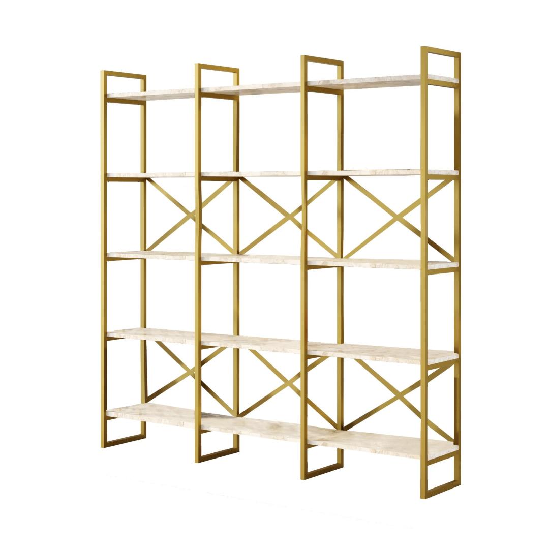 Constructed with 100% melamine coated particle board, this bookshelf is built to last. The 18 mm thickness ensures exceptional sturdiness, allowing you to confidently display your collection of books without worrying about sagging or bending. The sleek metal frame adds a modern touch, while the combination of white marble and gold colors exudes elegance and luxury.