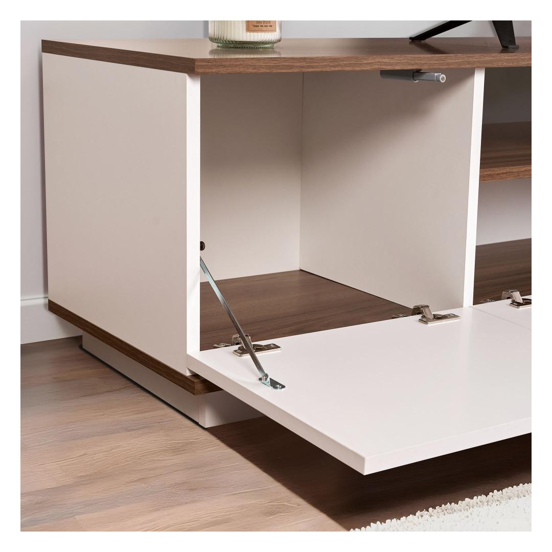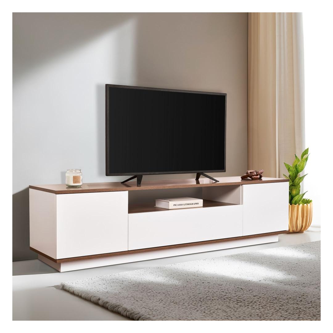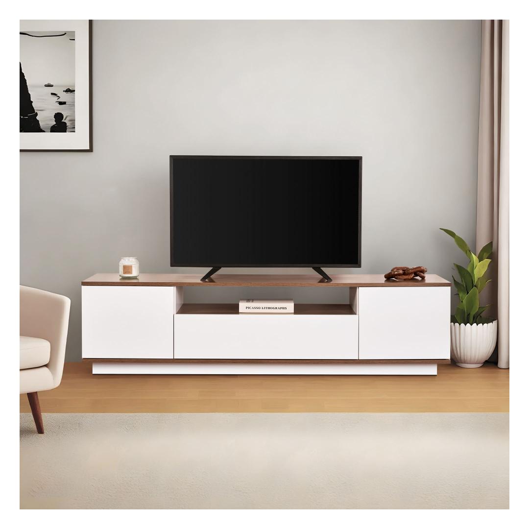 Our TV stand is crafted from 100% melamine coated particle board, ensuring durability and longevity. The clean lines and minimalist design make it a versatile addition to any home decor, while the combination of white and walnut colors adds a touch of sophistication.
