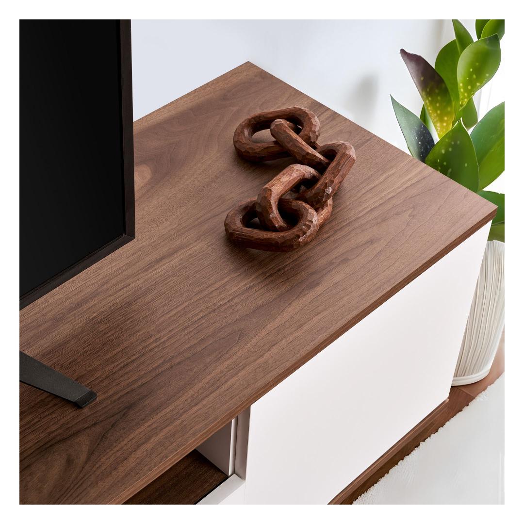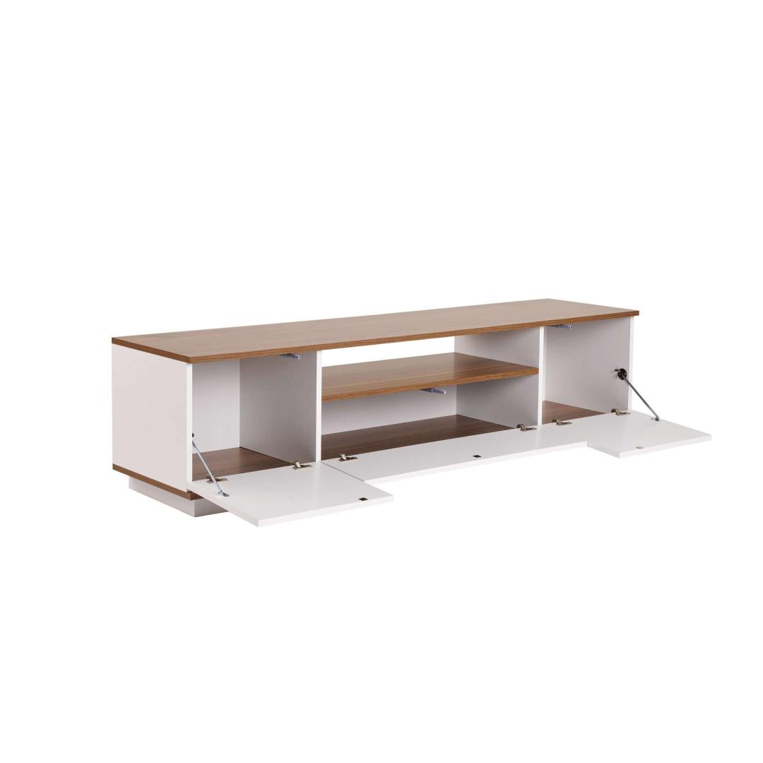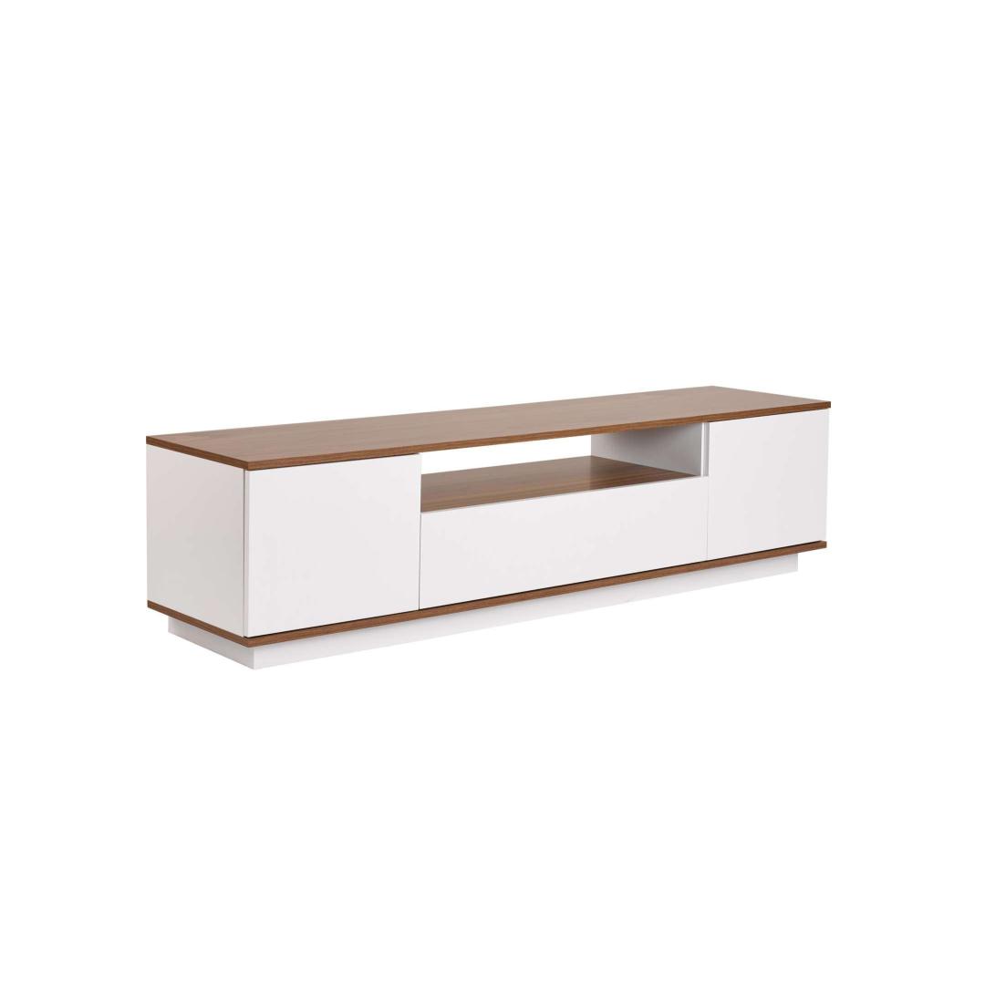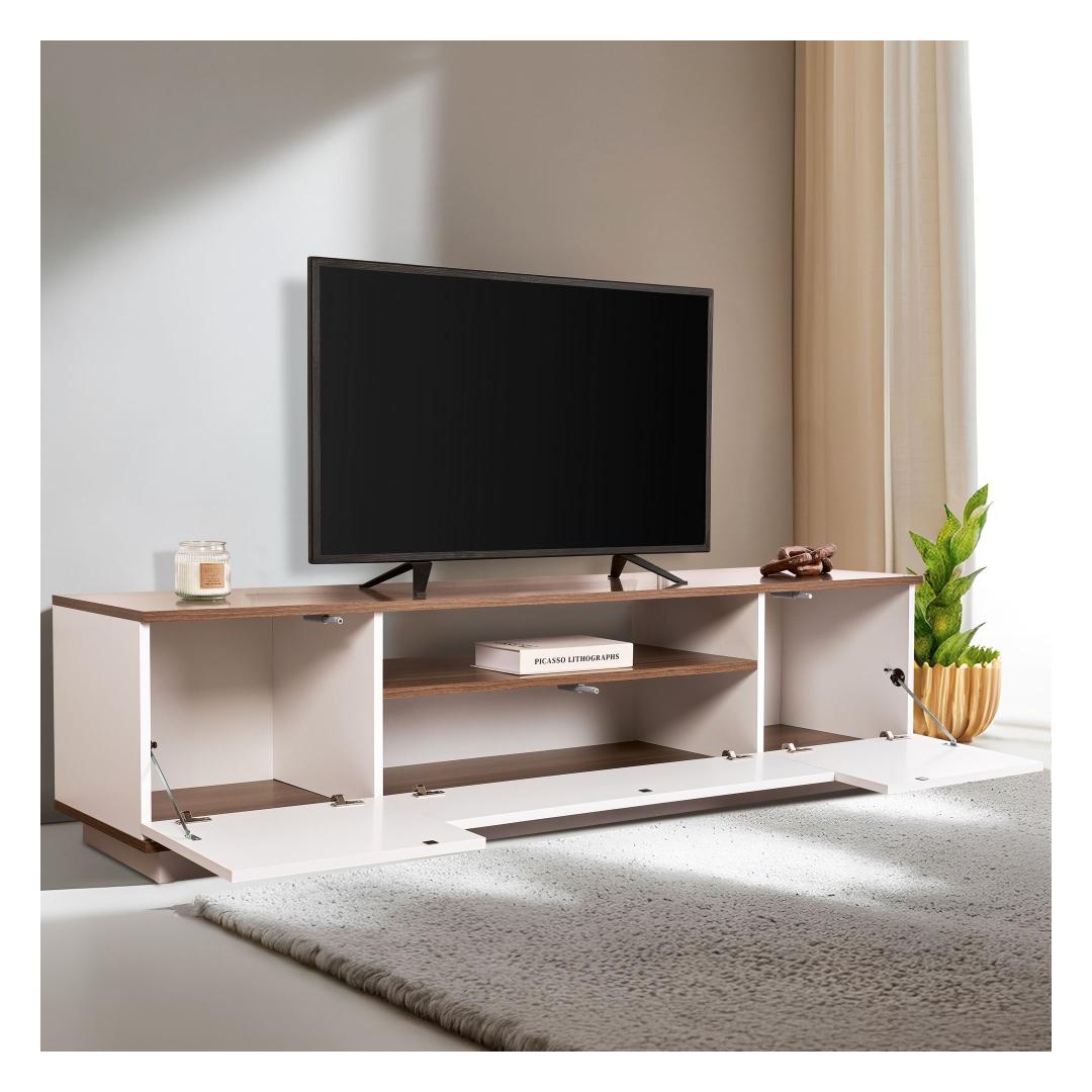 Our TV stand is crafted from 100% melamine coated particle board, ensuring durability and longevity. The clean lines and minimalist design make it a versatile addition to any home decor, while the combination of white and walnut colors adds a touch of sophistication.