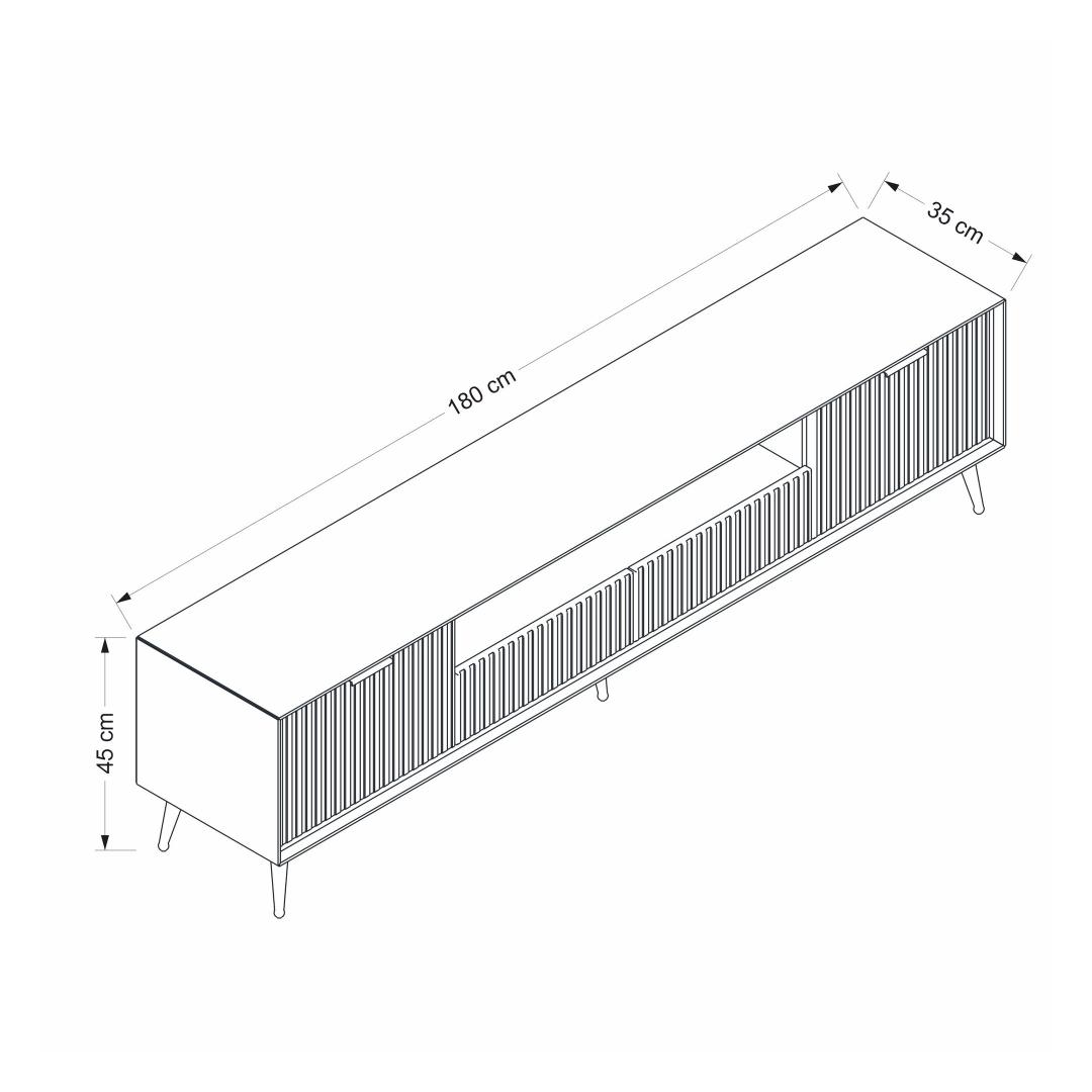 With a width of 180 cm, height of 45 cm, and depth of 35 cm, this TV stand provides ample space for your television, media players, and other entertainment essentials. Say goodbye to clutter and hello to a well-organized entertainment center.