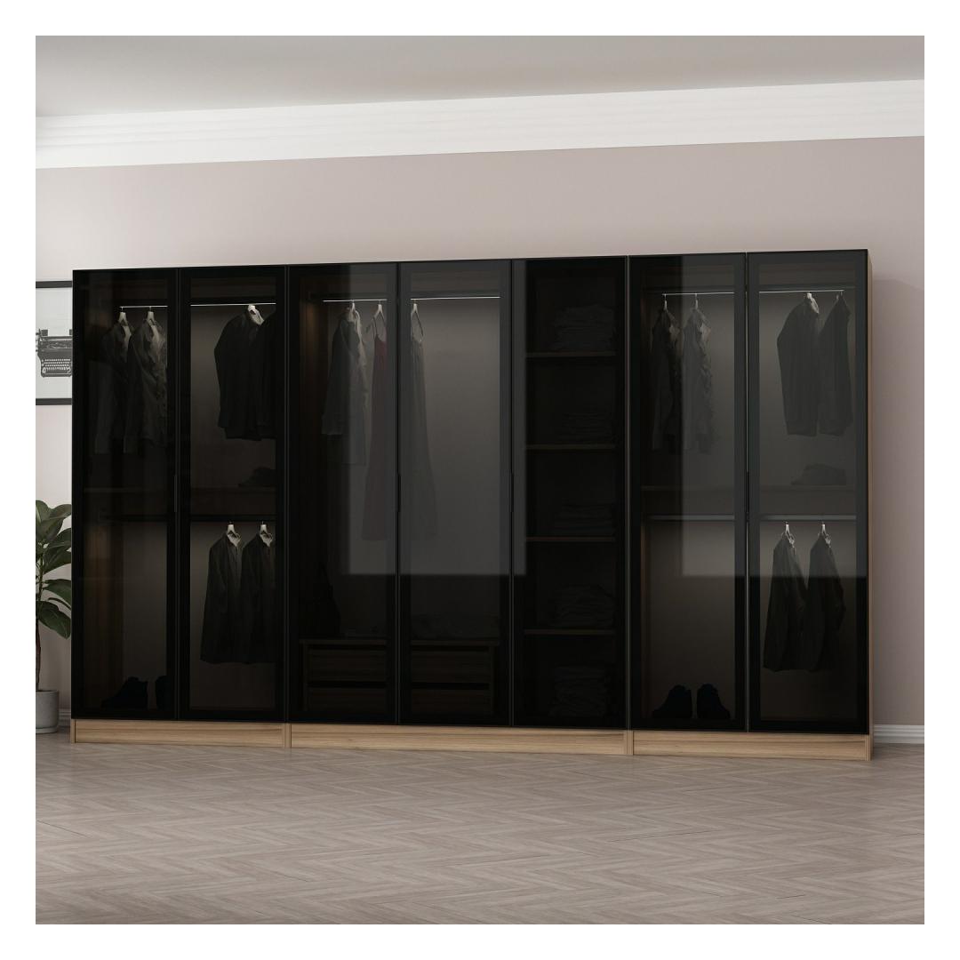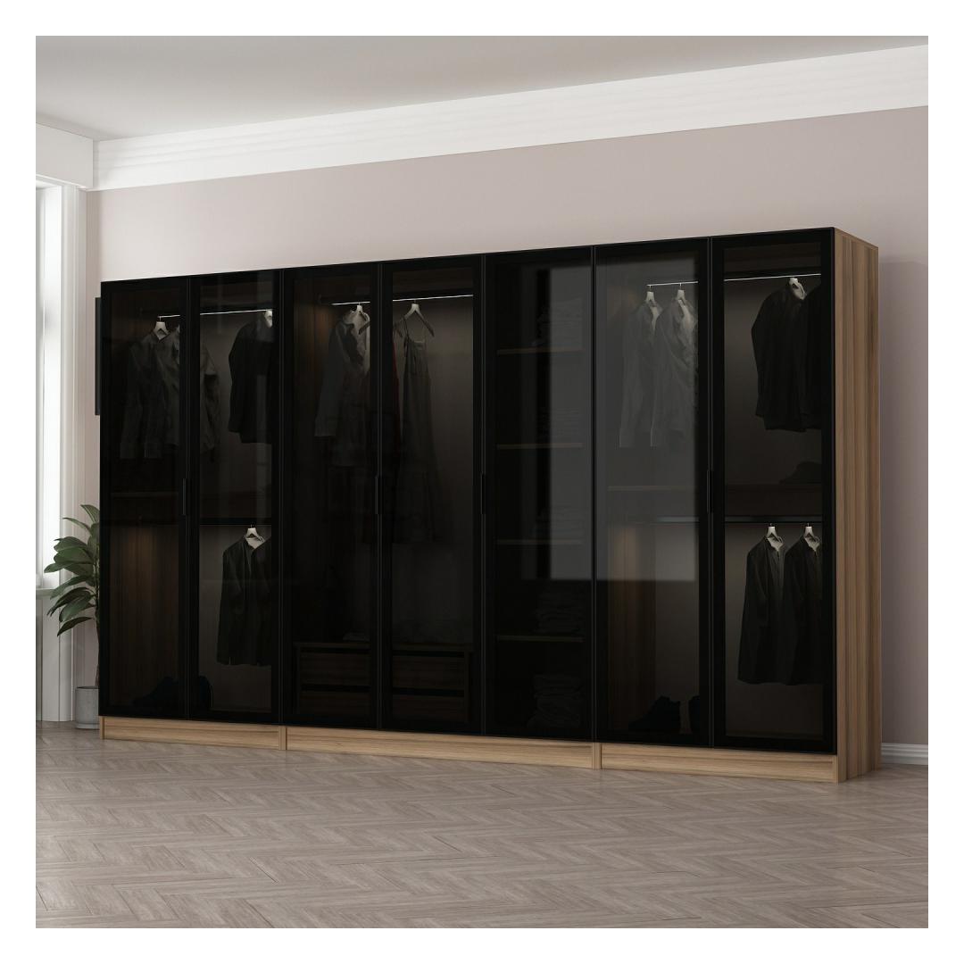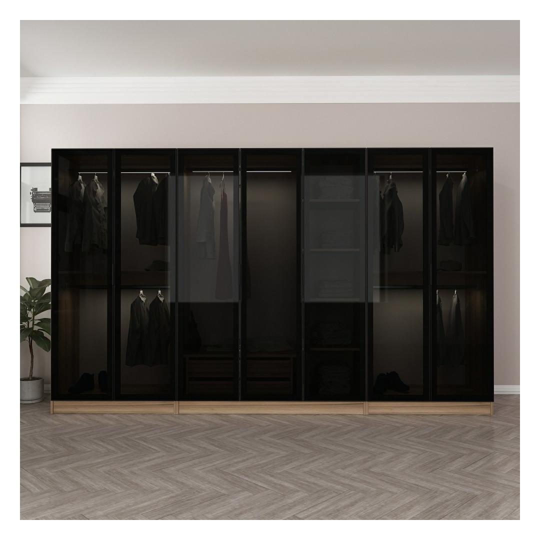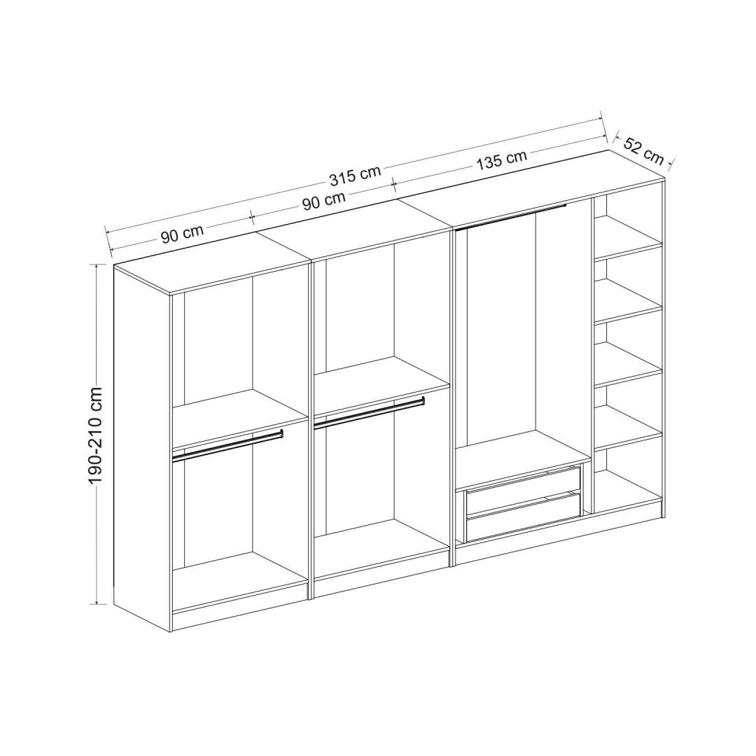 With a width of 315 cm, height of 210 cm, and depth of 52 cm, this wardrobe offers ample storage space for all your clothing, shoes, and accessories. The numerous shelves provide plenty of room for organizing your belongings, making it easy to find what you need when you need it.