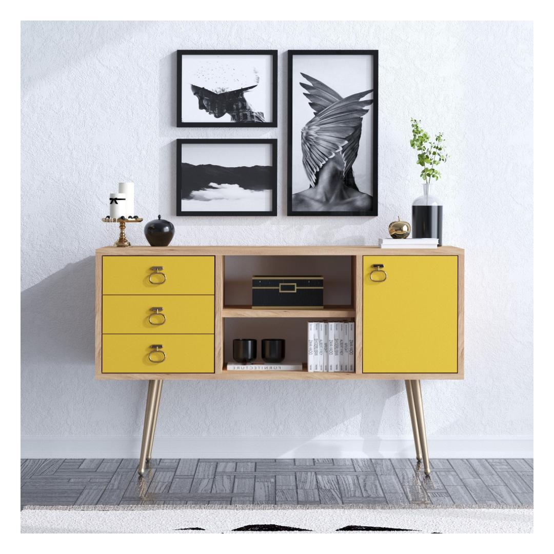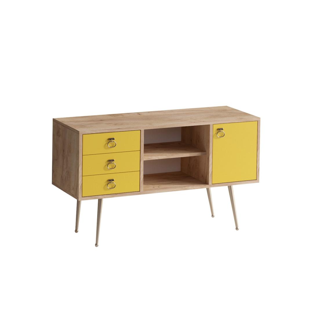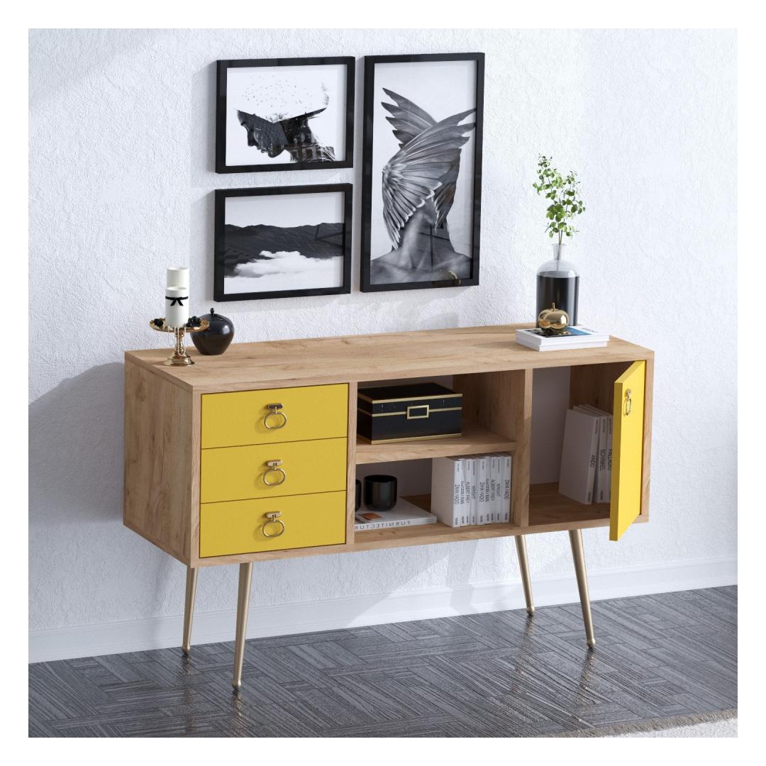With its sleek and contemporary design, our sideboard adds a touch of elegance to any room. The combination of oak and yellow colors creates a striking visual appeal, making it a focal point in your space.