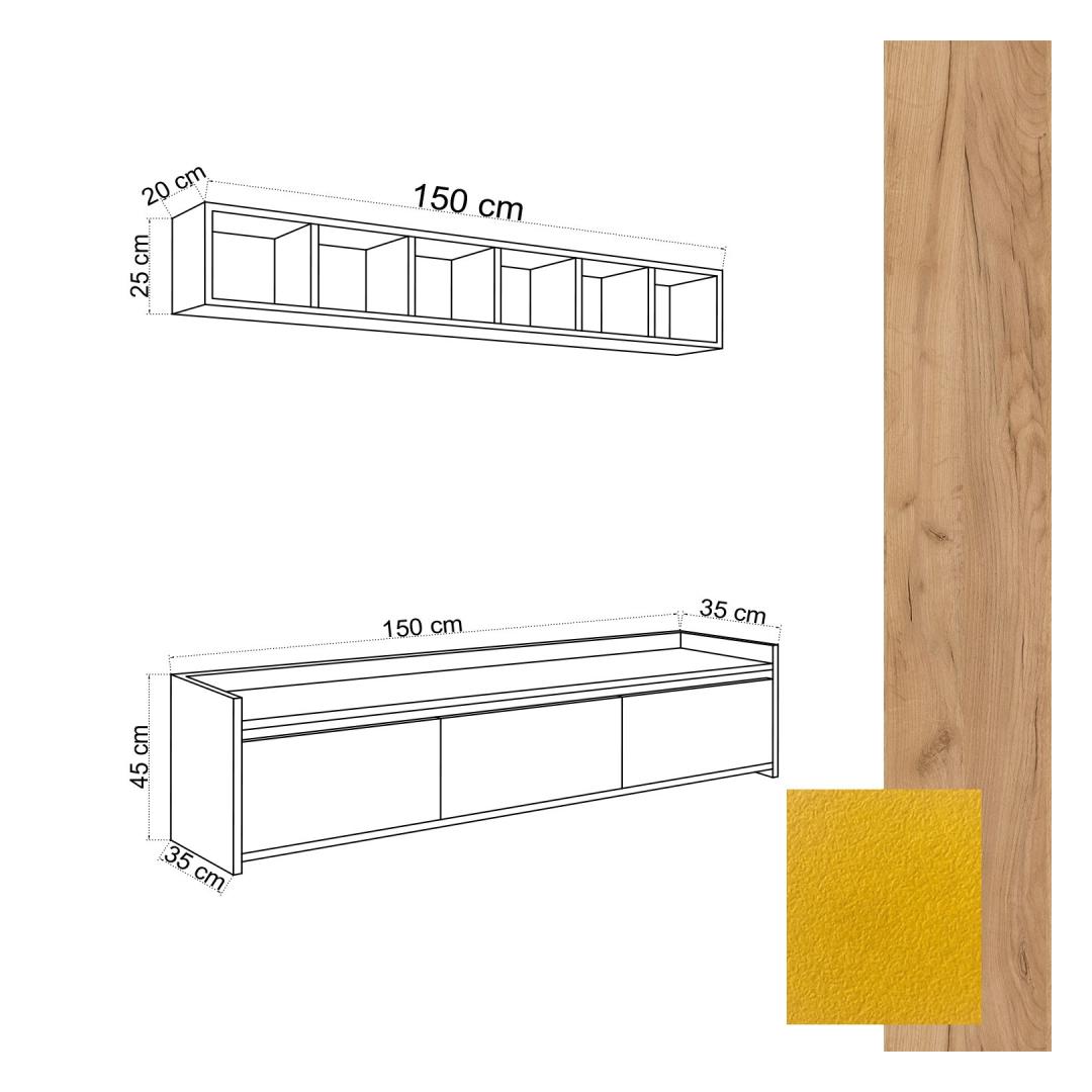 The top module of the unit measures 150 cm in width, 45 cm in height, and 35 cm in depth, while the bottom module measures 150 cm in width, 25 cm in height, and 20 cm in depth. This versatile design allows you to fit it perfectly in any corner of your living room.