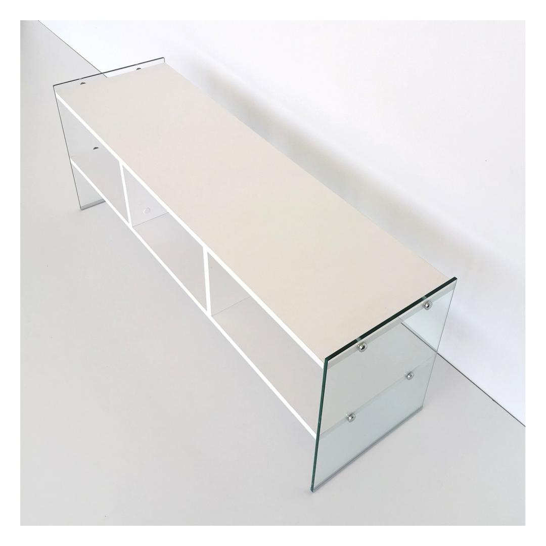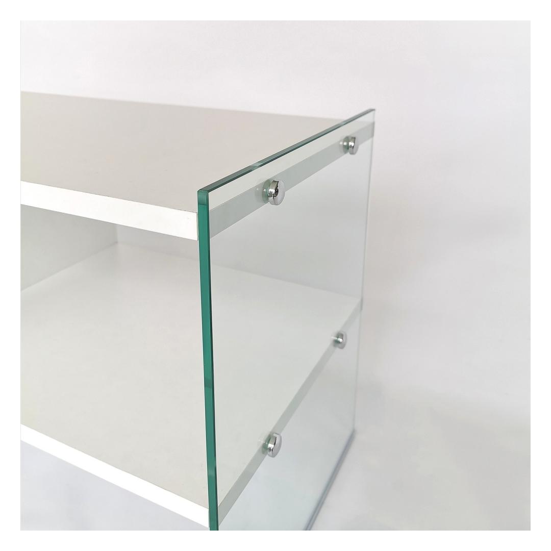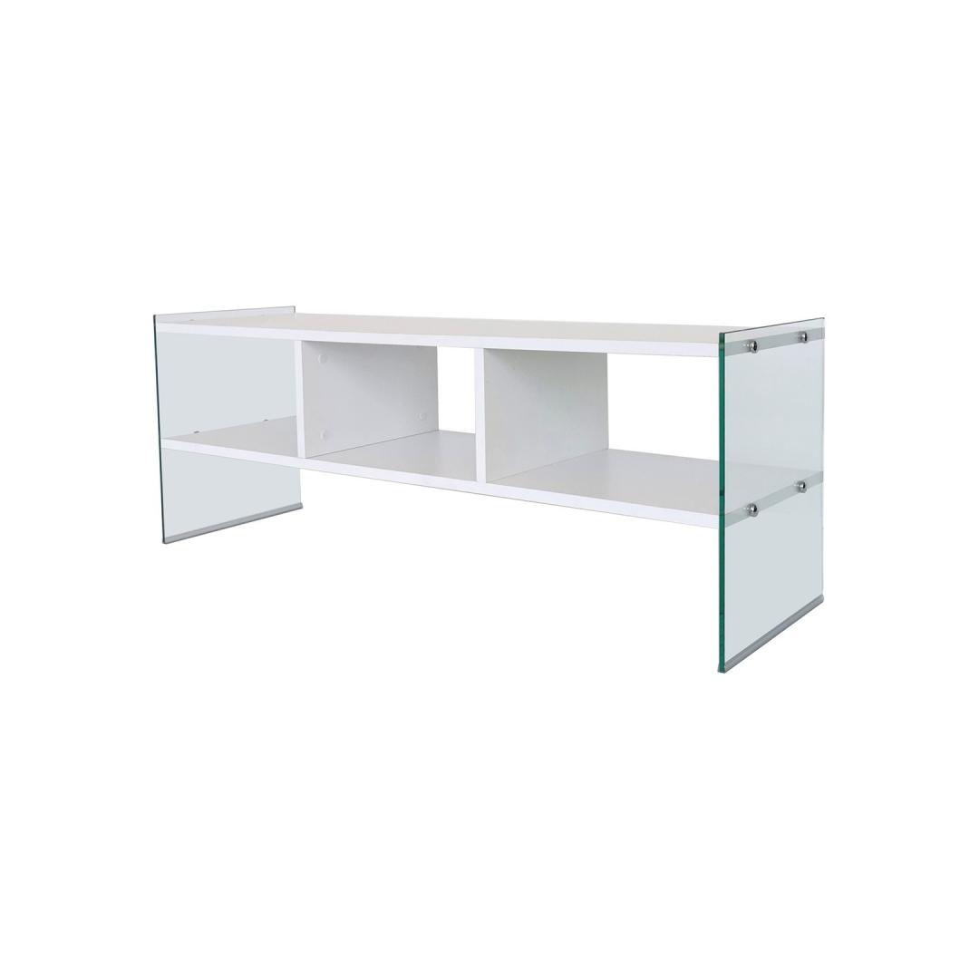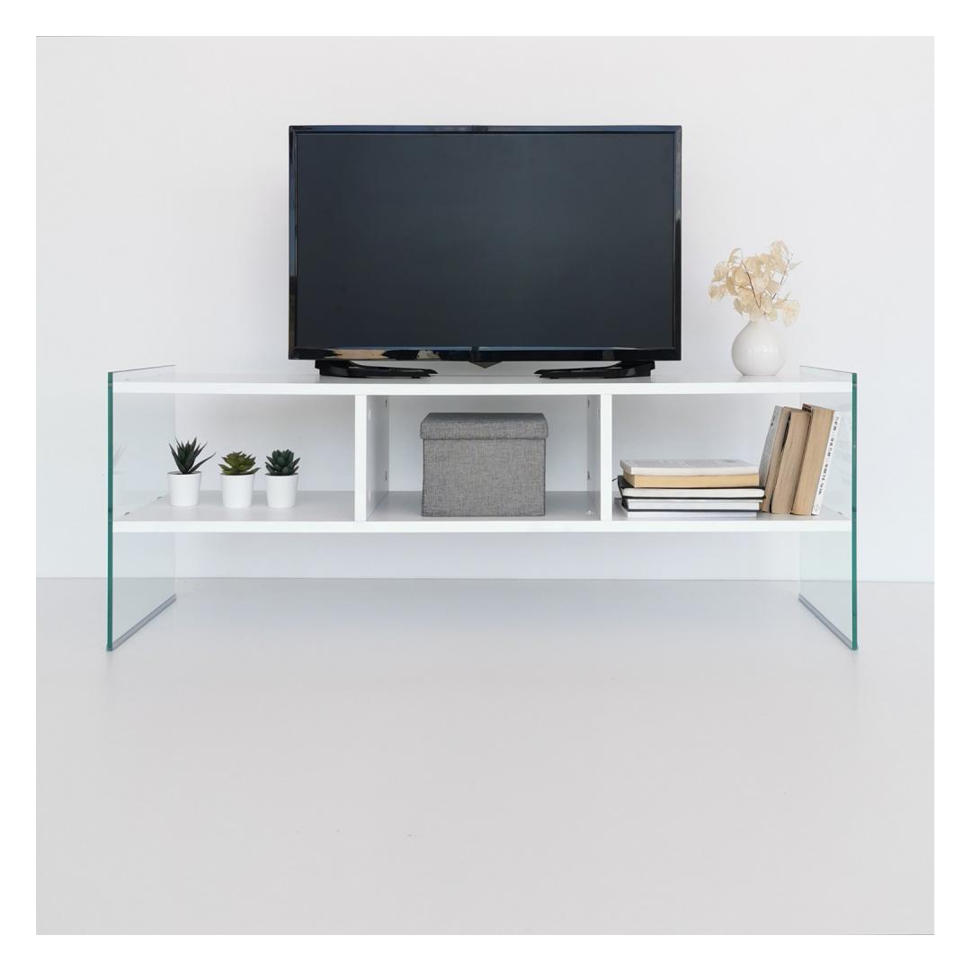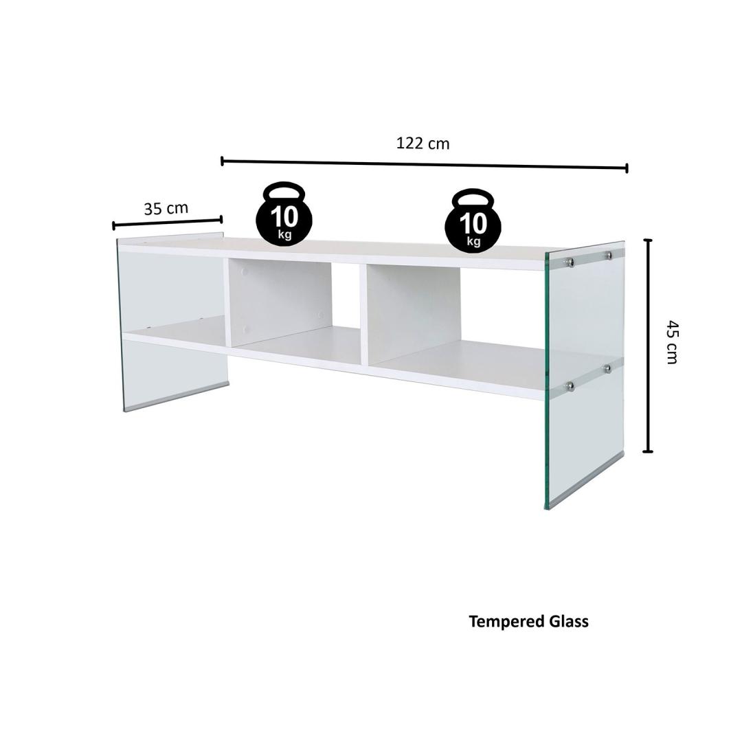 Crafted from 100% melamine coated particle board, this TV stand is built to last. The 8 mm thickness ensures sturdiness and stability, providing a reliable platform for your television and other media devices. The frame is made from 100% tempered glass, adding a touch of elegance and ensuring safety.