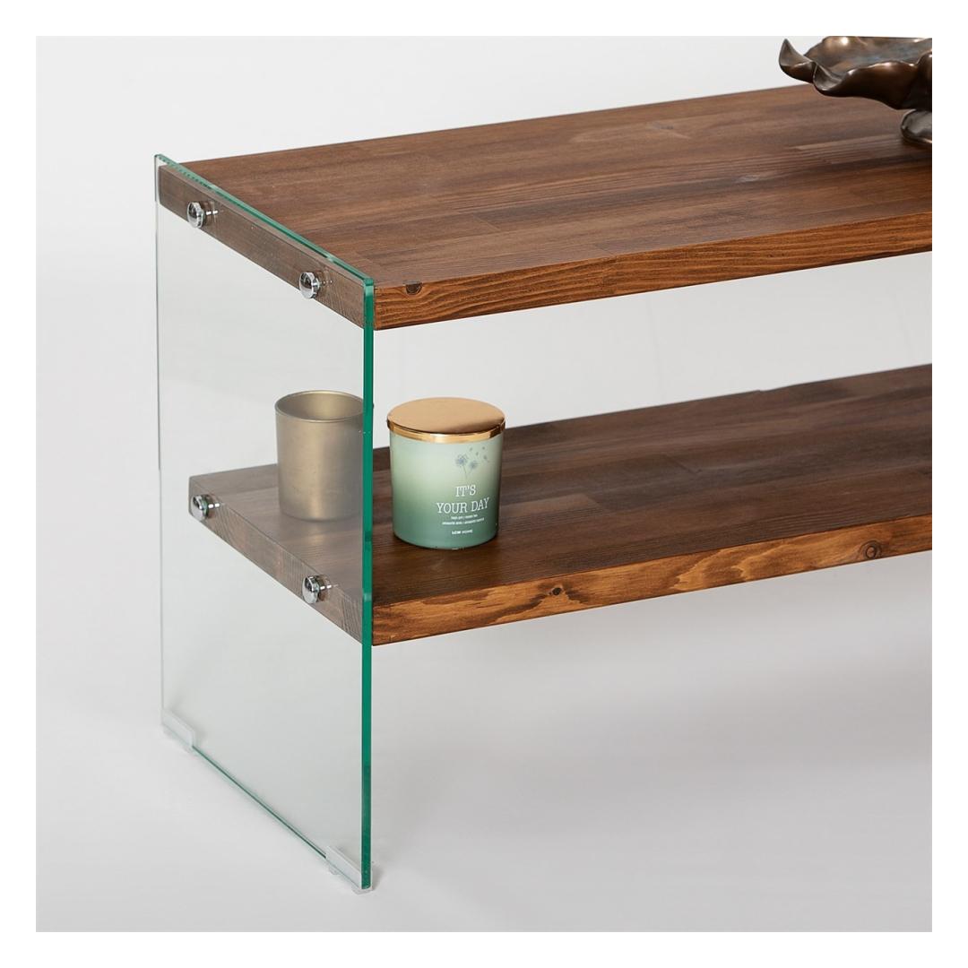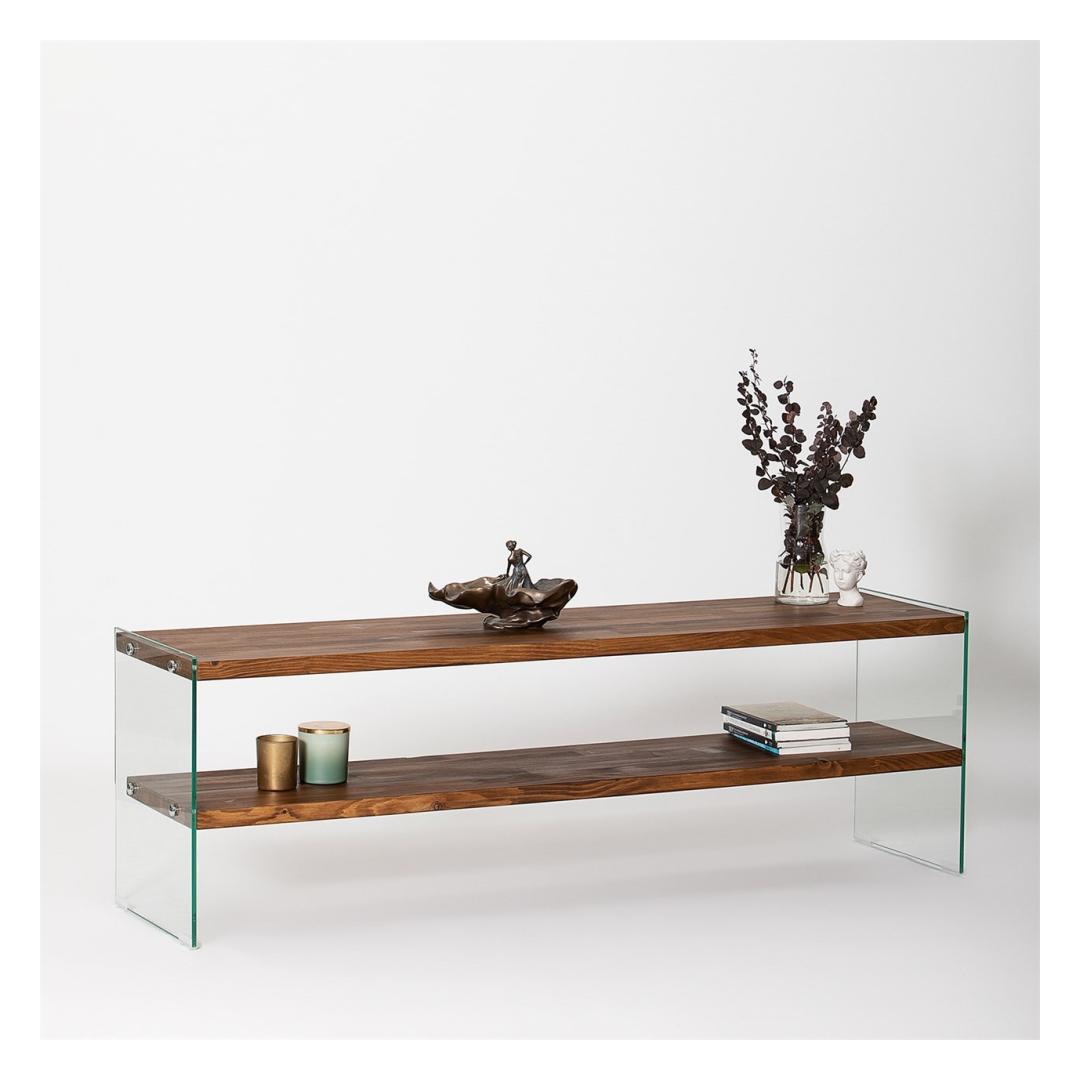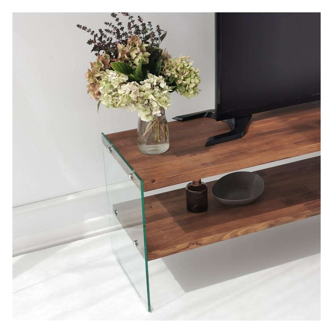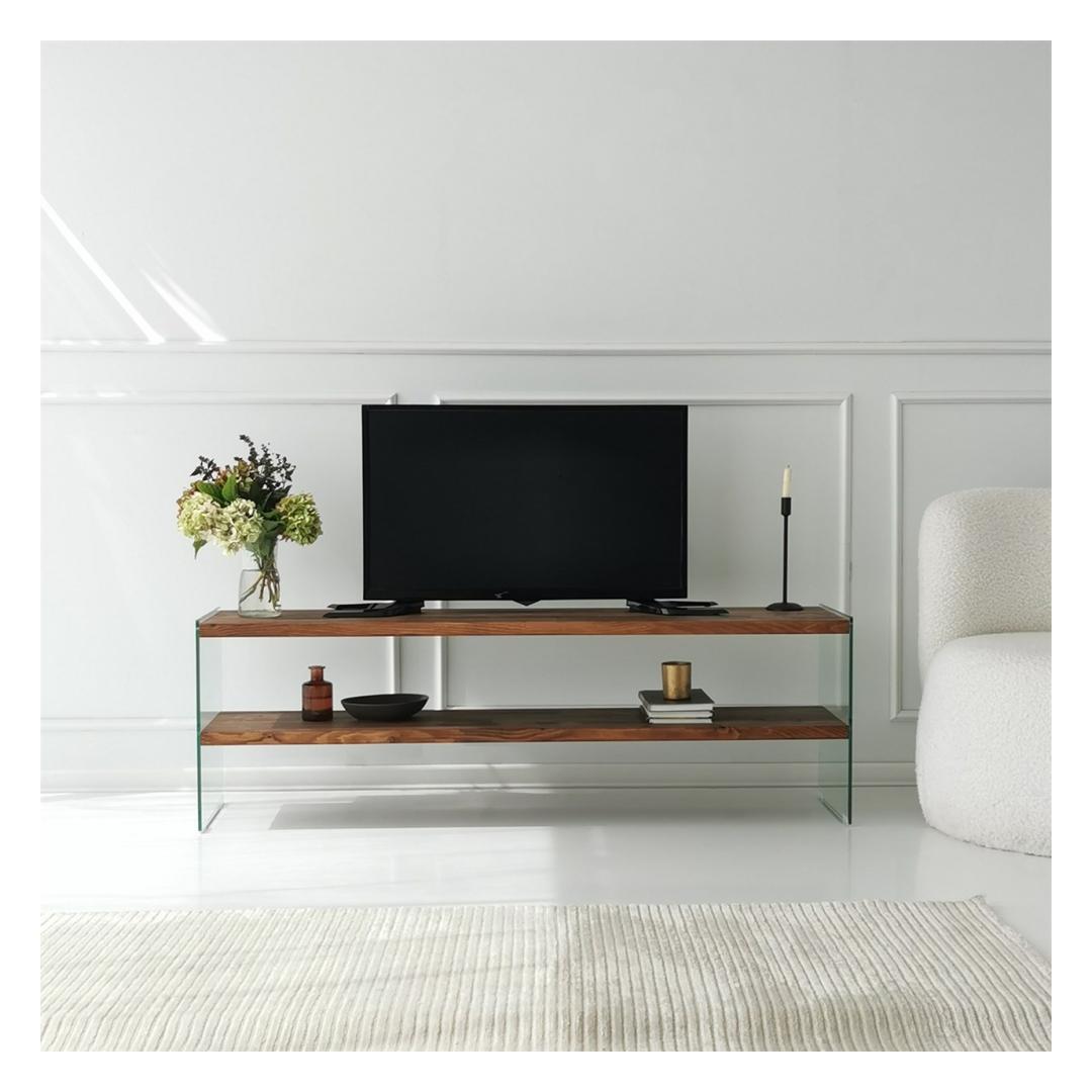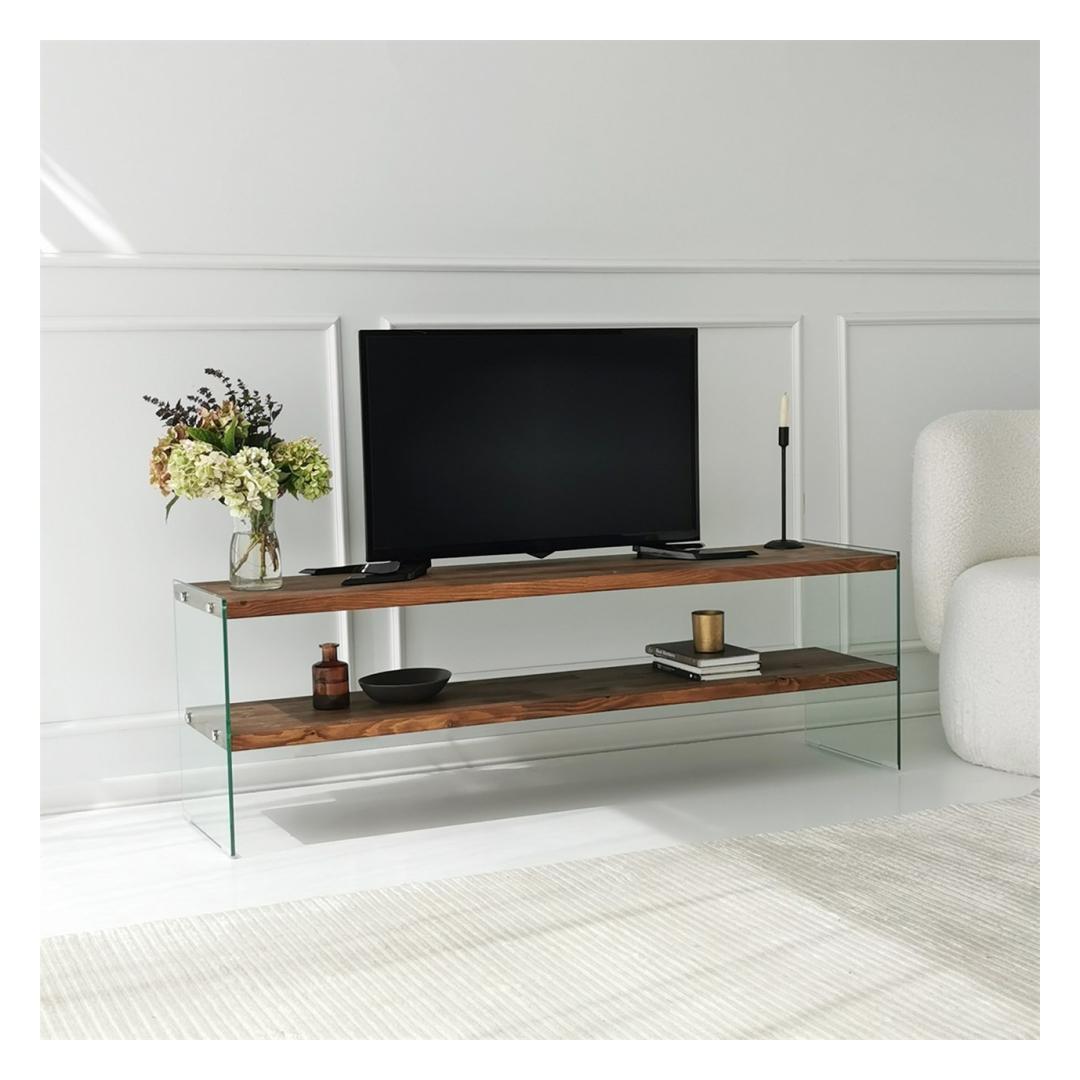 Transform your living room into a stylish and sophisticated space with our stunning TV stand. Crafted with 100% tempered glass and a solid wood frame, this piece exudes elegance and durability. The natural color adds a touch of warmth to any room, creating a cozy and inviting atmosphere for you and your loved ones to enjoy.