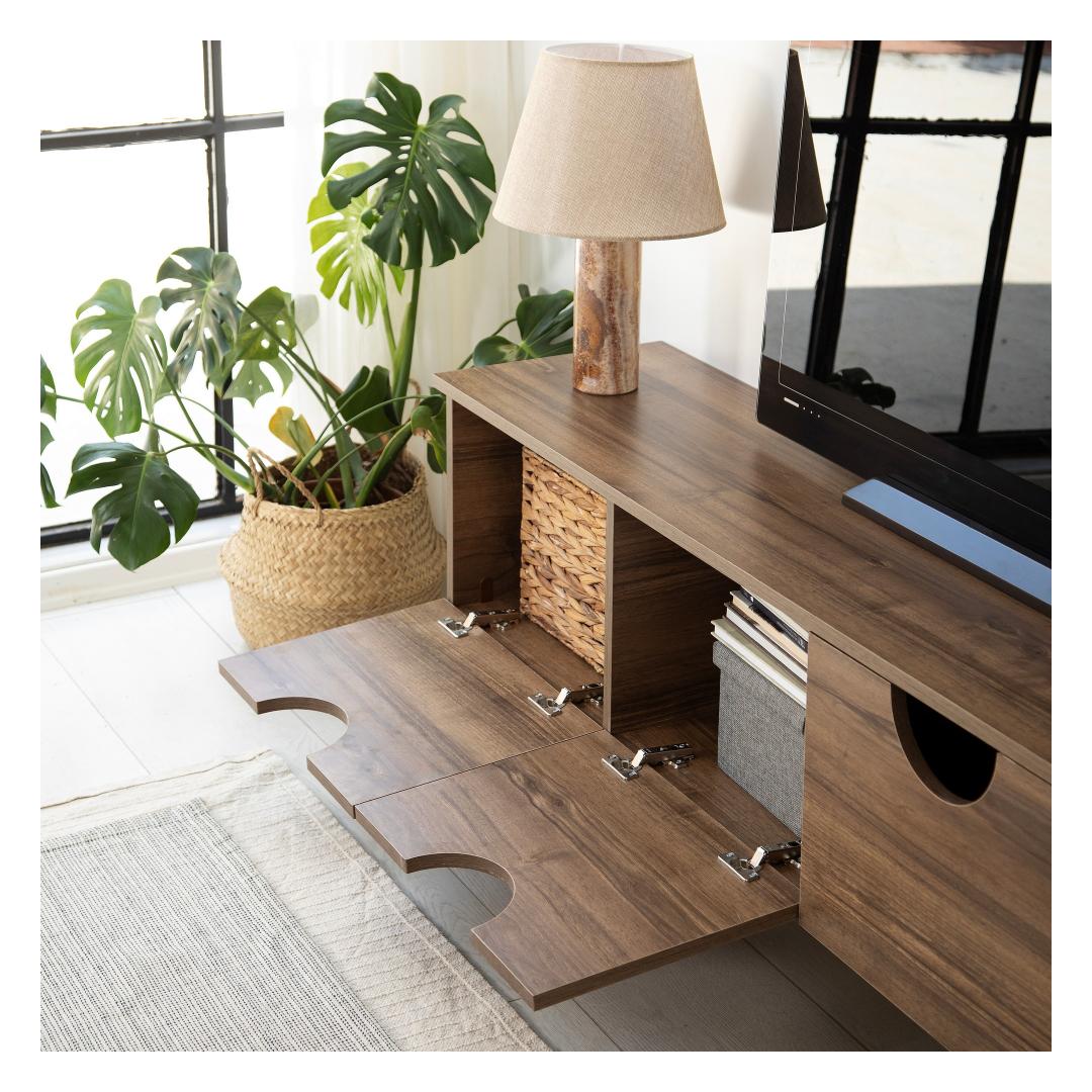 The TV Stand features a beautiful walnut color, adding a touch of sophistication to any room. The rich tones and natural wood grain create a warm and inviting atmosphere, making it the perfect addition to your home decor.