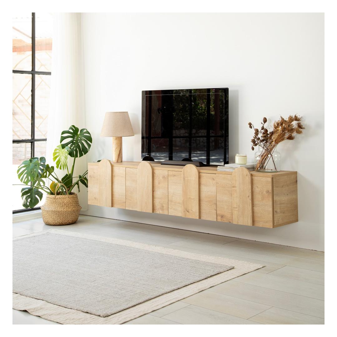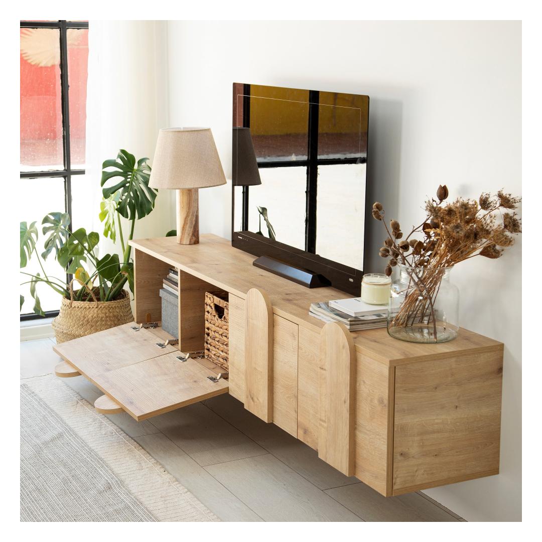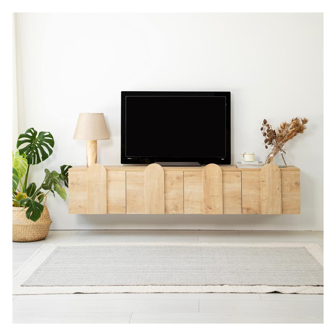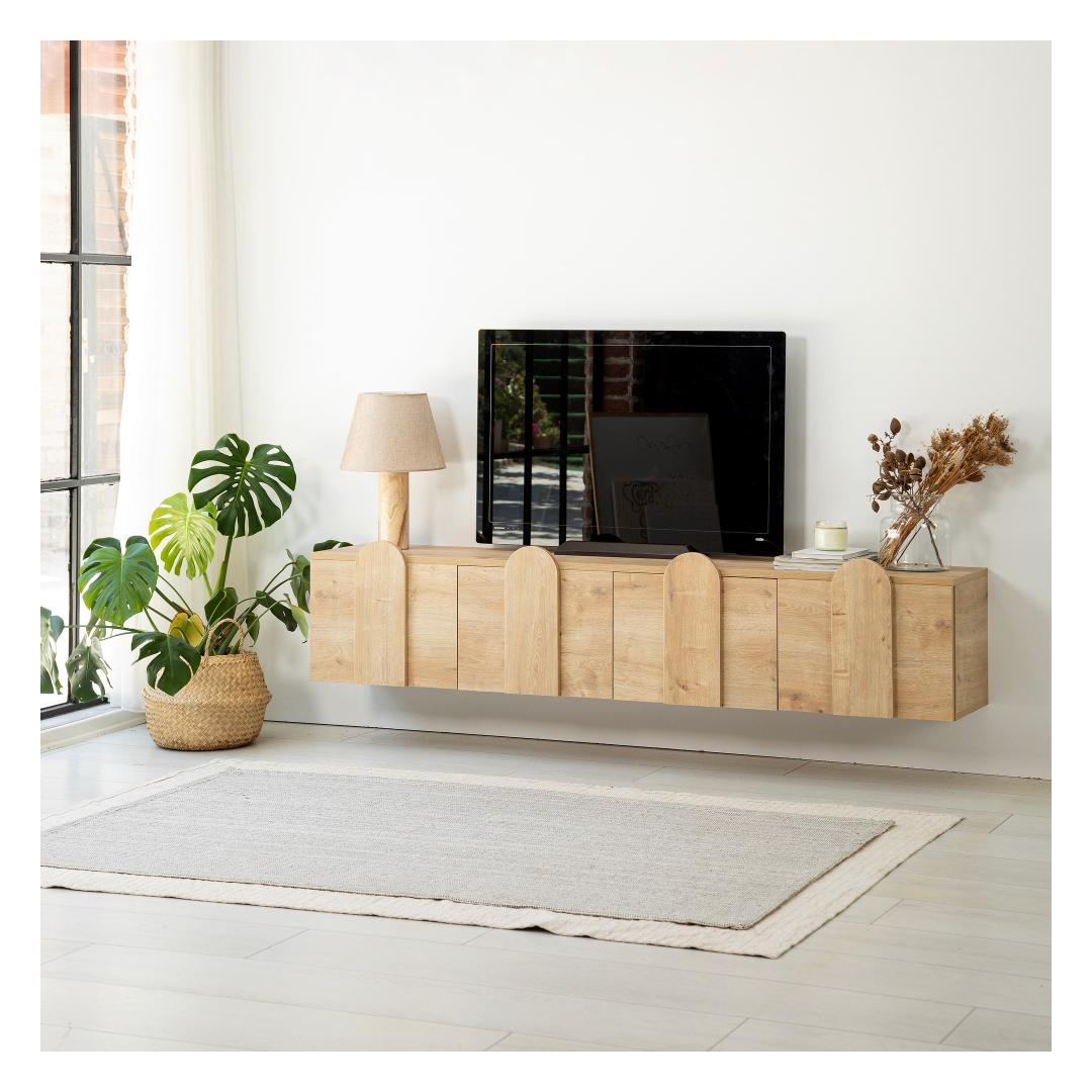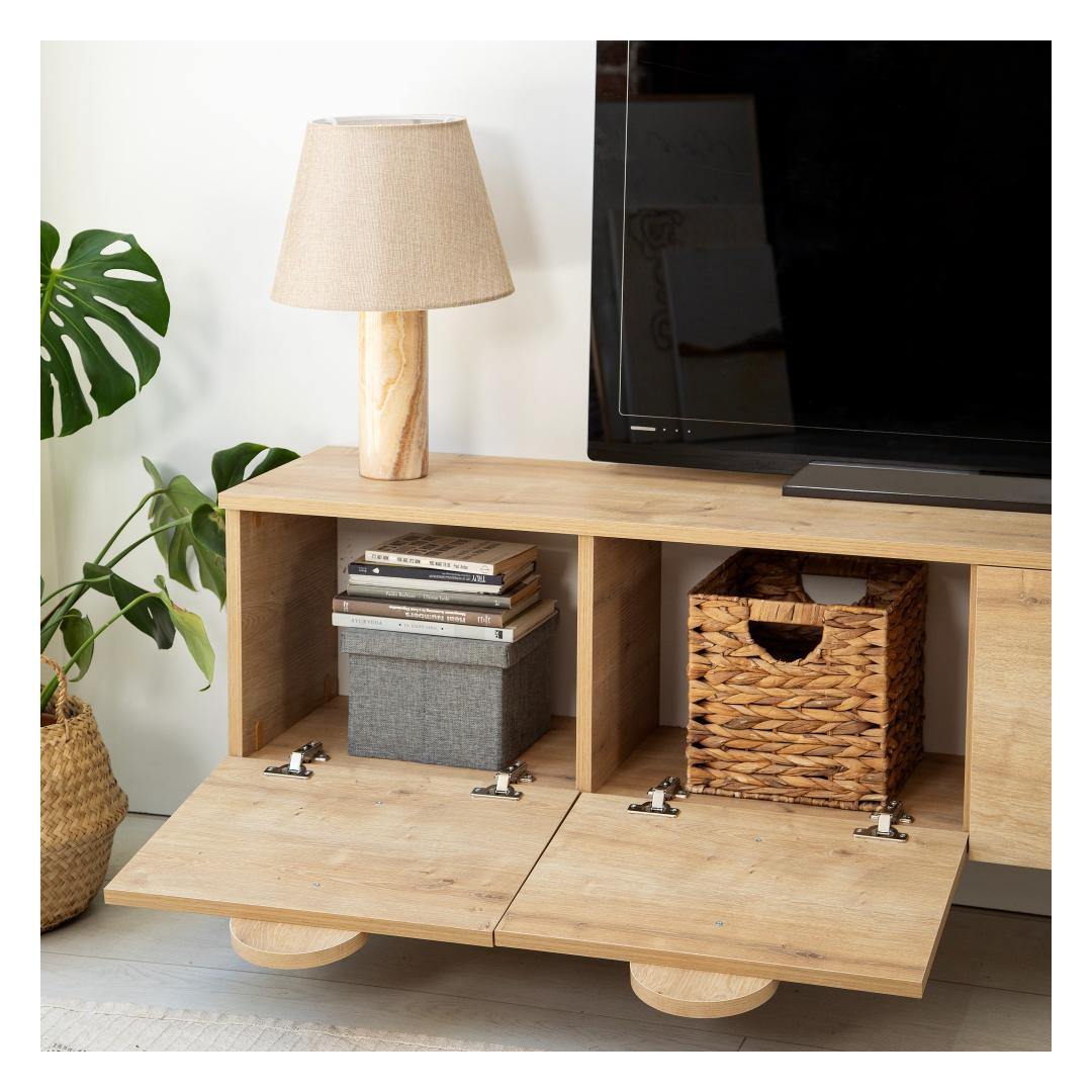 With its sleek and modern design, this TV stand adds a touch of sophistication to any room. The oak color adds warmth and elegance, making it the perfect addition to your home decor. Its spacious surface can accommodate TVs up to 180 cm, providing you with an immersive viewing experience.