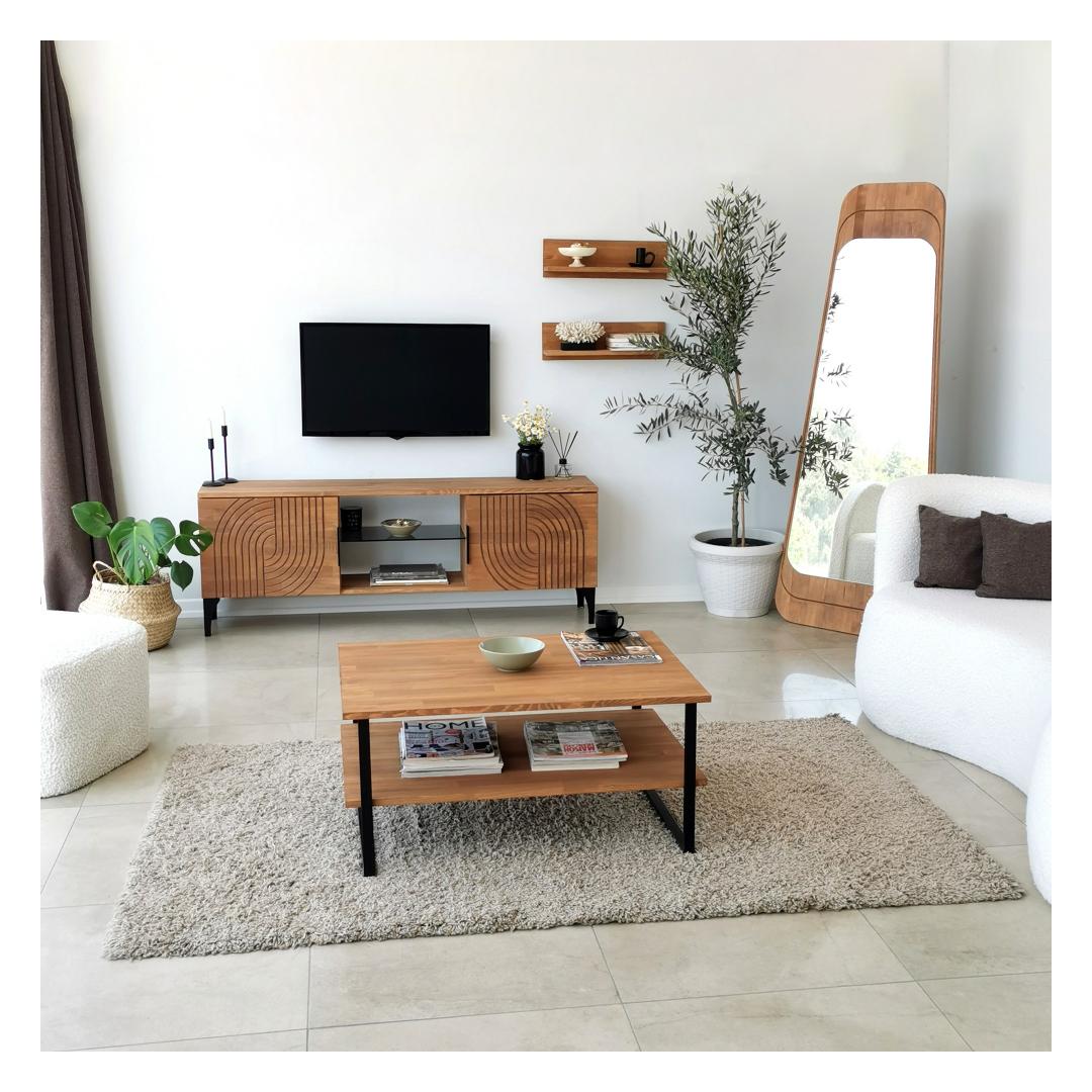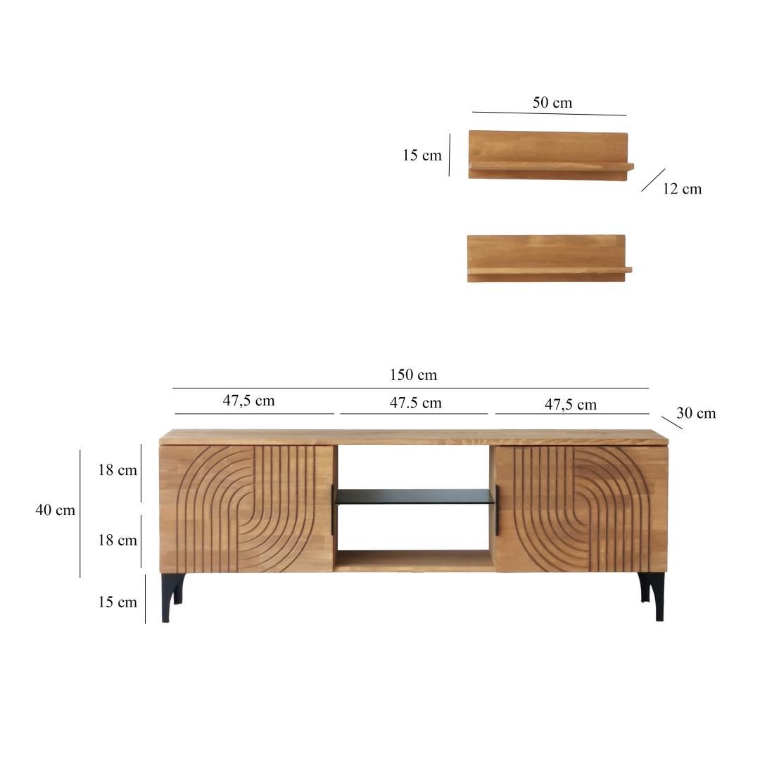 Featuring two spacious shelves, our TV unit provides ample storage for your media devices, books, and decor items. The shelf size of 50 cm width, 15 cm height, and 12 cm depth allows you to neatly organize your belongings, keeping your living room tidy and organized.