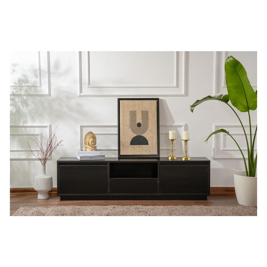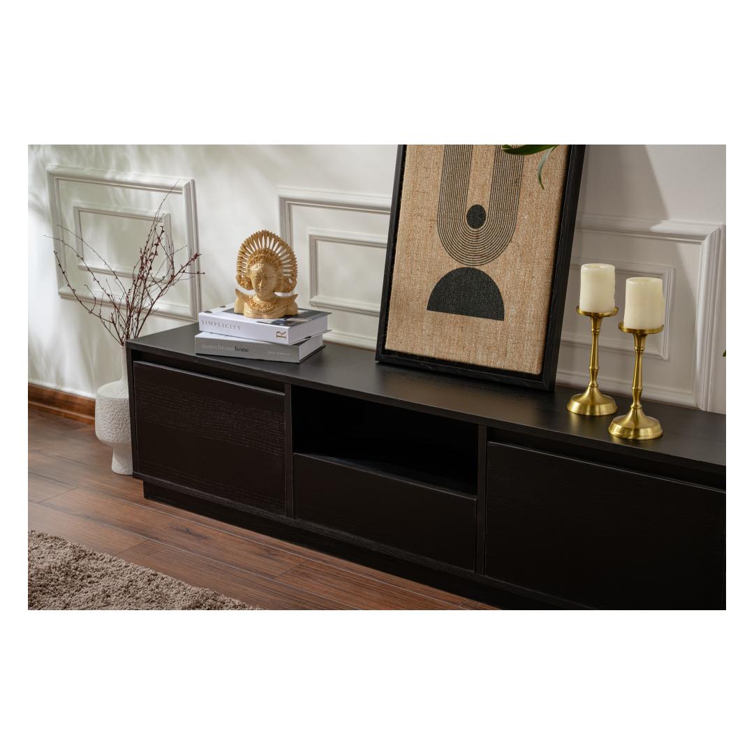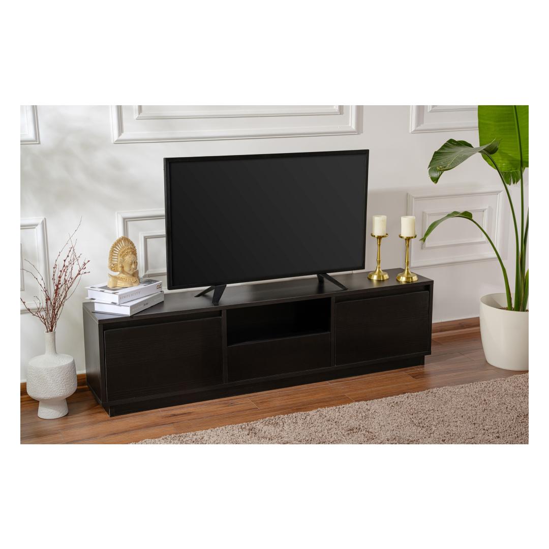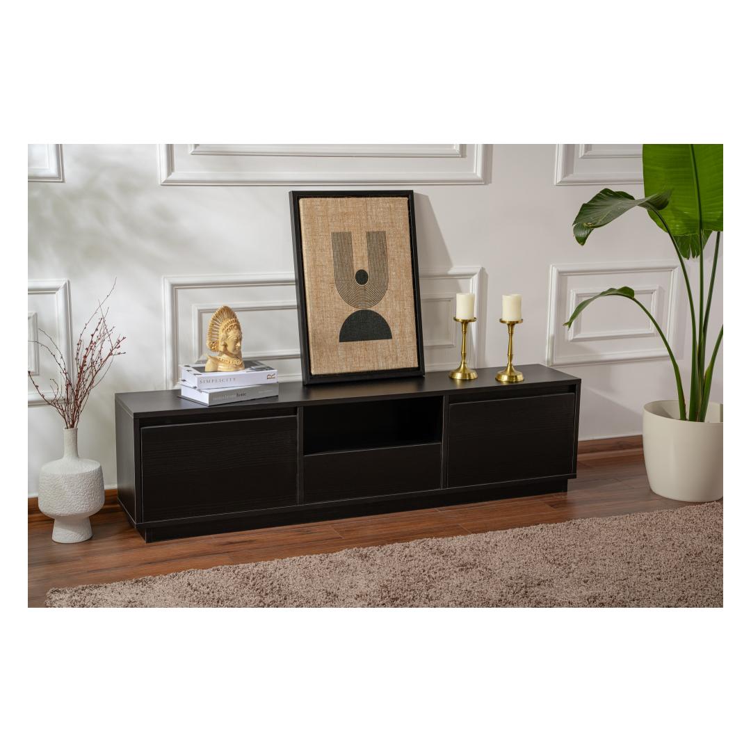 Elevate your living room with our stunning TV stand in Wood Black color. This sleek and modern piece will instantly upgrade the look of your entertainment area, adding a touch of sophistication and style.