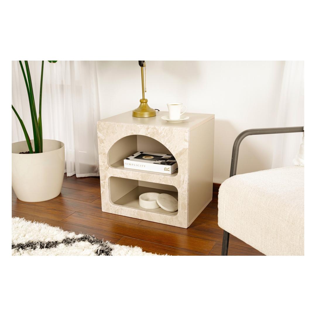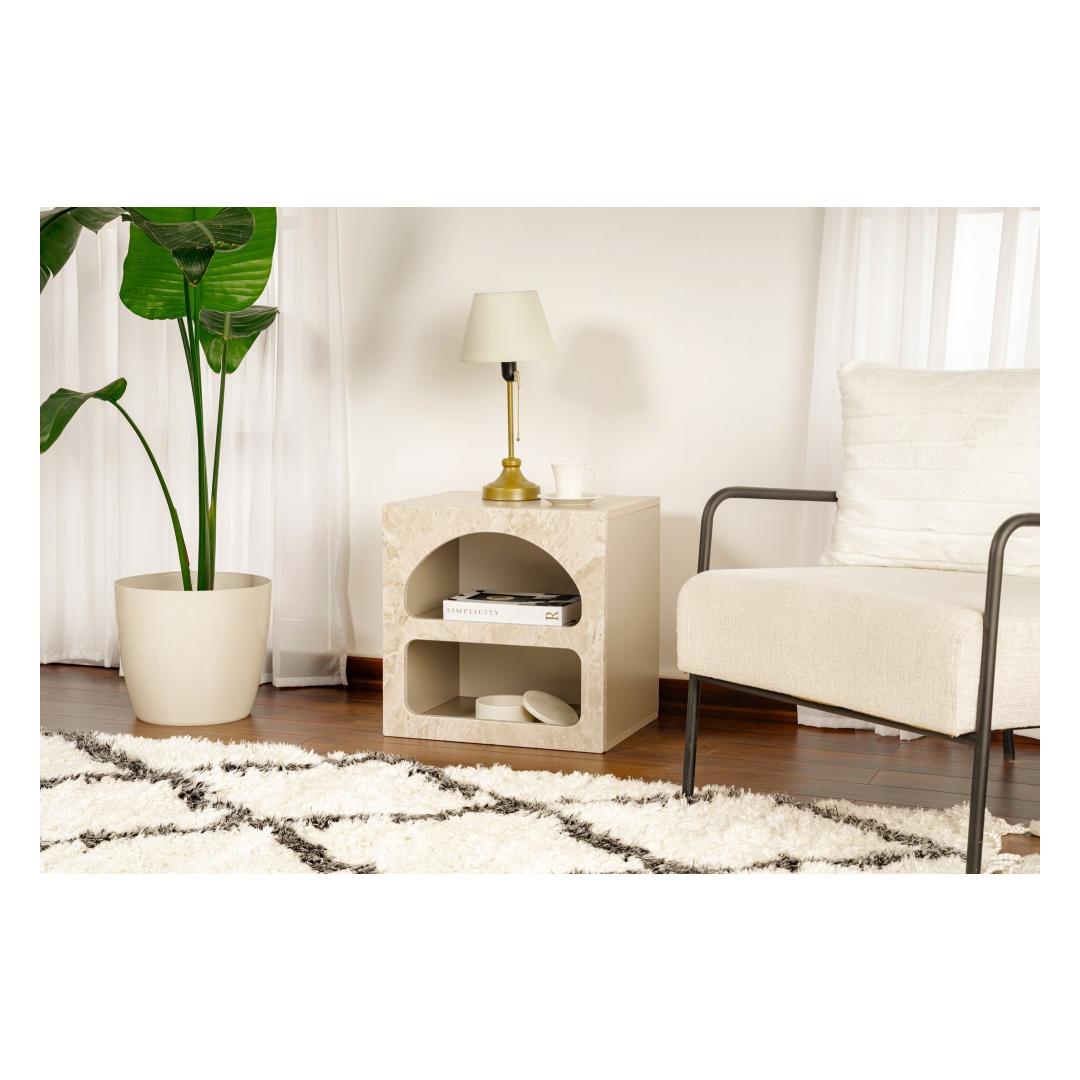 The Traverten Marble Nightstand is crafted from 100% melamine coated particle board, ensuring durability and longevity. The sleek marble finish in a beautiful sandstone color adds a luxurious touch to the piece, making it a standout feature in any room.