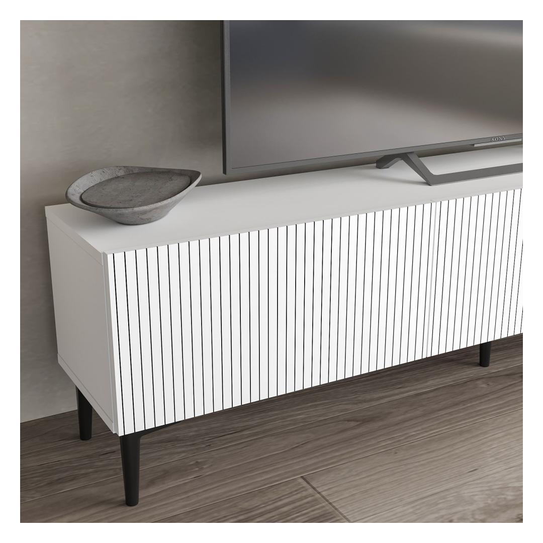Say goodbye to cluttered and outdated TV stands. Our TV stand features a contemporary design that will seamlessly blend with any decor style. The crisp white color adds a touch of elegance and sophistication to your space, while the 18 mm thickness ensures stability and sturdiness.